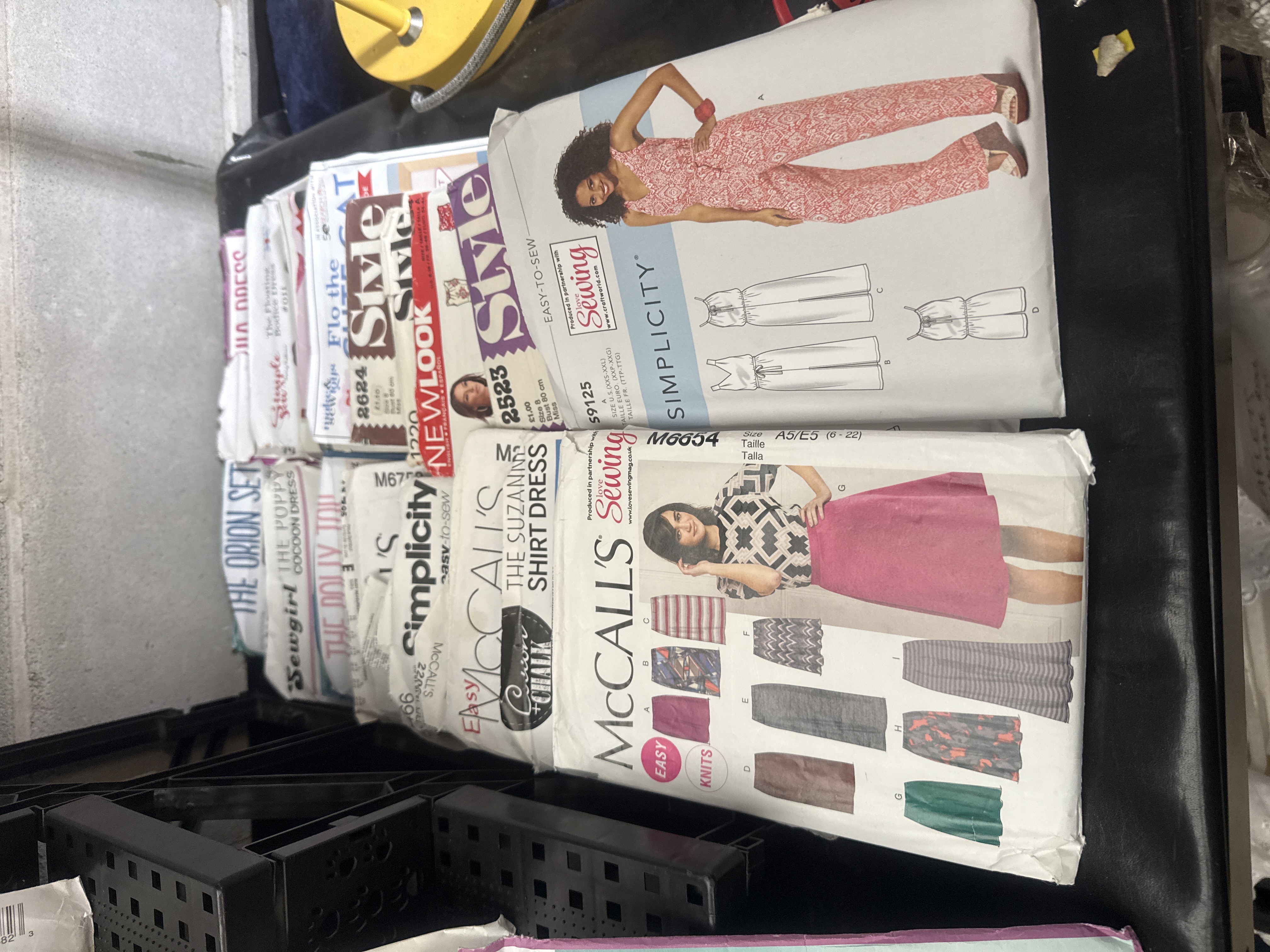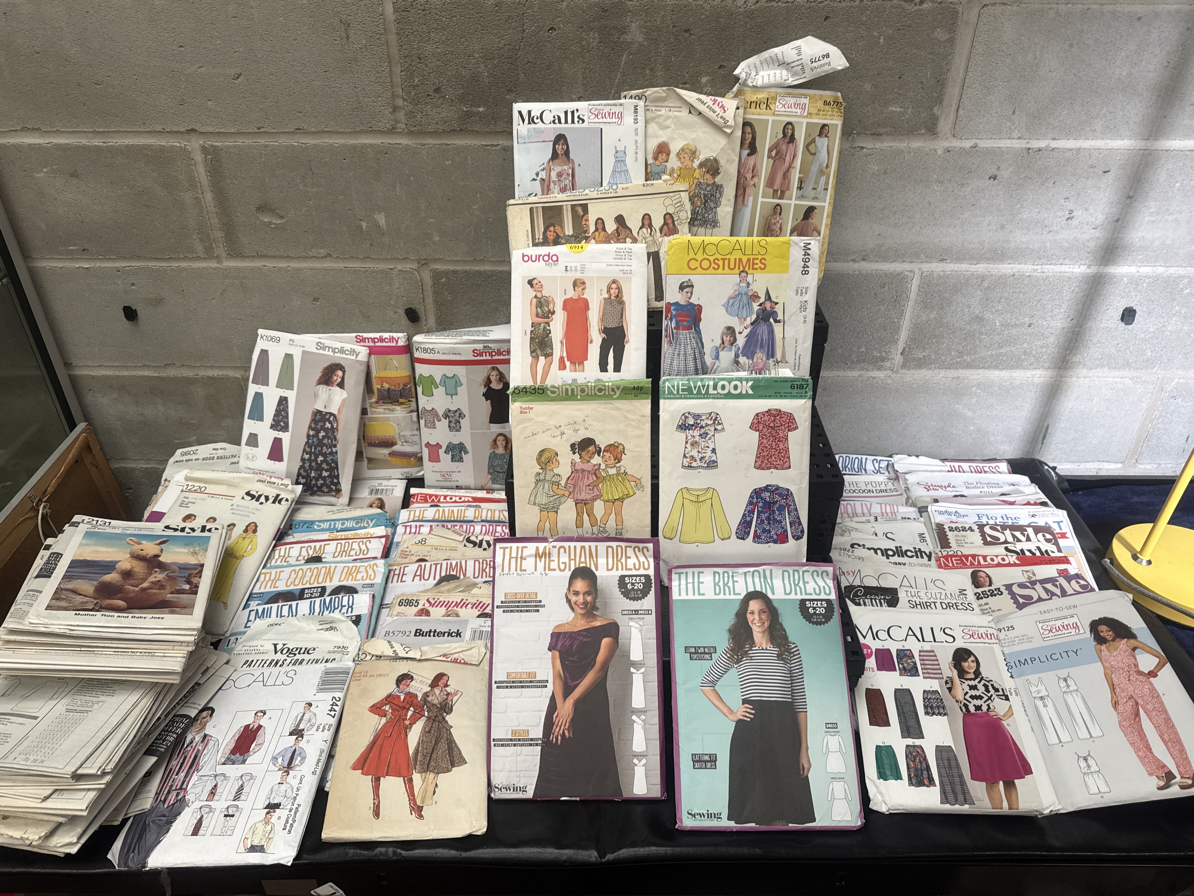 A collection of 93 paper sewing patterns from various manufacturers and eras. The assortment includes brands such as McCall’s, Simplicity, New Look, Style, Burda, Vogue, Butterick, and Love Sewing. The lot covers a wide range of garment types, including women’s dresses, skirts, tops, men’s apparel, children’s clothing, and specialized items such as costumes and a Mother ‘Roo and Baby Joey stuffed animal pattern. Notable contemporary patterns from Simply Sewing include The Meghan Dress and The Breton Dress. The collection spans several decades, featuring both vintage-style illustrations and contemporary photographic covers. The paper envelopes display various pattern numbers, size ranges, and occasional handwritten markings.