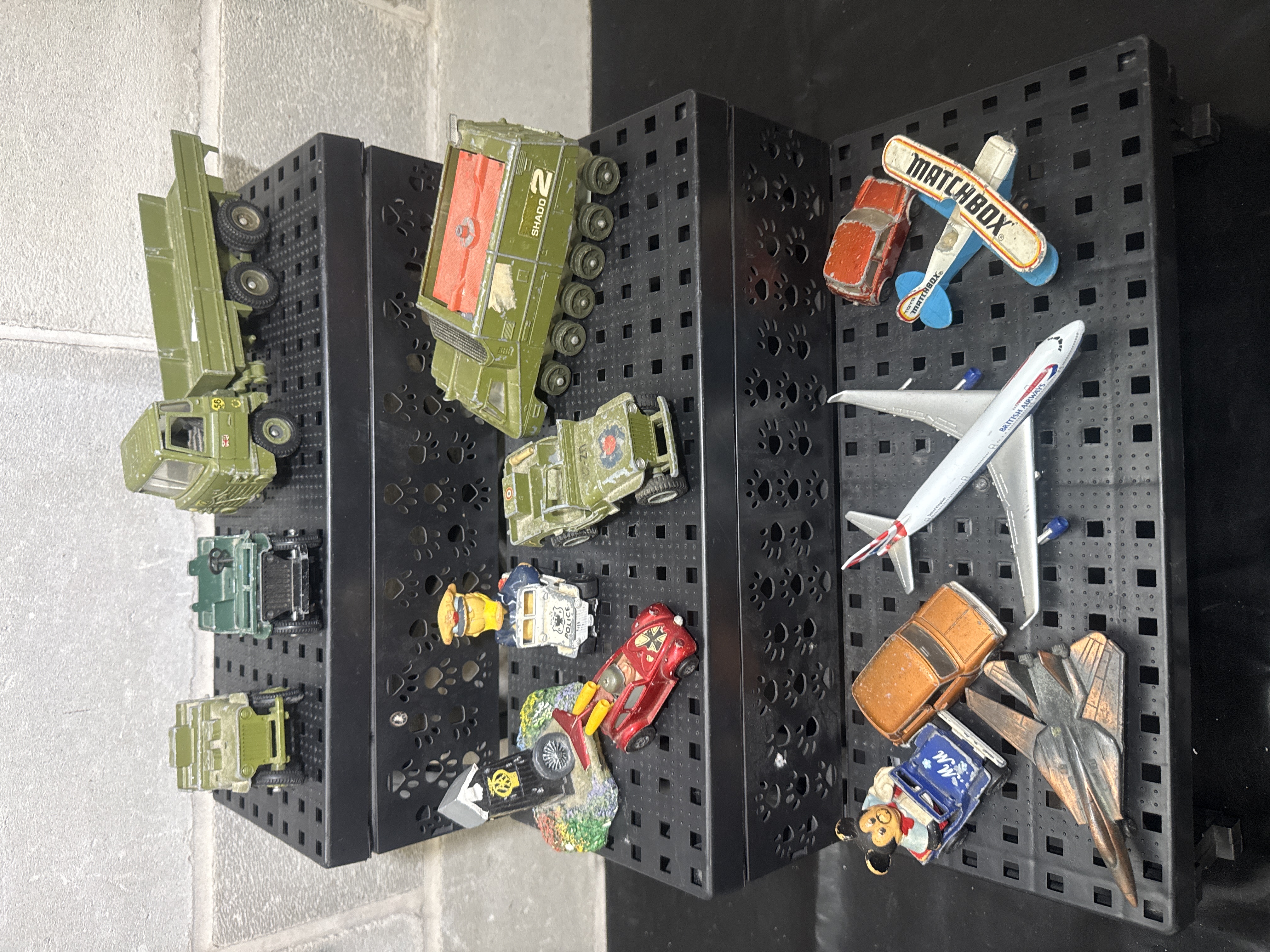 A collection of vintage die-cast metal and plastic models featuring examples from Dinky and Matchbox. The group includes military vehicles such as a SHADO 2 mobile unit and several transport trucks in olive drab. Aviation models consist of a commercial jet with British Airways livery, a fighter jet, and a propeller plane with Matchbox branding. The lot also contains several die-cast cars in various colors, a Mickey Mouse character figure in a vehicle, and a miniature diorama element. The collection is presented on three tiered black plastic display stands.