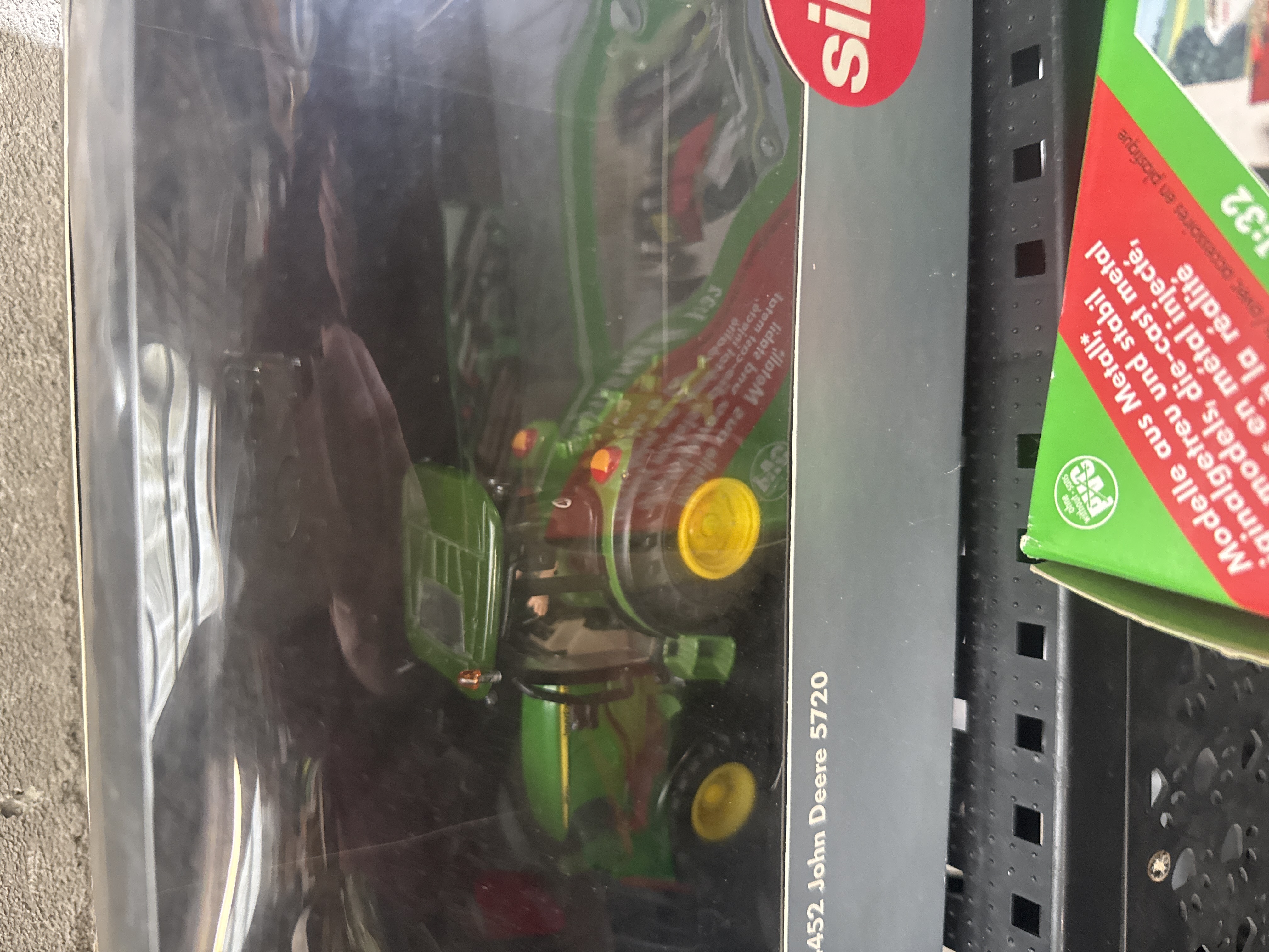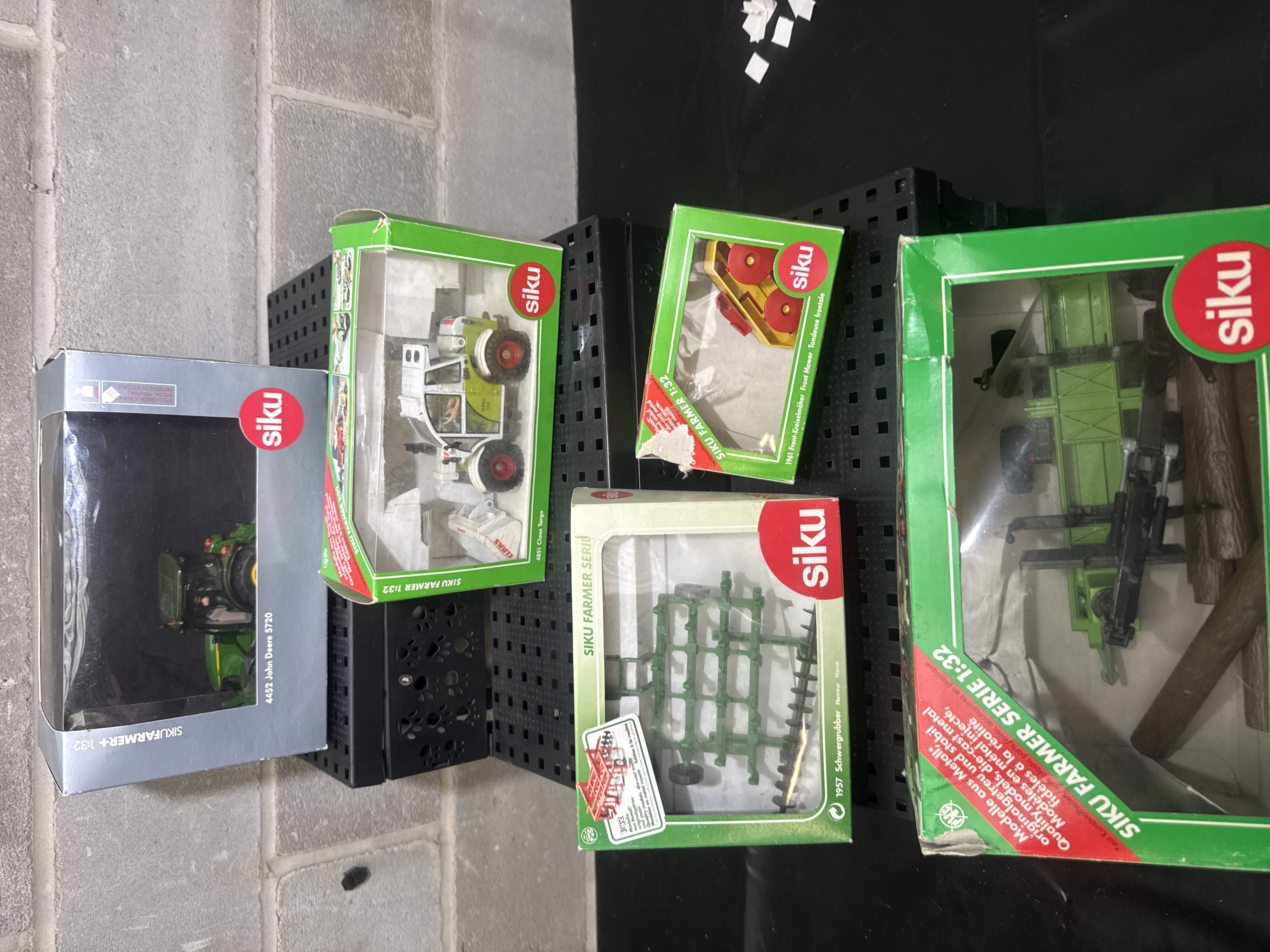 A collection of Siku Farmer series die-cast metal and plastic farm models in 1:32 scale. The group includes a 4452 John Deere 5720 tractor, a 4851 Claas Targo telehandler, a 1961 Front-Kreiselmaher (front mower), a 1957 Schwergrubber (heavy-duty harrow), and a forestry-themed implement with log accessories. Each model is presented in its original retail window packaging featuring German and French text. The models are constructed with die-cast metal bodies and plastic components.