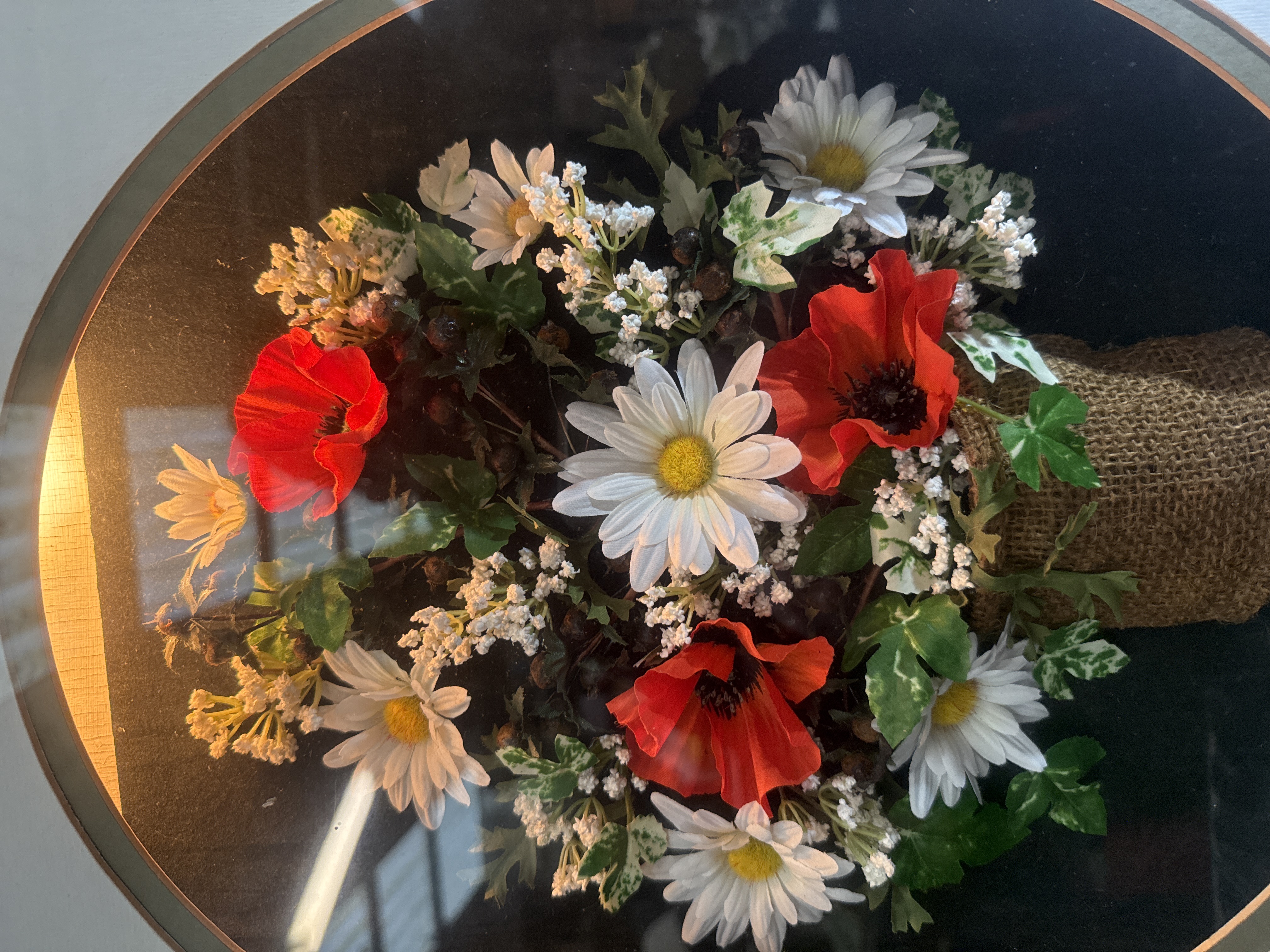 A vintage illuminated shadow box featuring a three-dimensional mixed floral arrangement. The display consists of white daisies, red anemone-style blossoms, and variegated greenery, partially wrapped in a burlap textile. The arrangement is set against a dark background within an oval-cut off-white mat. The piece is housed in a molded wood frame with a mahogany-toned finish and a gold-tone inner fillet. A brass-toned bail handle is mounted to the side of the frame. The item contains an internal light source powered by an attached electrical cord. Inventory stickers marked 17566 are present on the matting.