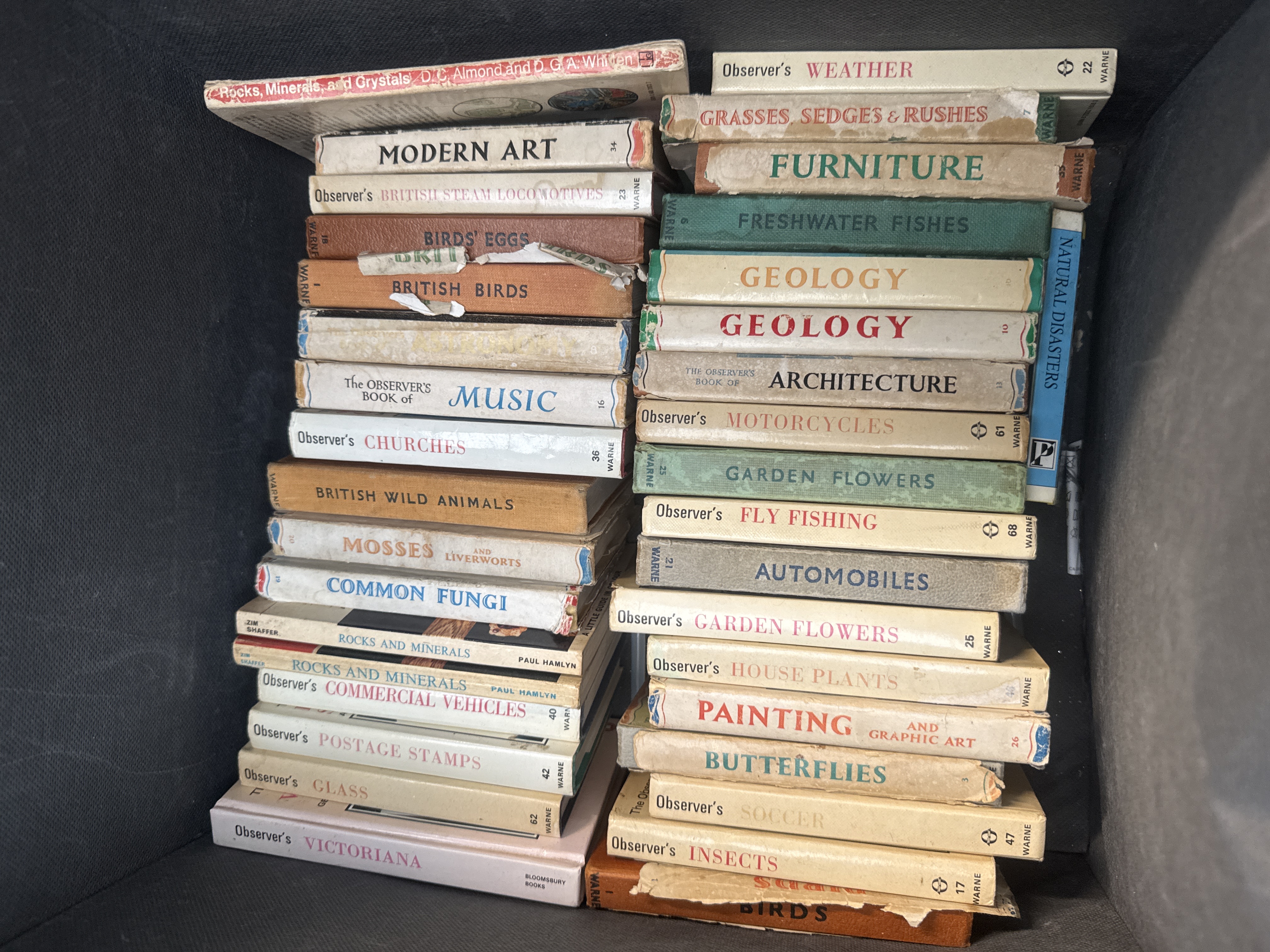 A collection of vintage small-format reference books, primarily comprising titles from The Observer’s series published by Frederick Warne and Co. The group includes various subjects such as British Birds, Geology, Architecture, Automobiles, Modern Art, Postage Stamps, and Victoriana. Other publishers represented include Paul Hamlyn and Bloomsbury Books. The volumes are constructed with cloth or paper-covered boards, many retaining their original illustrated dust jackets. Specific titles visible include Weather, Furniture, Freshwater Fishes, Geology, Architecture, Motorcycles, Garden Flowers, Fly Fishing, Automobiles, House Plants, Painting and Graphic Art, Butterflies, Soccer, Insects, Birds, Modern Art, British Steam Locomotives, Birds Eggs, British Birds, Music, Churches, British Wild Animals, Mosses and Liverworts, Common Fungi, Rocks and Minerals, Commercial Vehicles, Postage Stamps, Glass, and Victoriana.