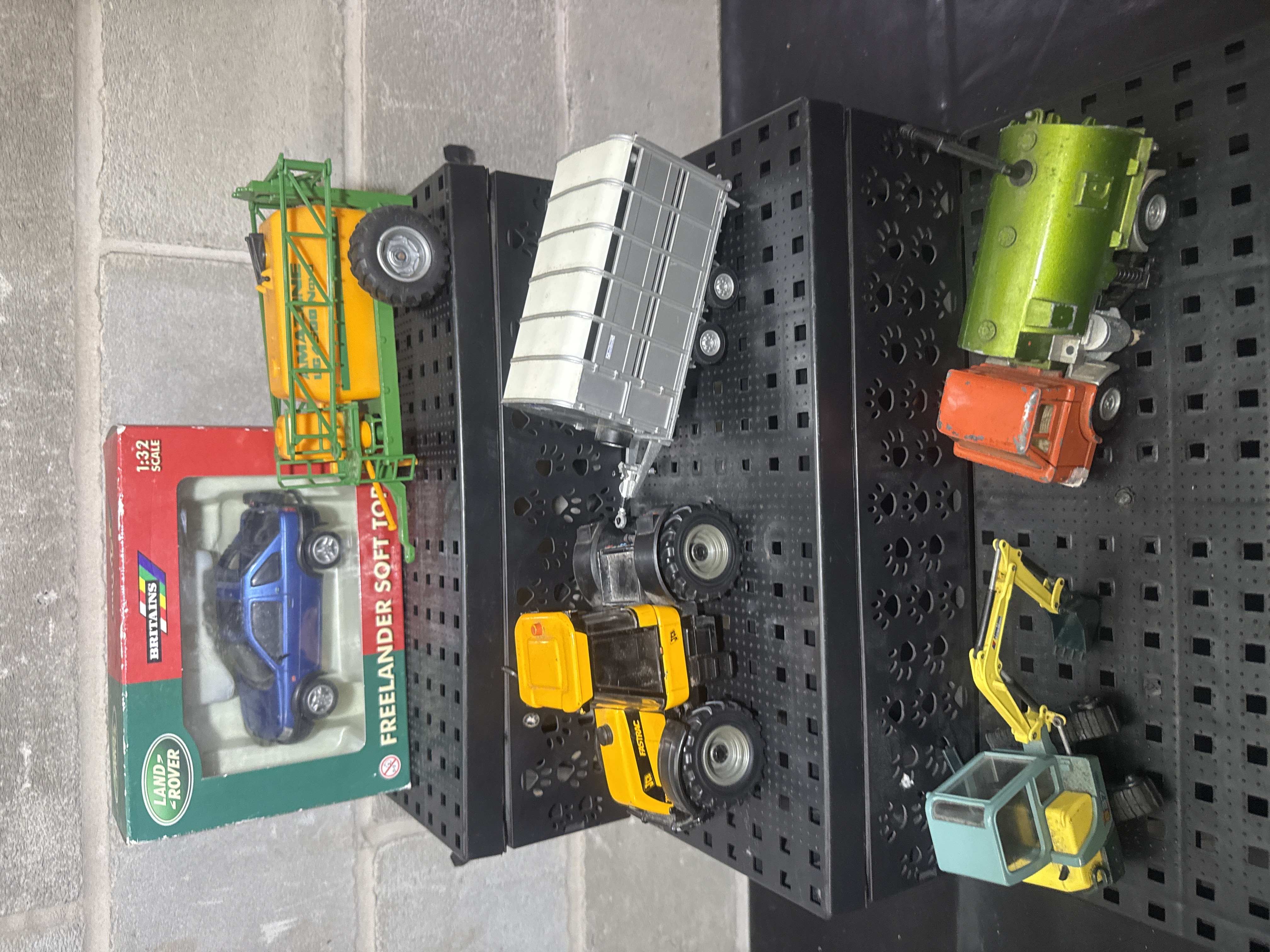 A collection of die-cast metal and plastic model vehicles and agricultural machinery. The group features a Britains Land Rover Freelander Soft Top in blue, 1:32 scale, housed in its original retail window box. The assortment includes several loose models such as a yellow JCB Fastrac tractor with a silver livestock trailer, an Amazone sprayer attachment in green and yellow, a vintage-style tanker truck with an orange cab and green tank, and a yellow and light blue tracked excavator. The models are constructed from a combination of die-cast metal and molded plastic parts.