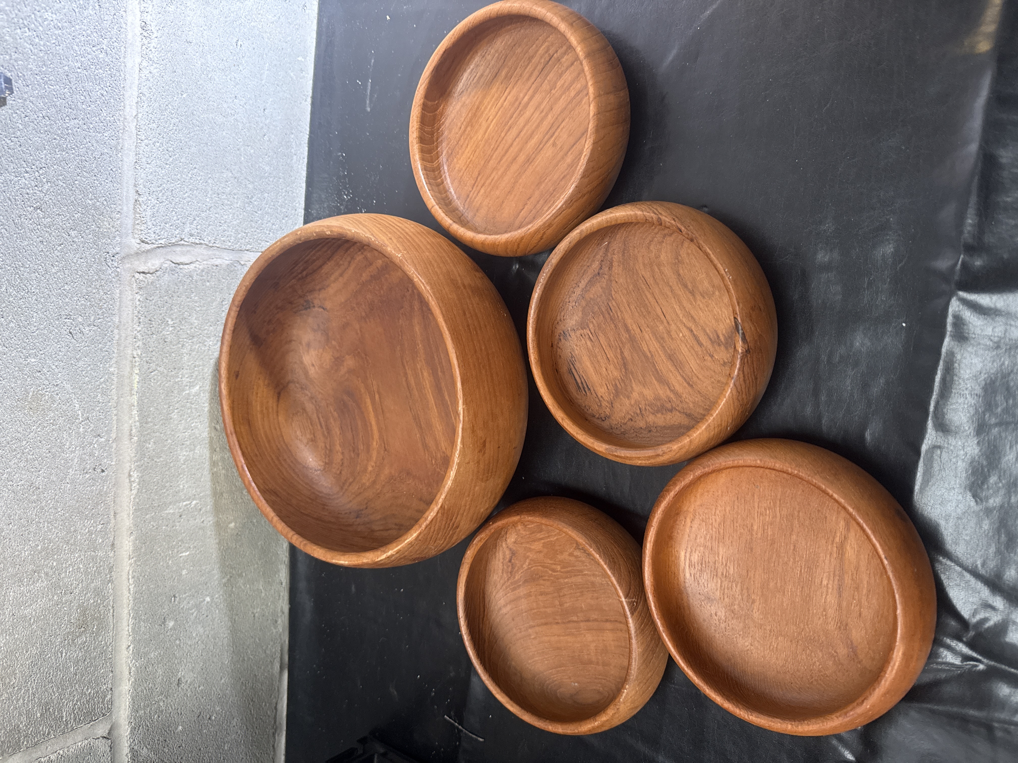 A set of mid-century modern salad bowls attributed to Goodwood, crafted from genuine teak wood. The collection features a deep serving bowl and coordinating shallower bowls, all exhibiting a turned construction with thick, rounded rims and a prominent natural wood grain. These pieces are consistent with mid-20th century production from Thailand, characterized by their organic form and durable material. No manufacturer markings or labels are visible on the items.
