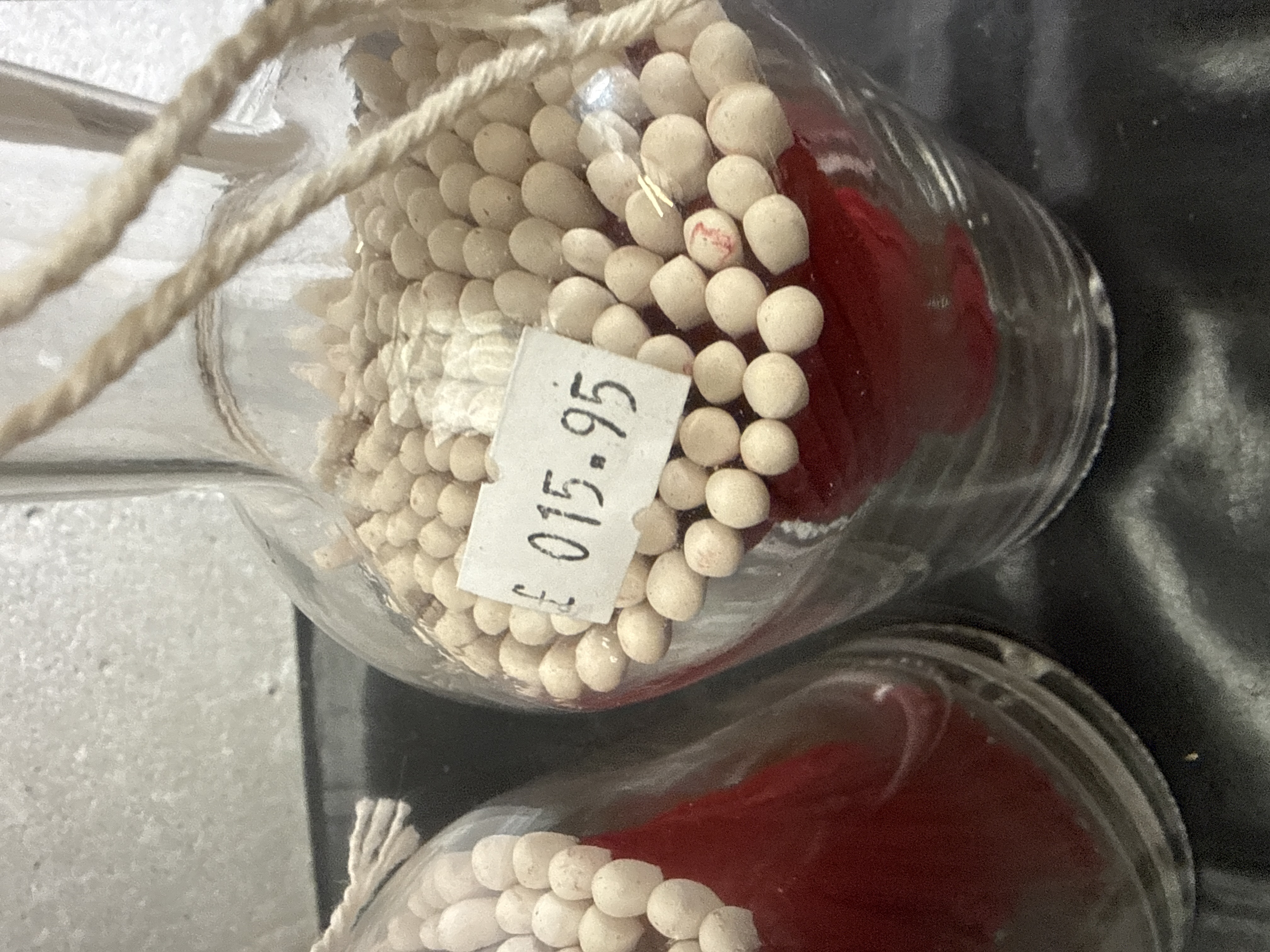 A pair of clear glass apothecary-style bottles featuring tapered necks and cork stoppers. Each vessel is filled with double-ended floral stamens, consisting of red-colored stems and matte white tips. The bottles are decorated with white string tied around the necks. One bottle retains a retail price sticker reading 15.95 GBP, while the other includes a small white paper tag with red printed text reading Happy Christmas. These items are designed for decorative display or craft use.