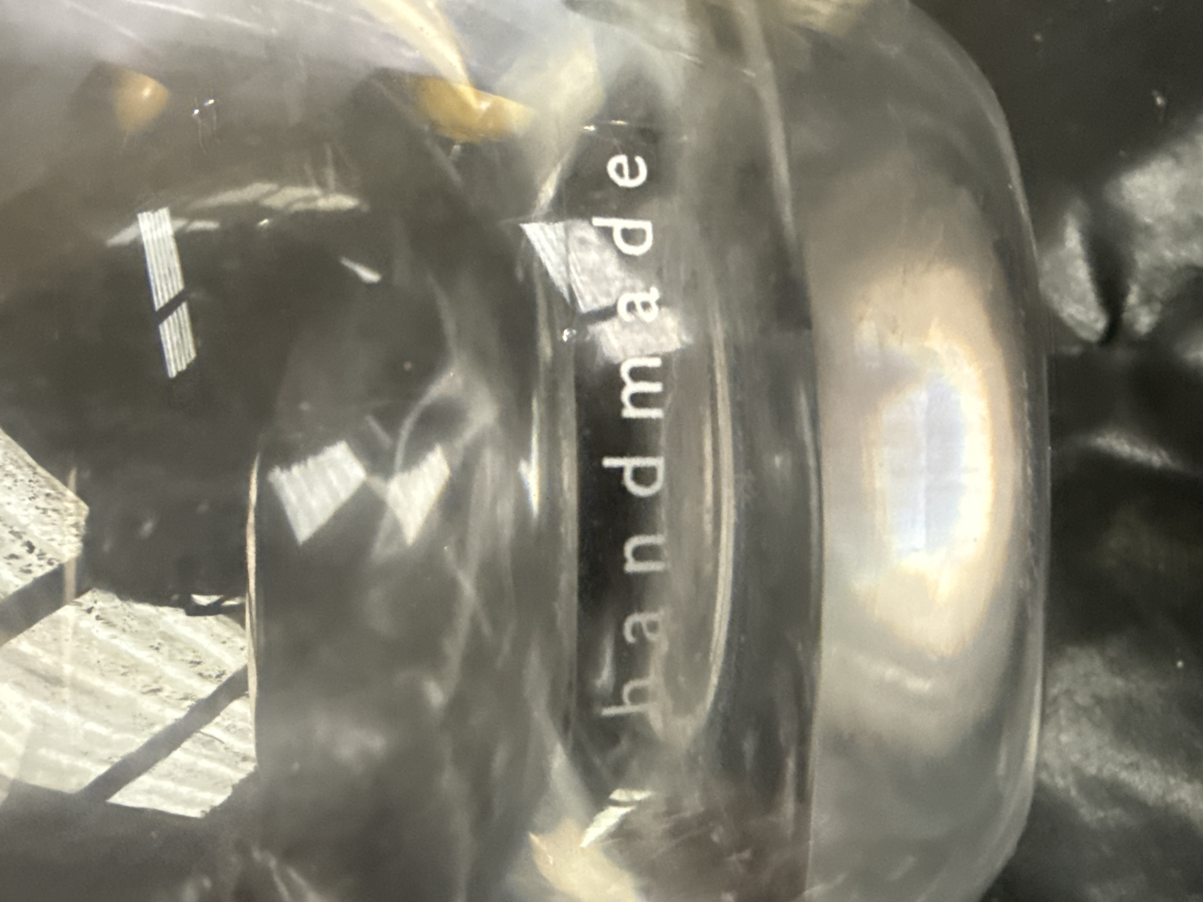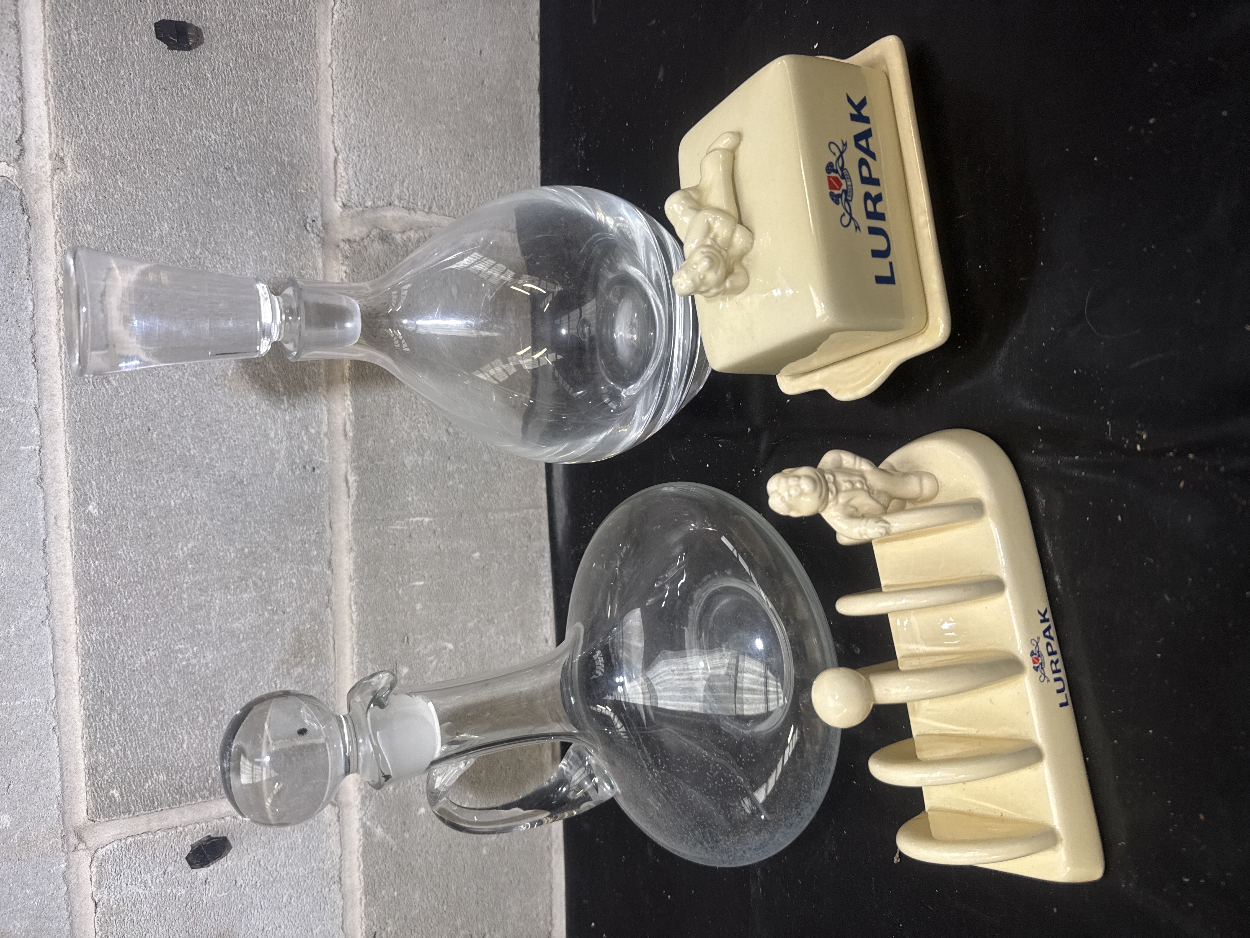 A group of clear glass and ceramic kitchenware. The collection includes glass decanters of varying forms, such as a handled variety with a ball stopper and a tapered neck variety with a flat-top stopper. A decanter is marked handmade on the base. The lot also contains ceramic Lurpak items, including a butter dish with a lid and a matching toast rack, featuring the LURPAK logo and figural representations of the Douglas the butter man character. The ceramic items are finished in a cream-colored glaze.