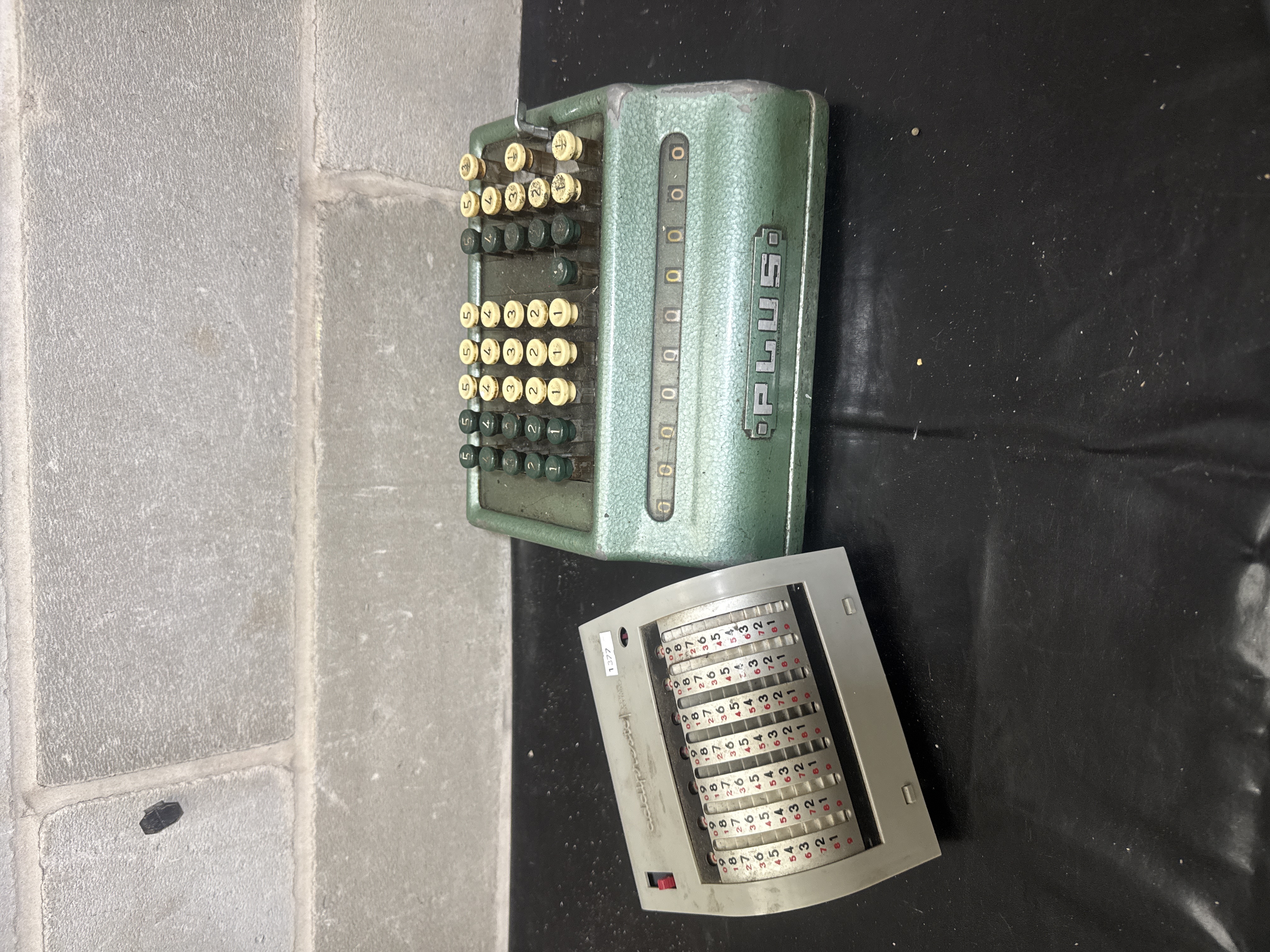 Two vintage mechanical calculating devices, comprising a Bell Punch Company Plus Adder and an Addi-Speed manual calculator. The Plus adding machine features a green hammered-finish metal case with multiple rows of round green and off-white plastic keys and a numeric display window. The front of the housing is marked with the Plus brand name. The Addi-Speed device consists of a light gray plastic housing with several internal rotating numeric drums visible through a display window and a small red control switch.