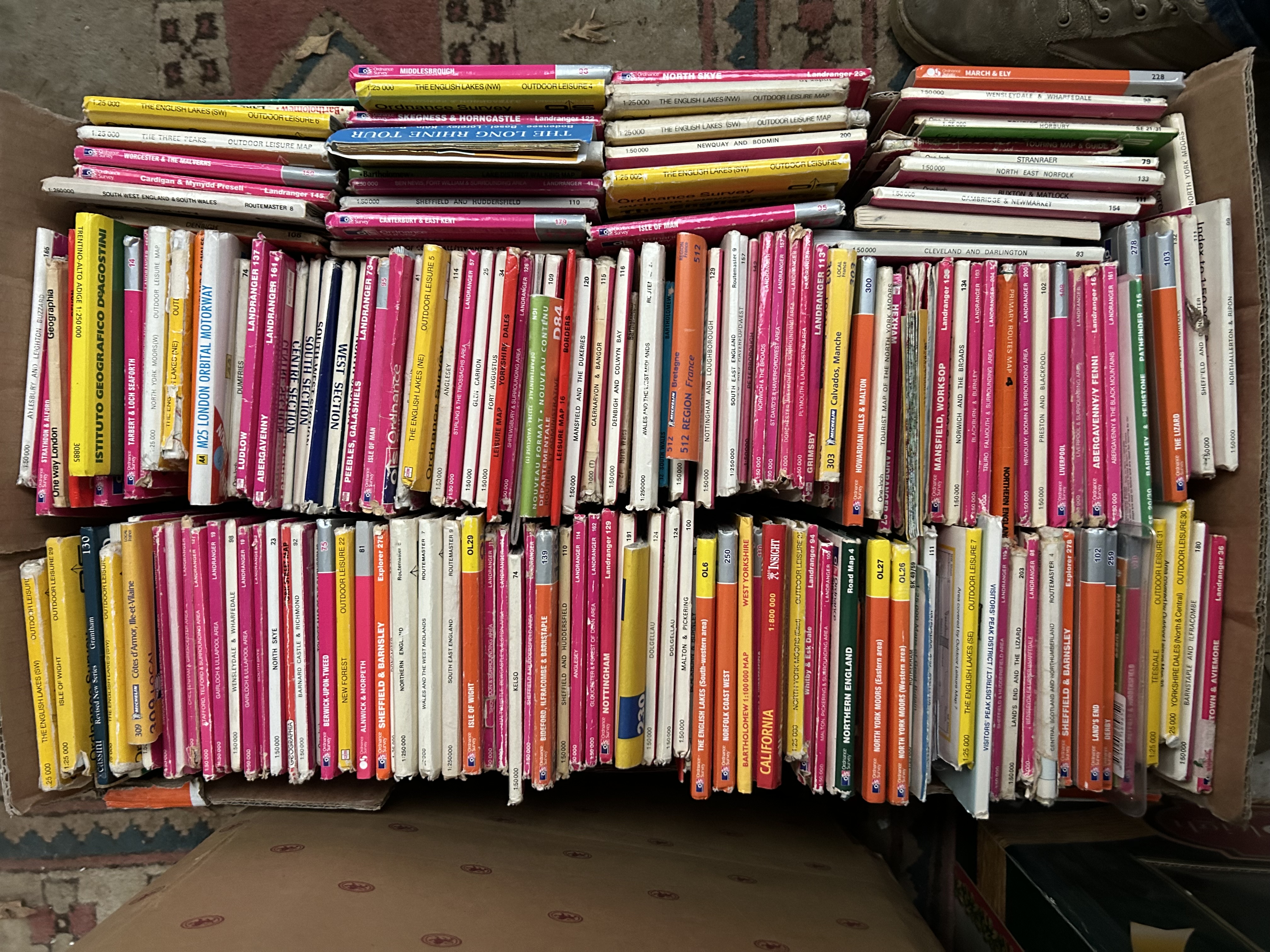 A large collection of vintage and contemporary maps and topographical guides, primarily from the 20th century. The assortment includes various editions from notable publishers such as Ordnance Survey (including Landranger, Outdoor Leisure, and Pathfinder series), Bartholomew, Geographia, Michelin, Istituto Geografico De Agostini, and A-Z. The items predominantly cover regions within the United Kingdom, including the English Lake District, various British counties, and urban centers. International maps are also present, covering regions such as California and areas of France. The items are printed on paper with softcover and card bindings.