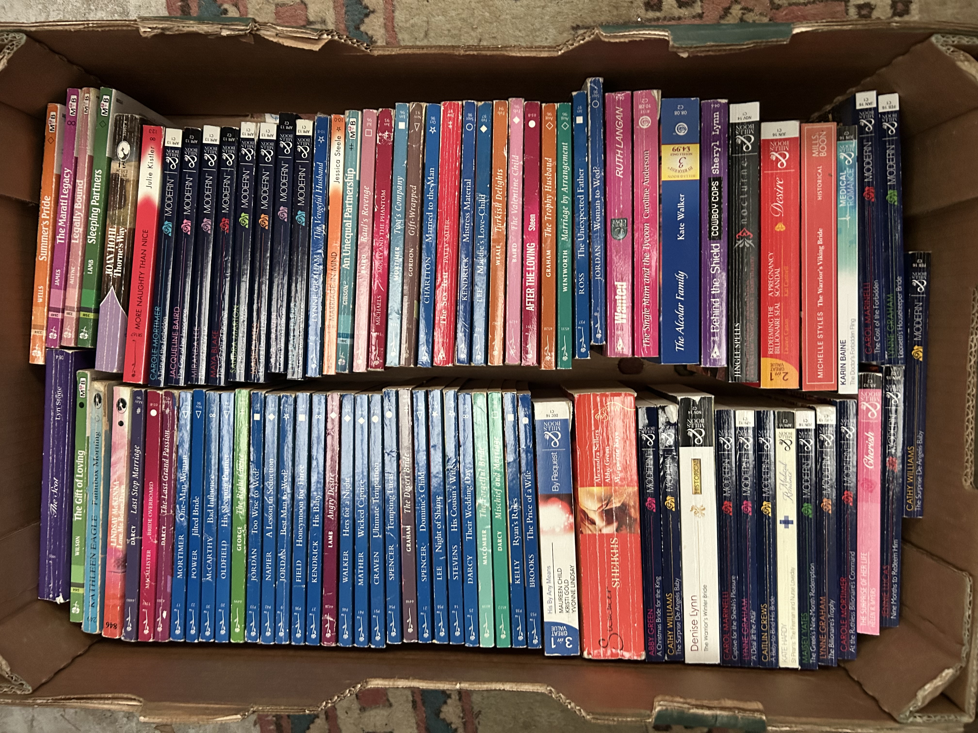 A collection of mass-market paperback romance novels primarily published by Harlequin and Mills and Boon. The assortment includes titles from various imprints such as Harlequin Modern, Medical Romance, Historical, Desire, and Nocturne. Authors featured within the group include Lynne Graham, Carole Mortimer, Michelle Styles, and Carole Marinelli. The books are contemporary publications from the late 20th and early 21st centuries, featuring a variety of illustrated cover designs. The collection is housed in two rows within a cardboard container.