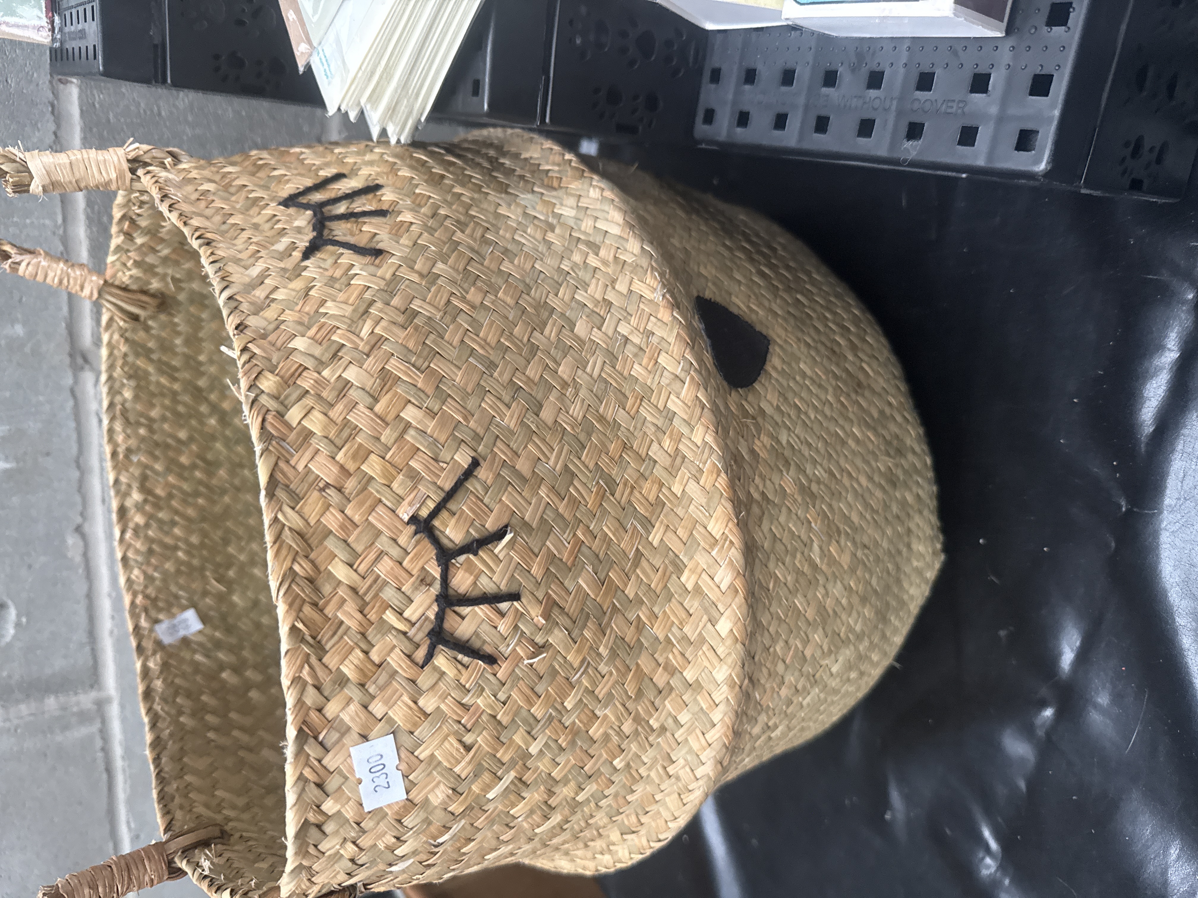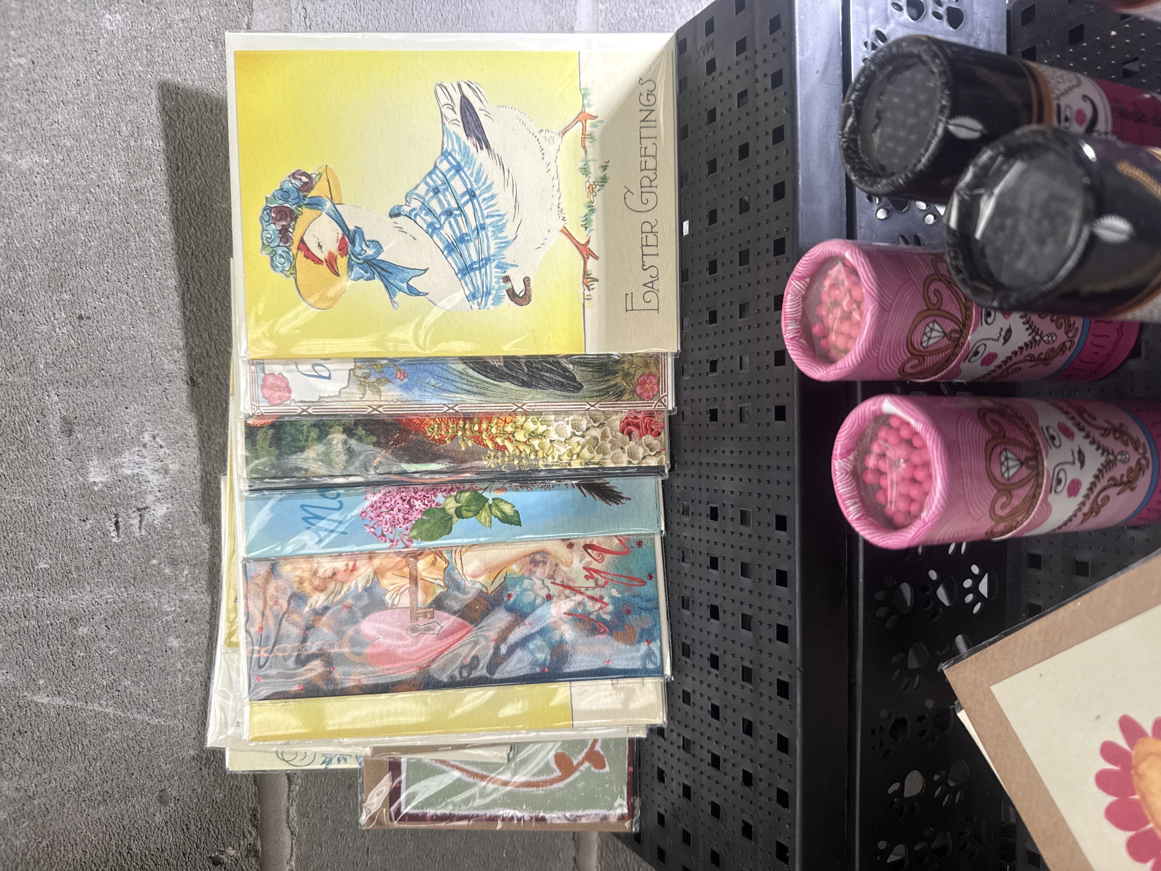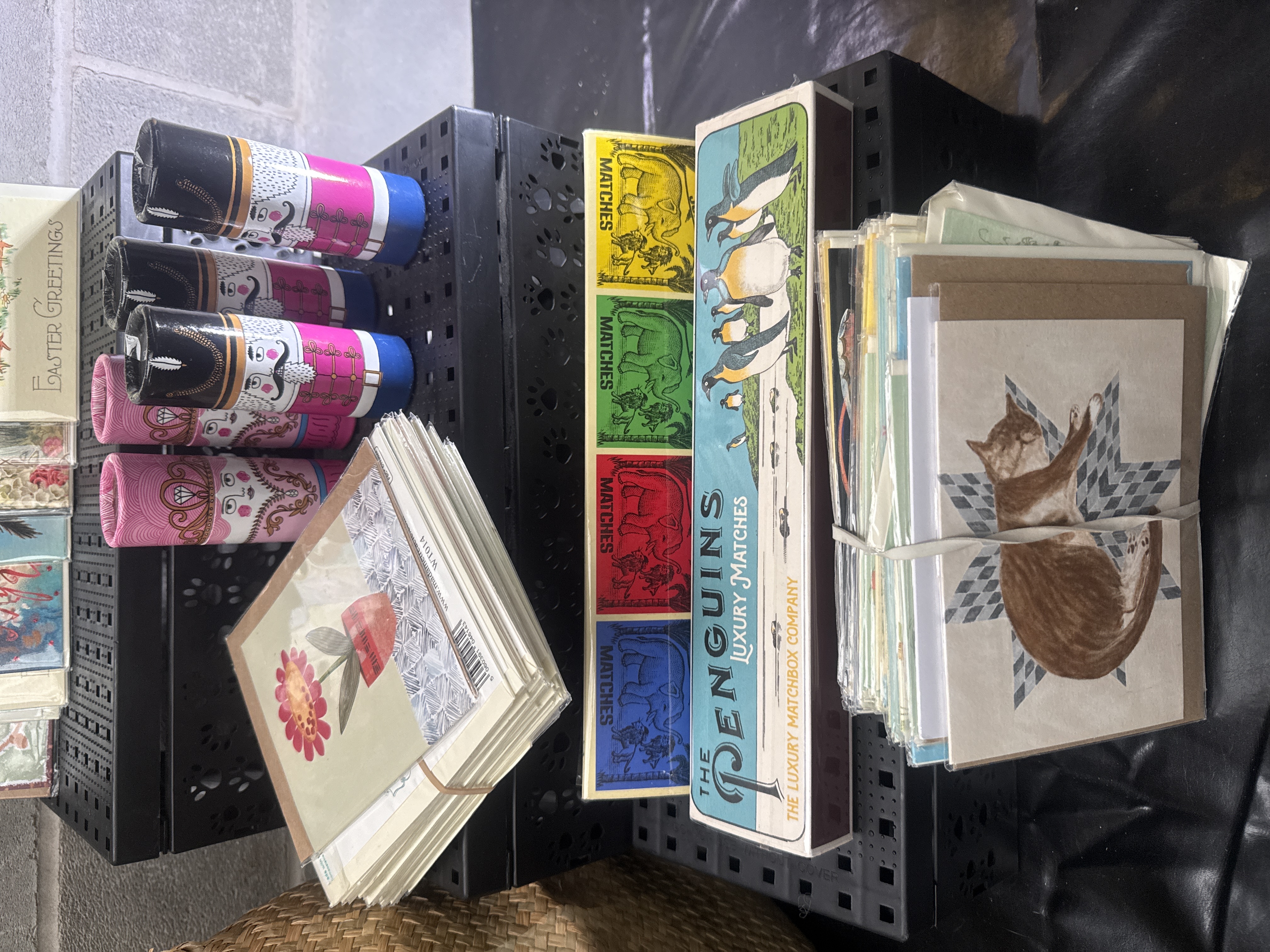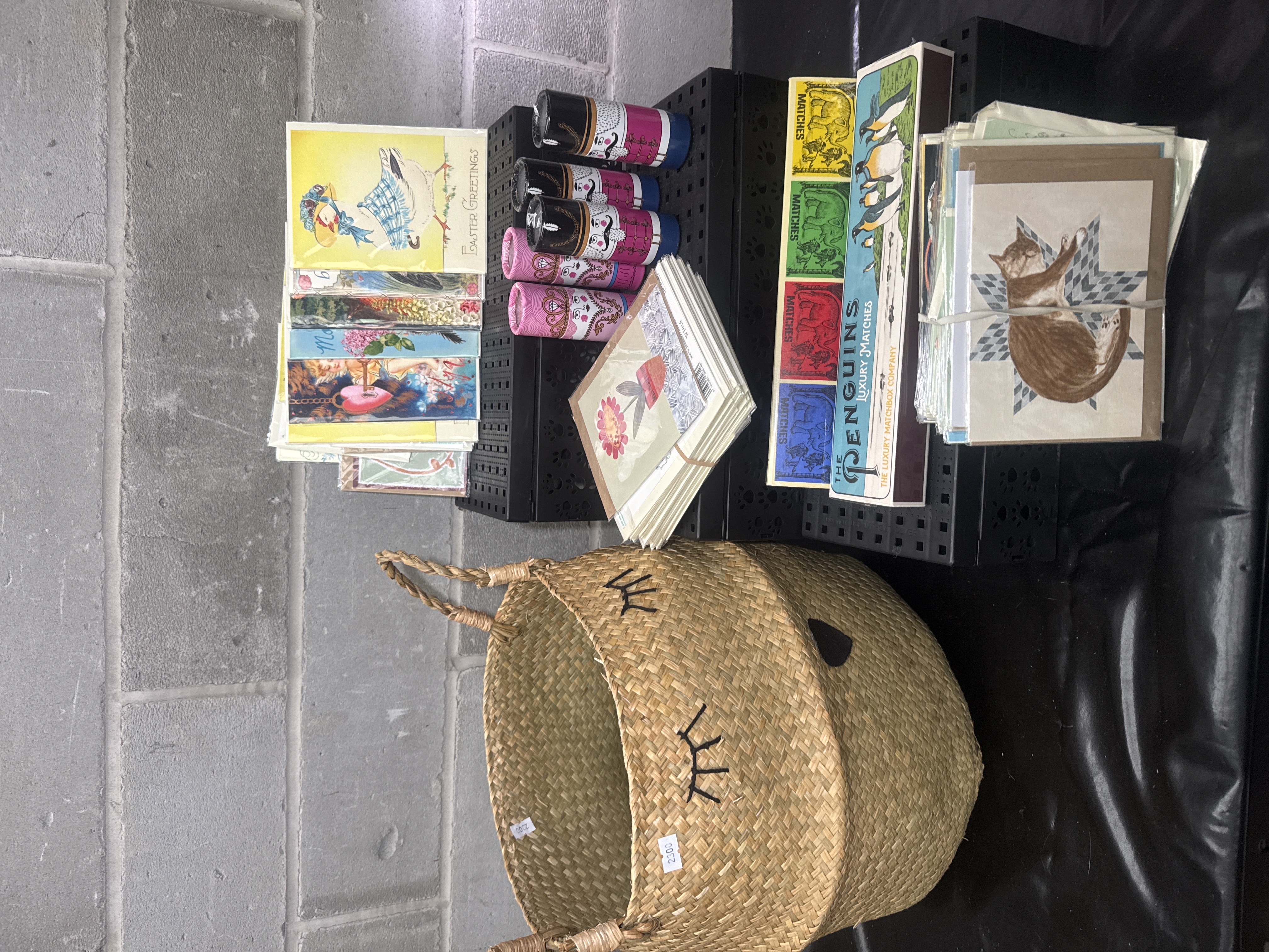 This lot features a collection of decorative storage, novelty matches, and ephemera. Included is a woven seagrass belly basket with two handles, decorated with black embroidered eyelashes and a heart motif. The collection contains two large rectangular matchboxes, including The Penguins Luxury Matches by The Luxury Matchbox Company and a box with elephant illustrations. Several cylindrical novelty match containers are included, featuring nutcracker and princess designs. The paper goods consist of an assortment of greeting cards and postcards, many in original plastic sleeves, with motifs such as a vintage-style Easter duck, a cat on a star, and floral patterns.