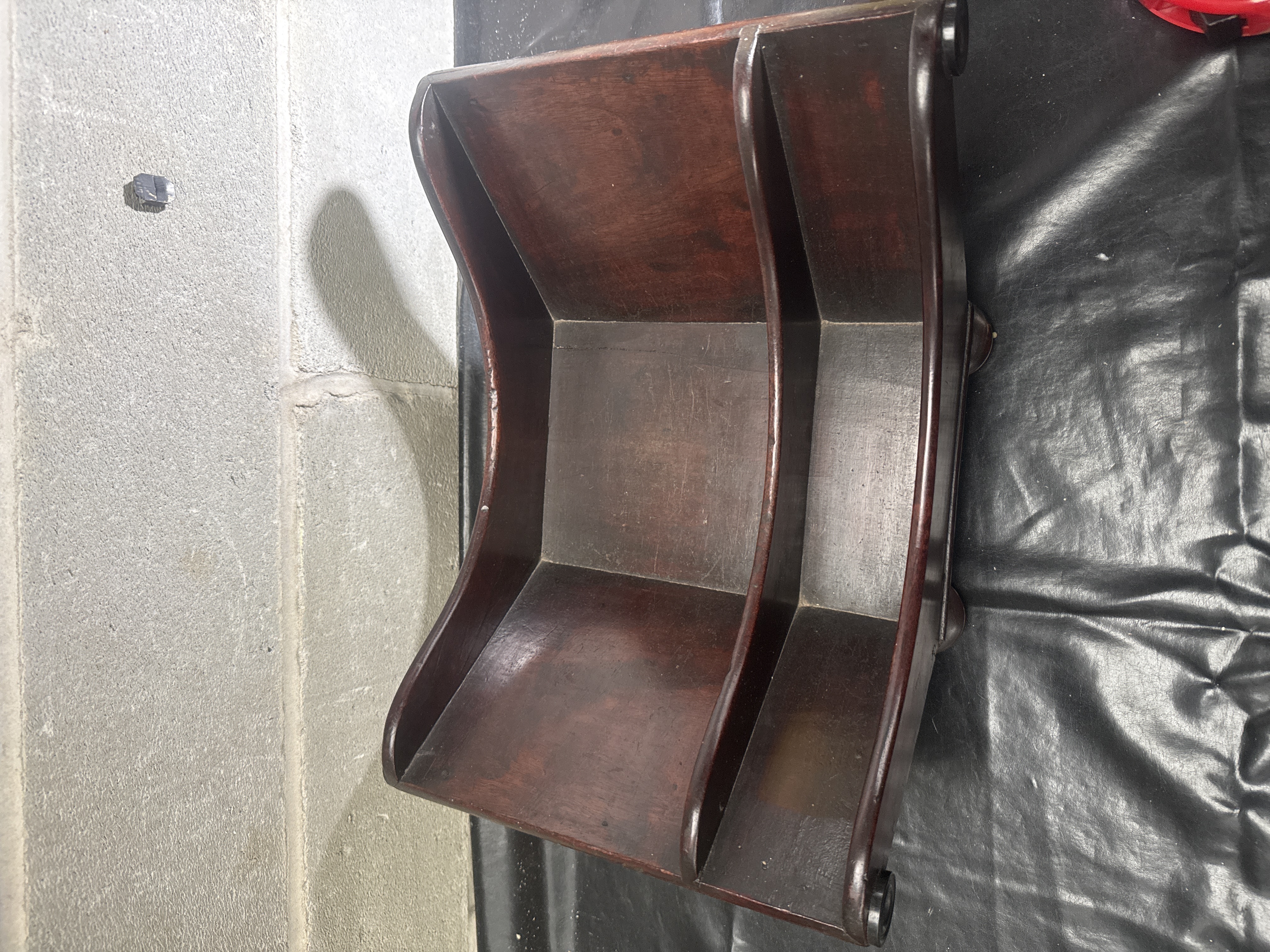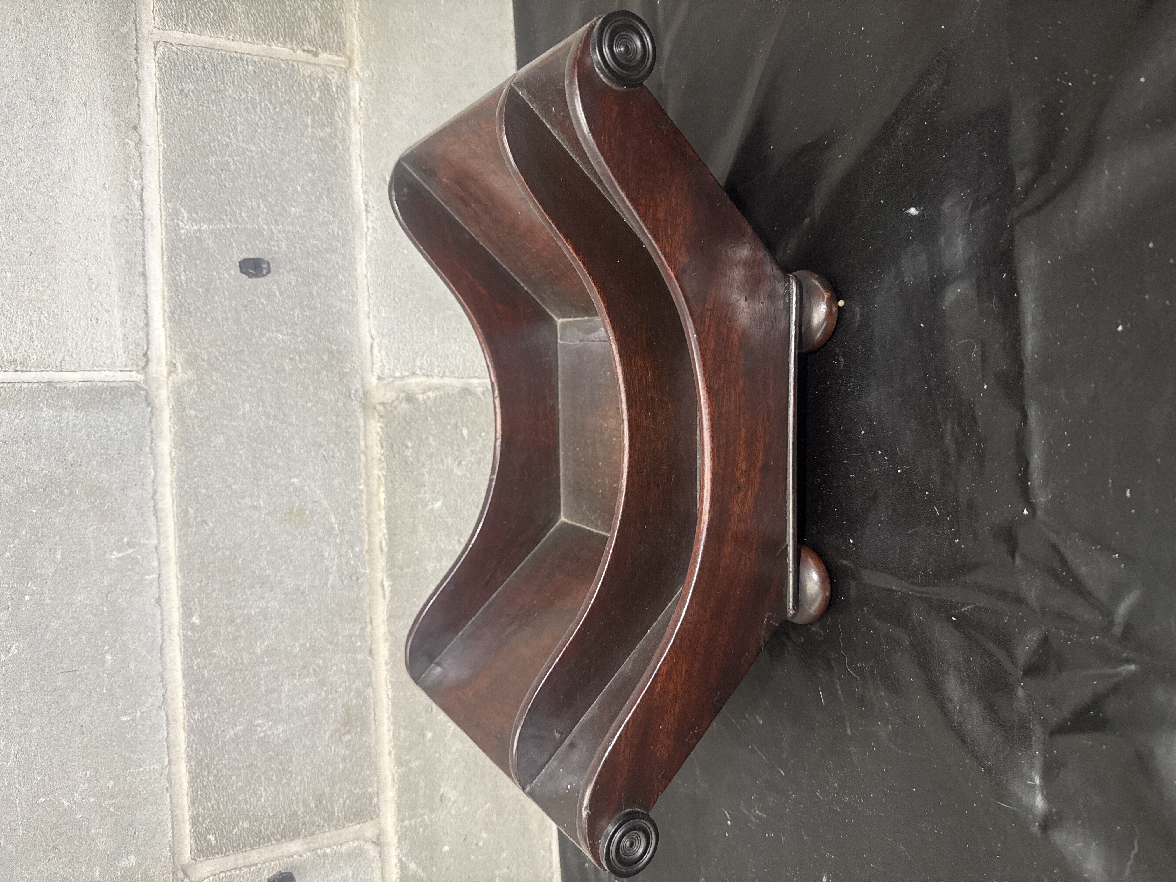 A Georgian style mahogany double cheese coaster featuring a twin-compartment design with high, sweeping sides and a central divider. The piece is constructed with scrolled ends accented by turned decorative roundels and rests on four integrated bun feet. The wood displays a polished finish with a visible grain and aged patina.