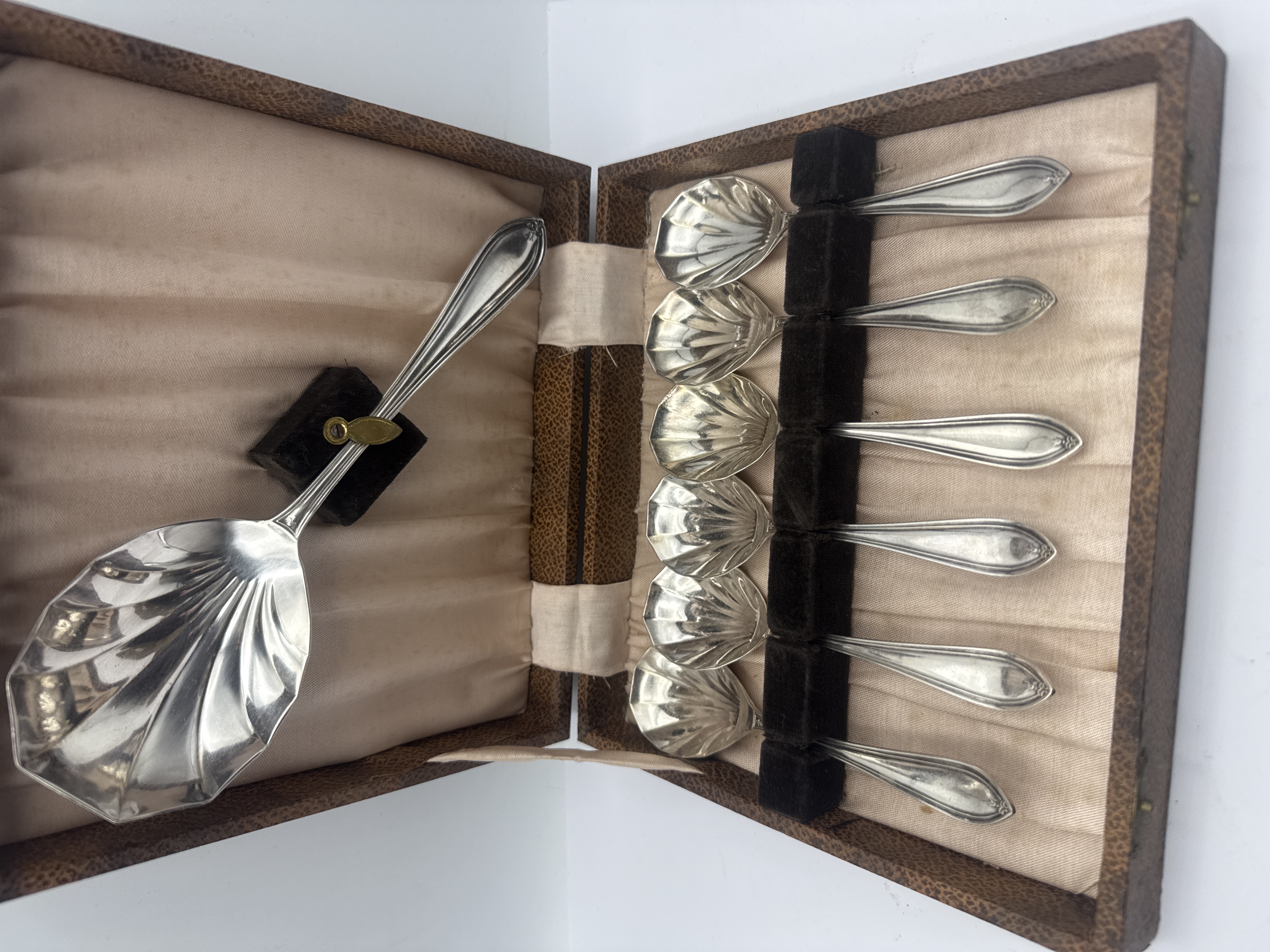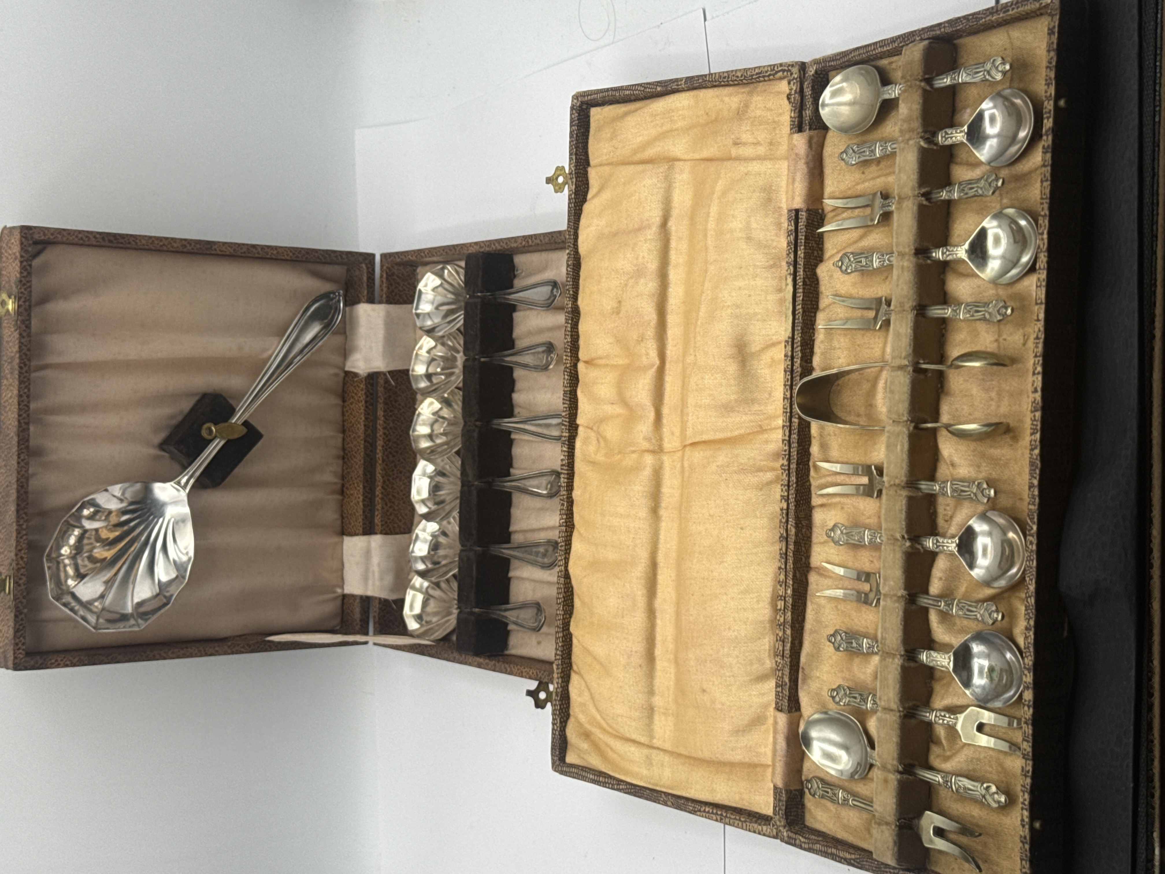 A collection of two vintage cased flatware sets. The first set consists of silver-toned metal spoons in a shell pattern, featuring one large serving spoon and several smaller matching spoons, housed in a brown textured presentation case with a light pink fabric lining. The second set contains an assortment of small service pieces, including spoons, two-tined forks, and a pair of sugar tongs. These pieces feature ornate figural handles and are presented in a fitted case with a yellow silk-style lining. The metal across both sets exhibits a bright finish with decorative relief work on the handles. No hallmarks are immediately visible in the provided images.