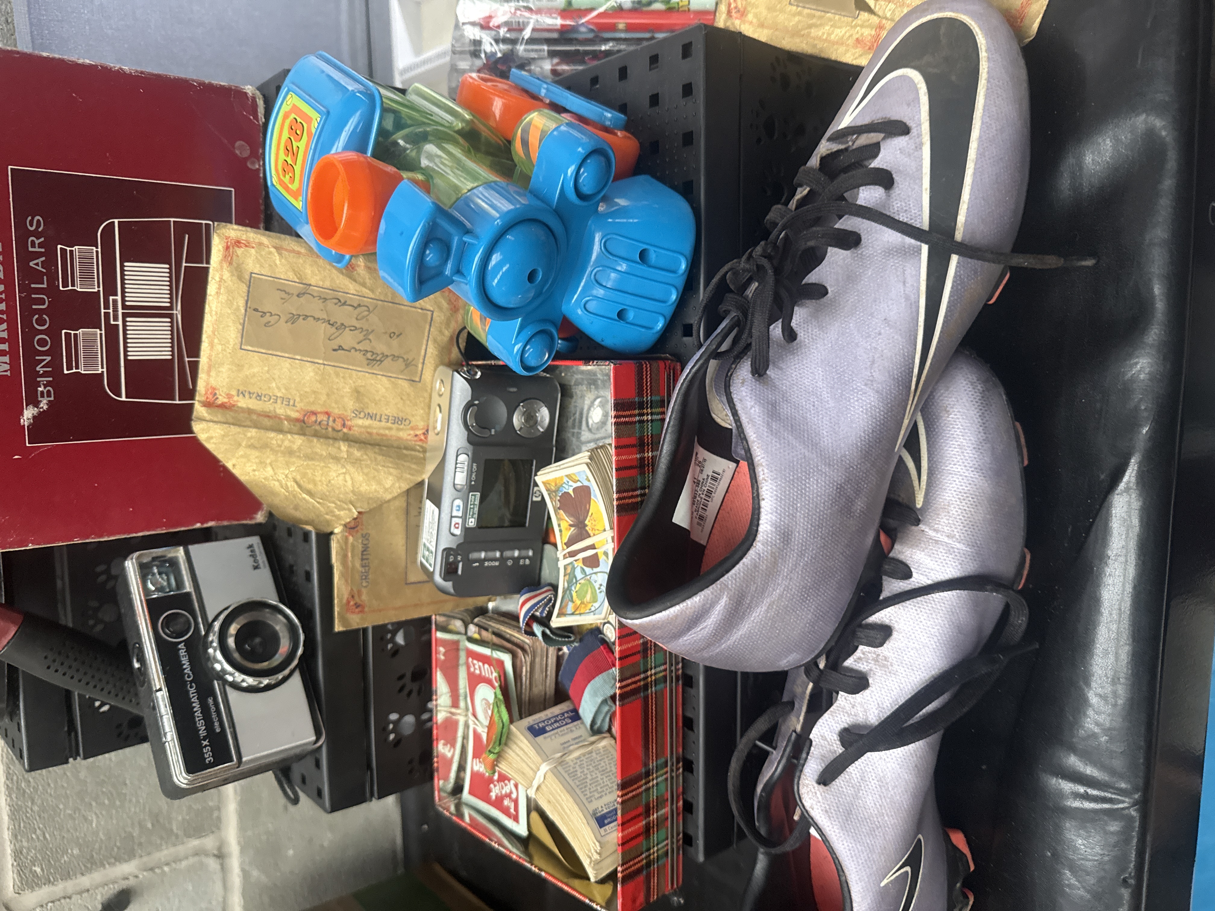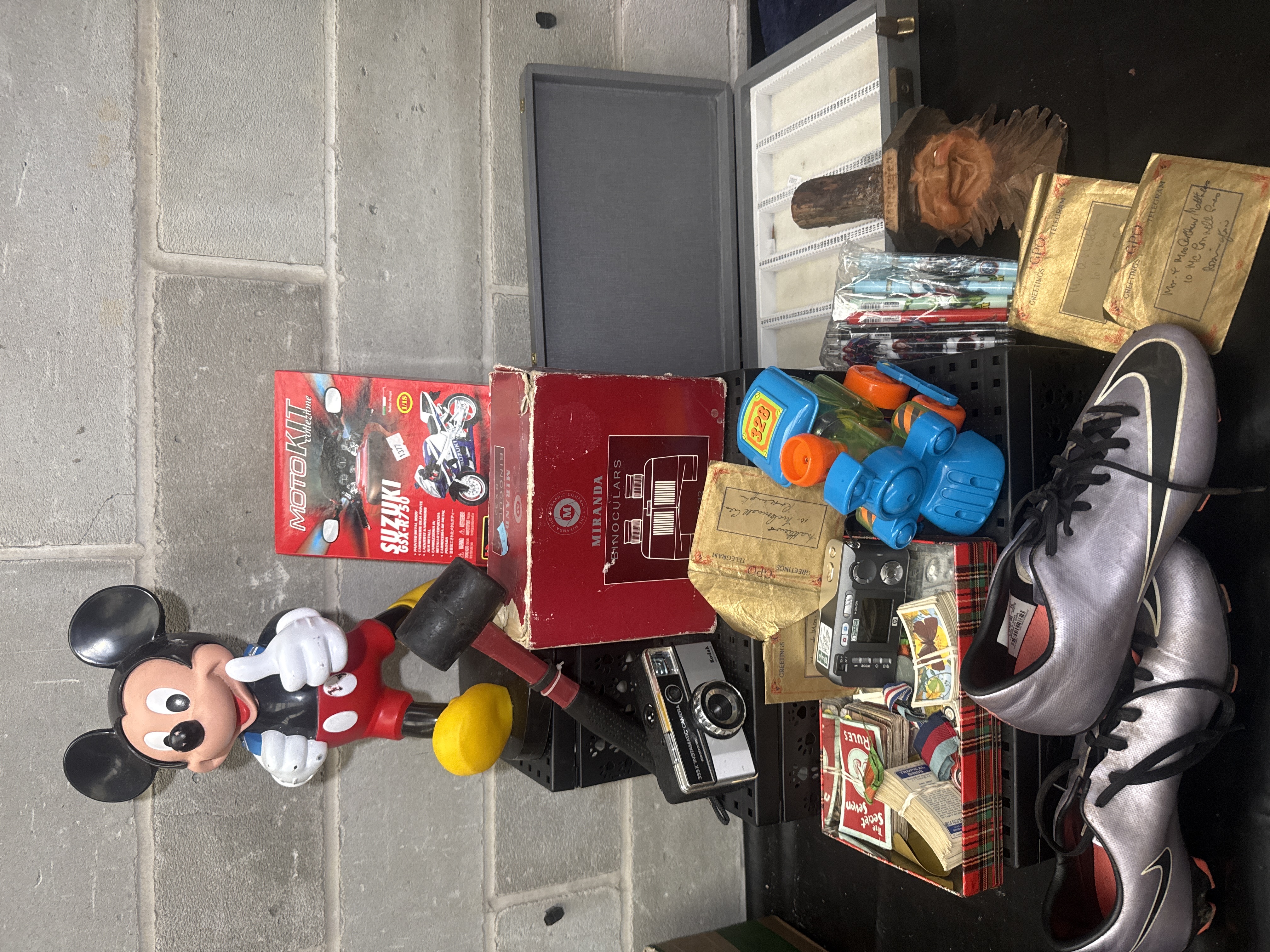 A collection featuring Suzuki Four Stroke Service Bulletins dating from 1976-1980 in a 3-ring binder with a 4-inch spine and a Suzuki Motorcycle Service Manual for the GV1200GL. The lot includes a boxed Moto Kit Suzuki GSX-R750 model from the collezione series. Photographic equipment is represented by a Kodak 355-X Instamatic camera and a digital camera. Optical equipment includes a boxed set of Miranda binoculars. Ephemera consists of GPO Greetings Telegram envelopes, a Secret Seven booklet stored in a plaid box, and various small trading cards. Also included are a plastic Mickey Mouse figure, a hand-carved wooden decorative mask, a pair of silver Nike athletic cleats, jewelry presentation cases, a rubber-headed mallet, and assorted plastic toys.