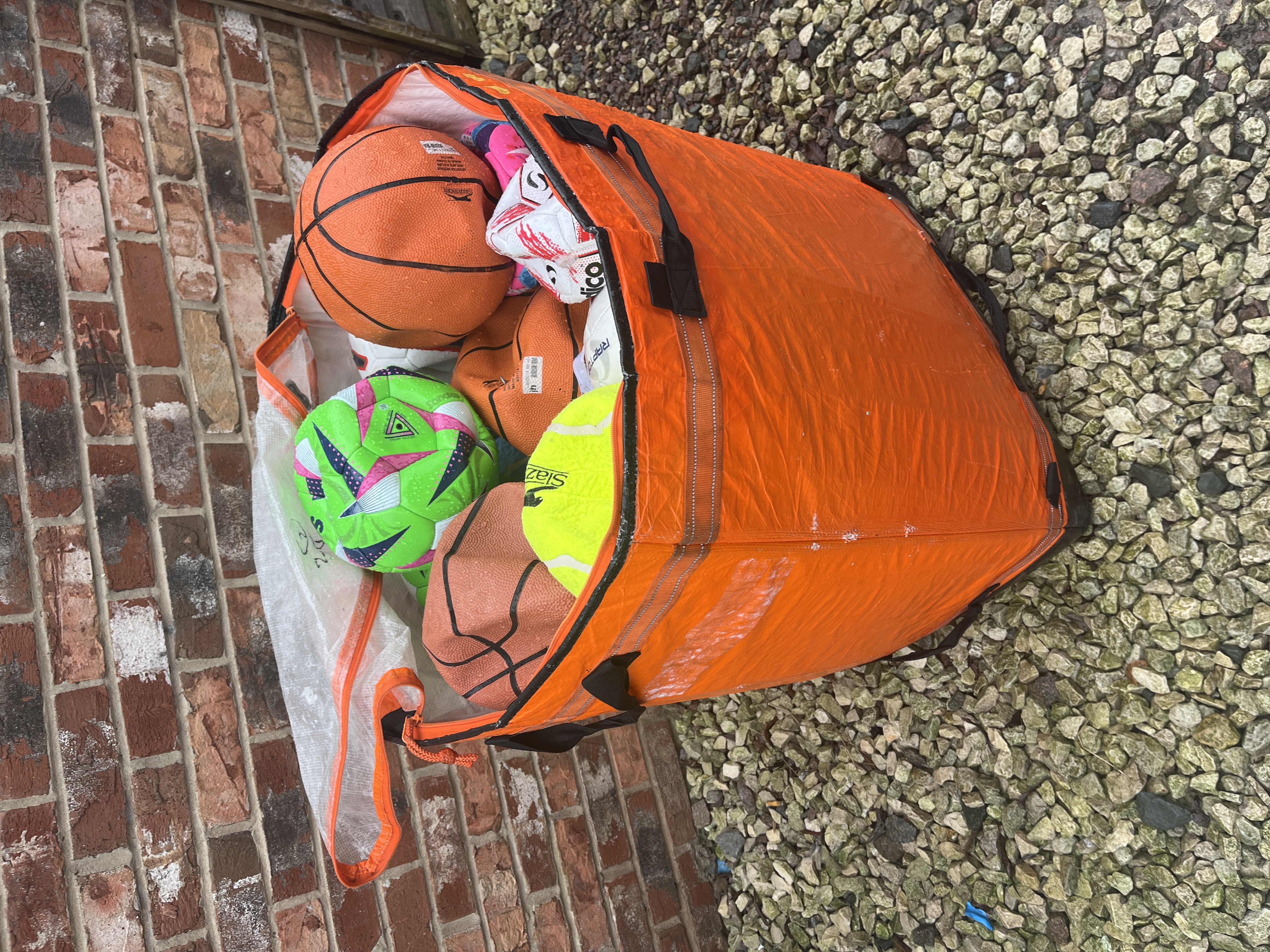 An assortment of various sports balls including basketballs, soccer balls, and an oversized novelty tennis ball. Visible brand names include Slazenger, Sondico, and Raptor. The collection features balls in various color patterns, constructed from standard synthetic and rubber materials. Please note that the orange Jenga Giant synthetic fabric storage bag used for display in the photographs is not included in this lot.