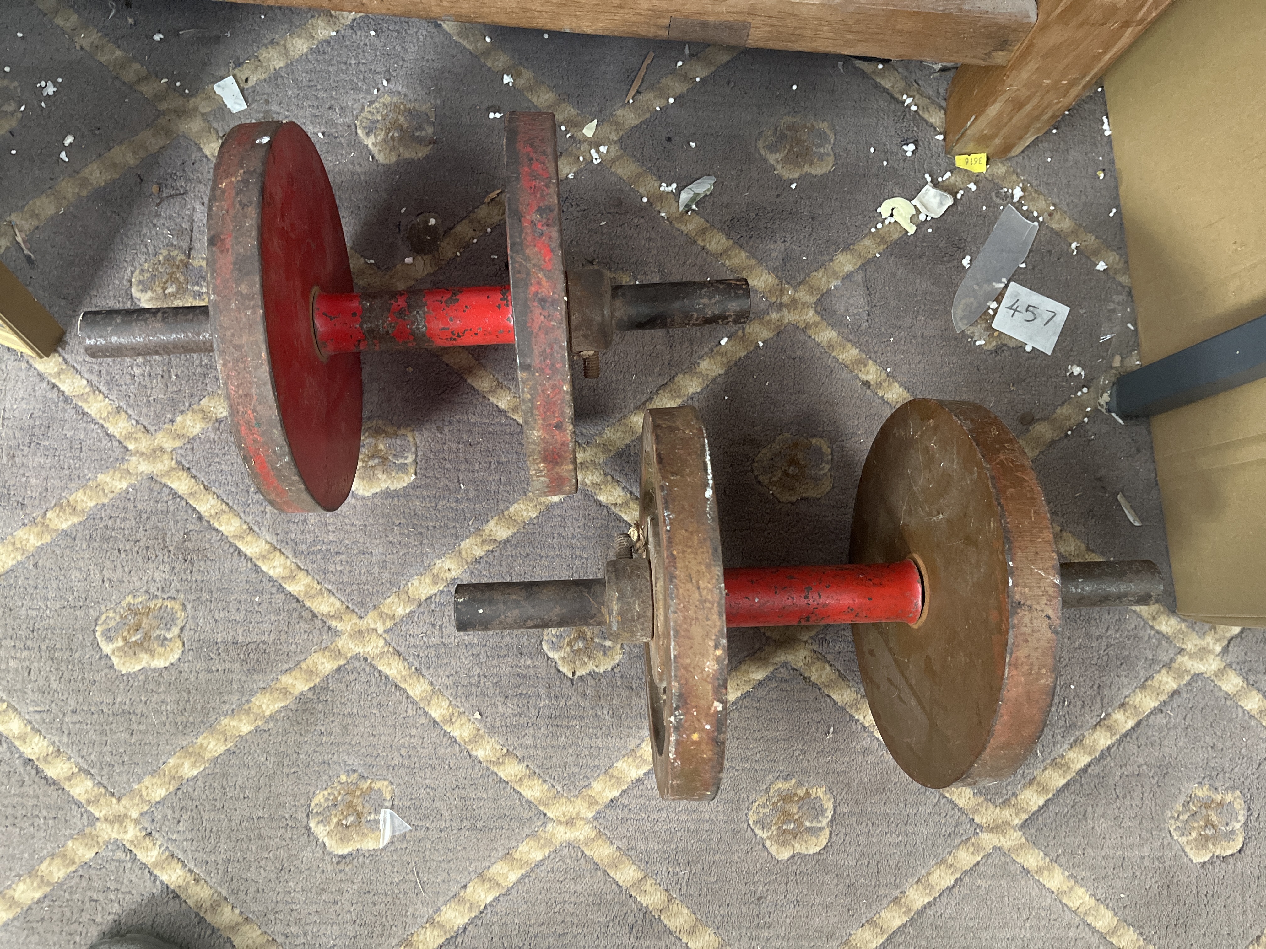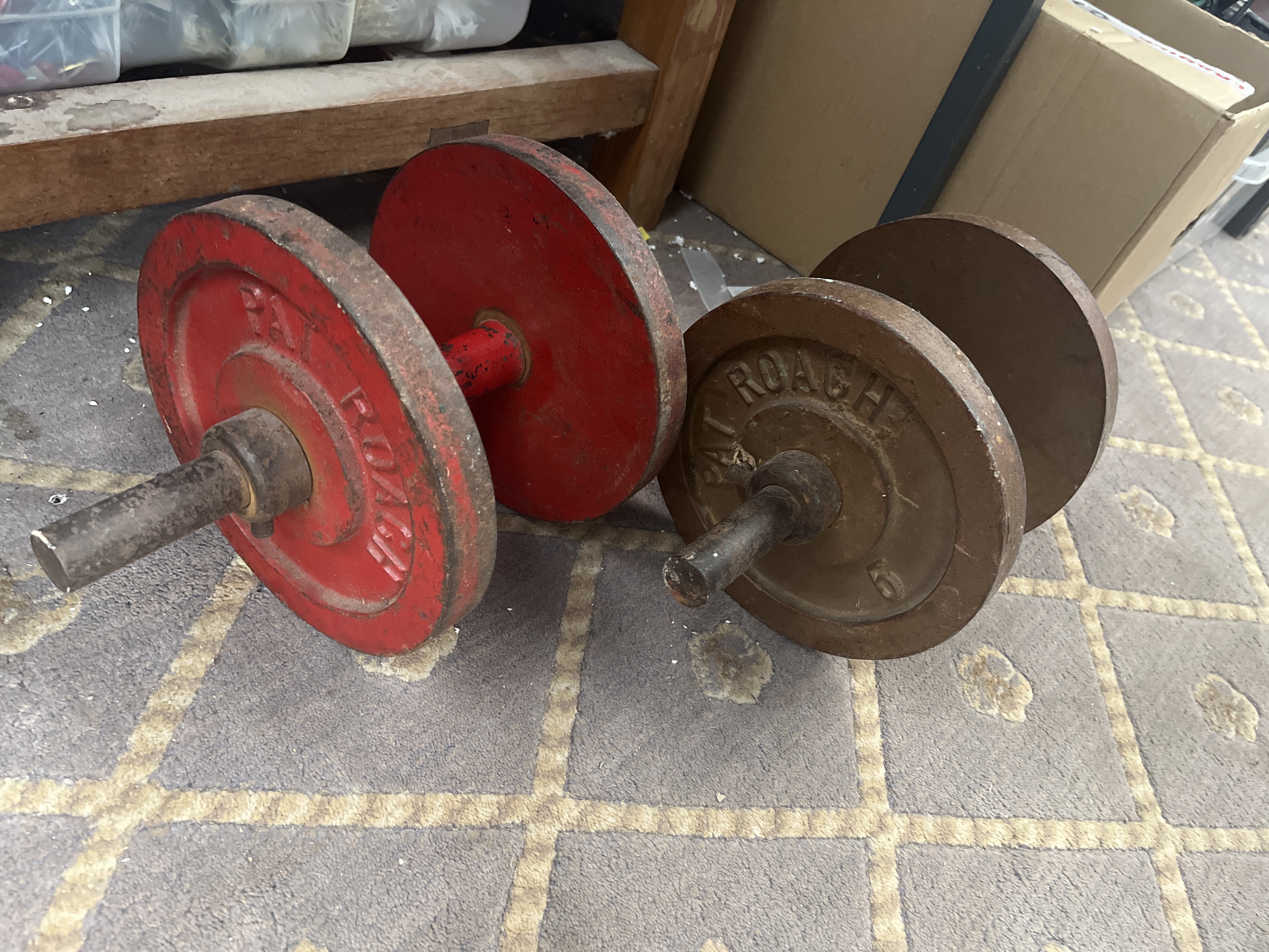 A pair of vintage cast iron dumbbells featuring a utilitarian industrial design. Each piece consists of a central metal bar with red paint accents and heavy flat circular plates. The plates are embossed with the name PAT ROACH and the numeral 15. The weights are secured to the bars with traditional set-screw collars. The construction is comprised of cast iron plates and steel bars.