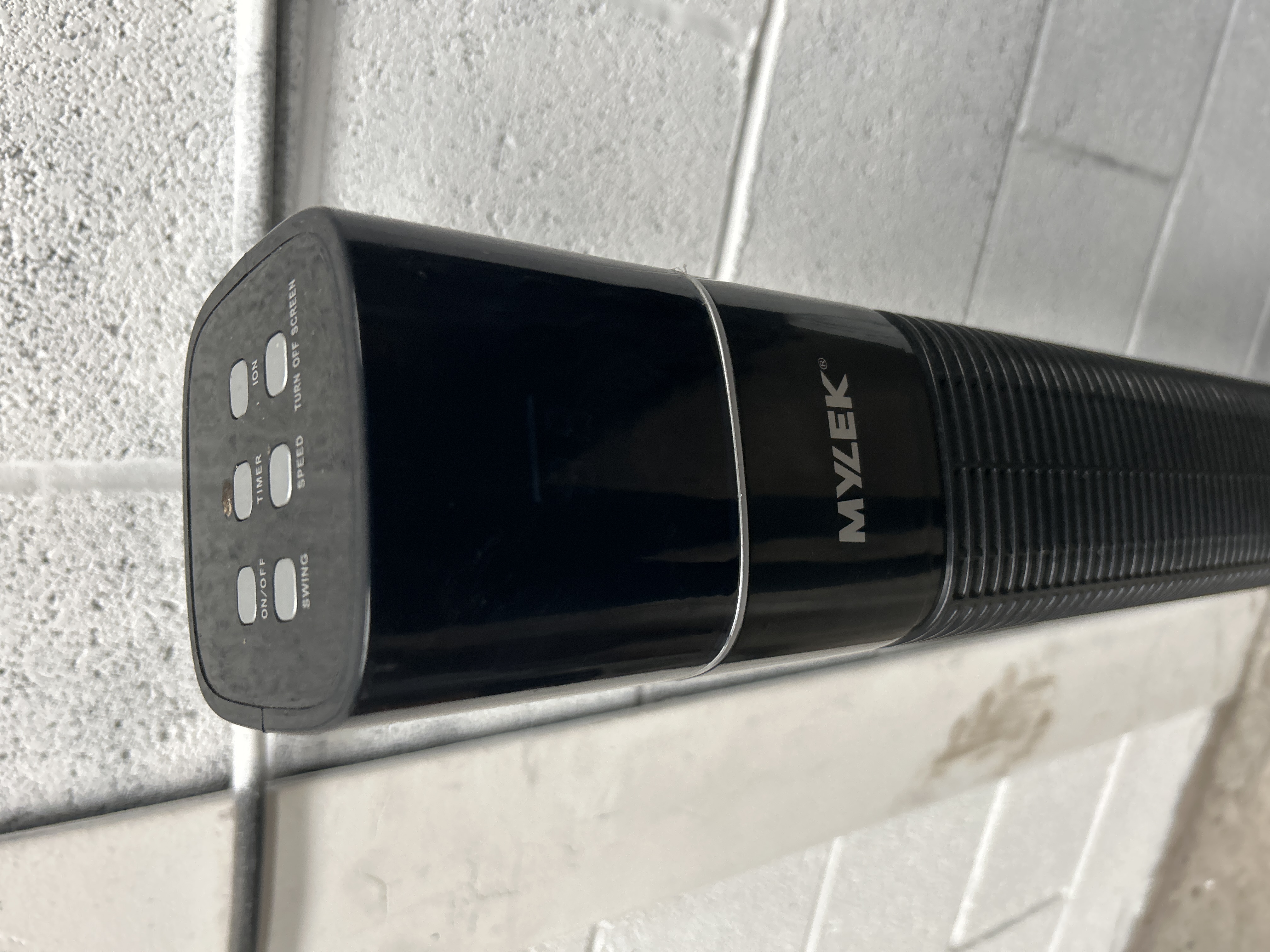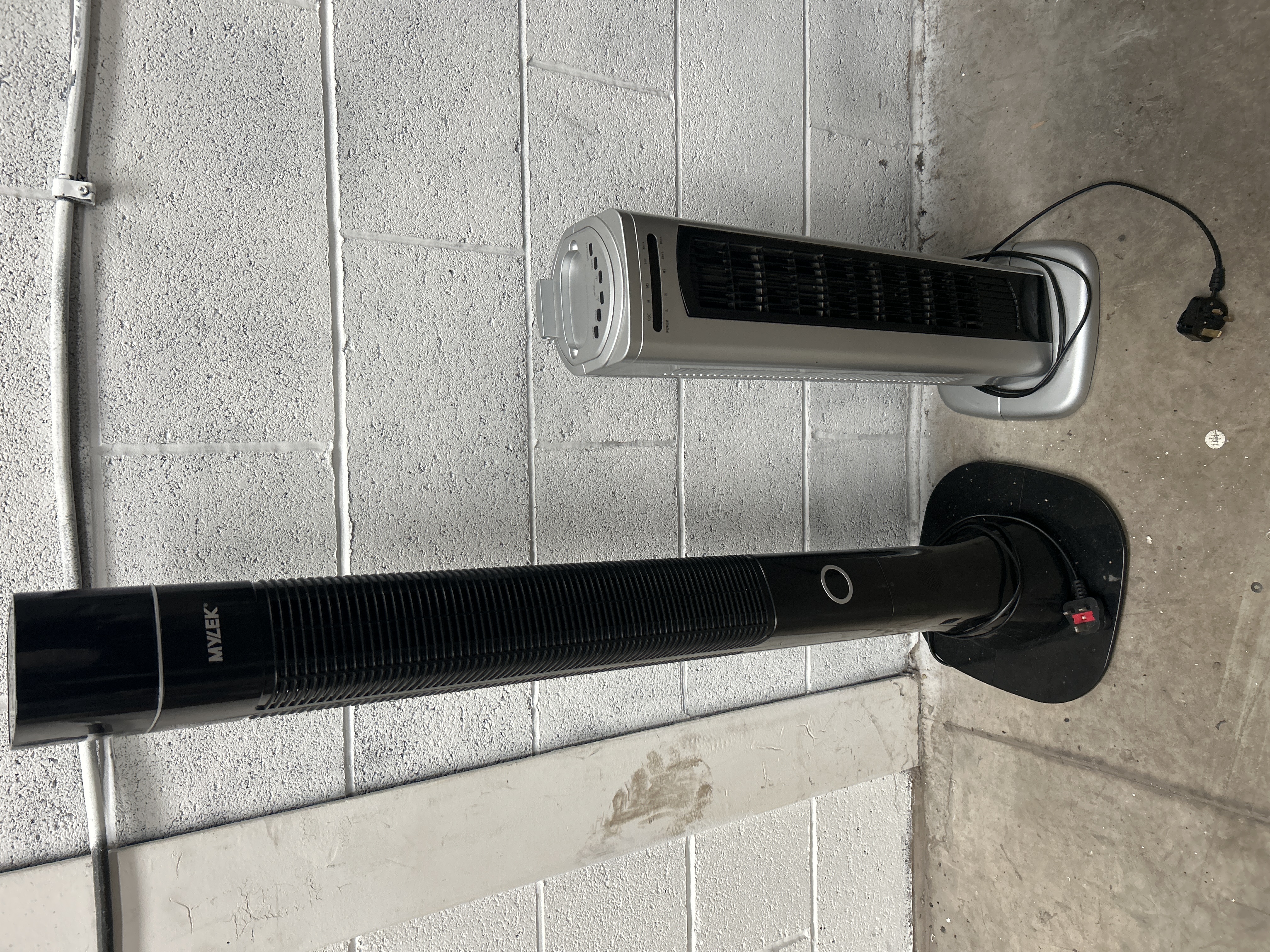Two electric tower fans of varying styles and finishes. The taller unit is finished in black and branded Mylek. This model features a top-mounted control panel with push-button settings for power, swing, timer, speed, ionizer, and screen display. The shorter unit is finished in a silver tone with a top-mounted control interface. Both fans are constructed with molded plastic housings and integrated vertical airflow grilles. Each unit is equipped with a fixed power cable and a three-pin plug.