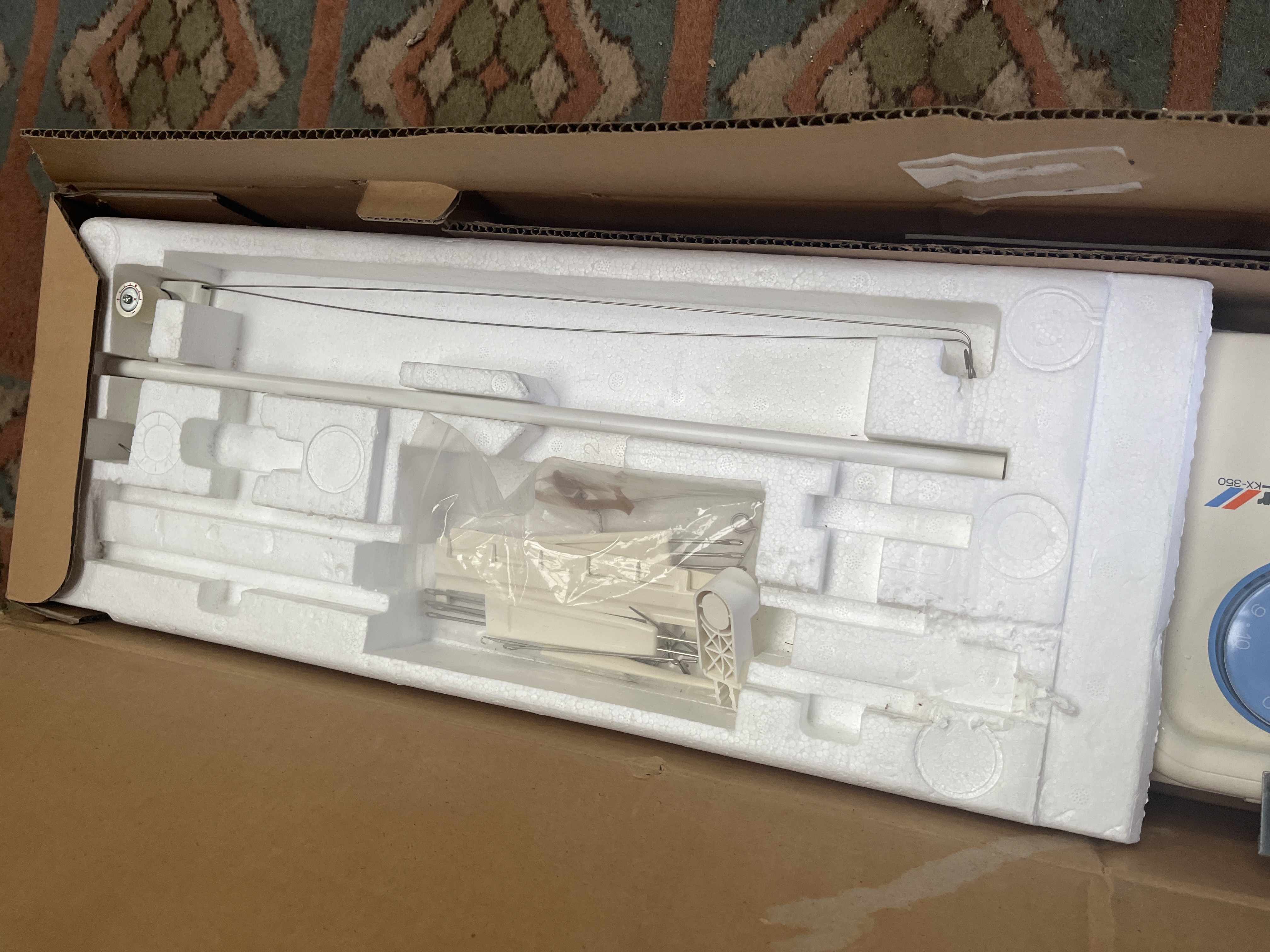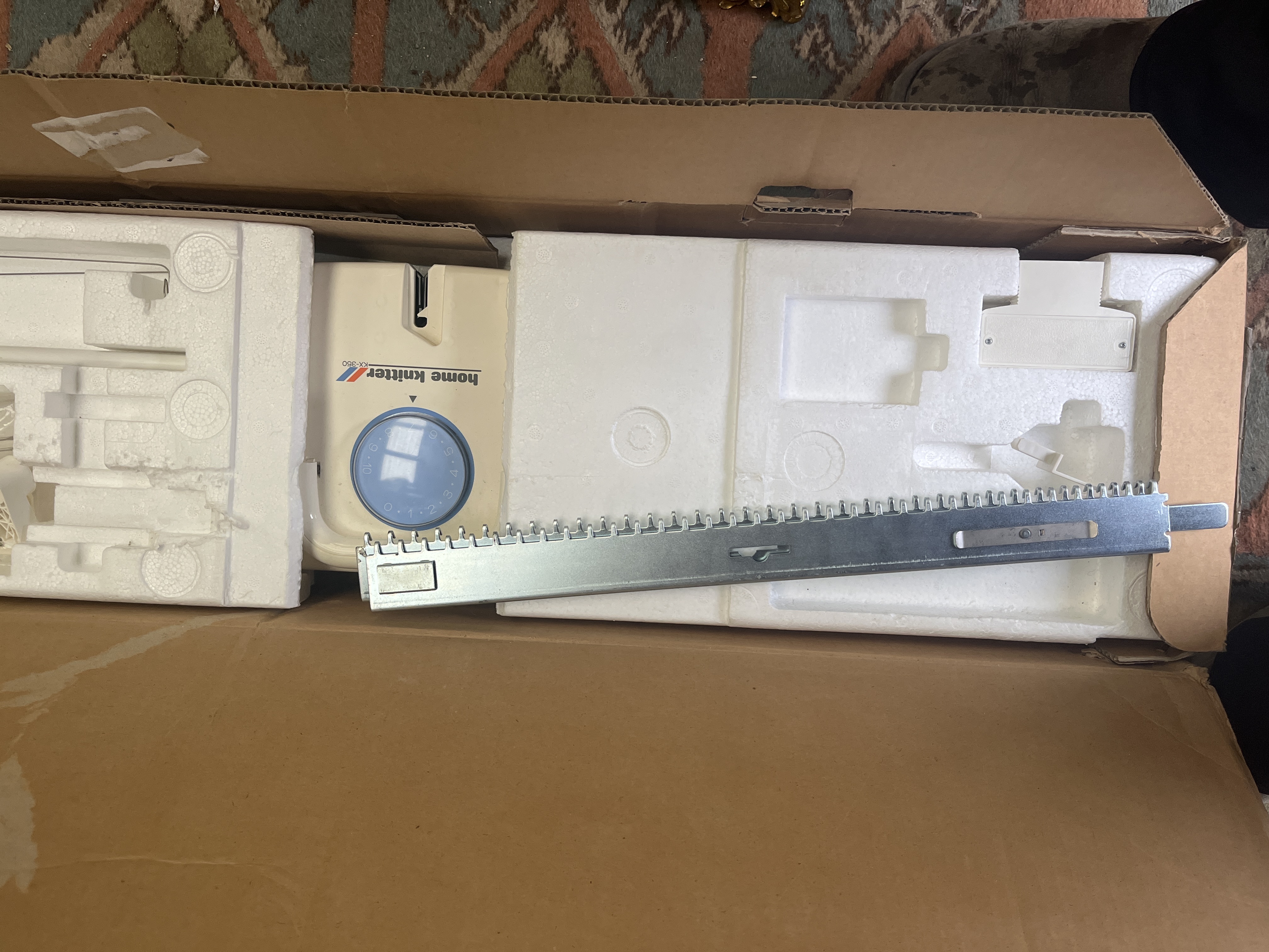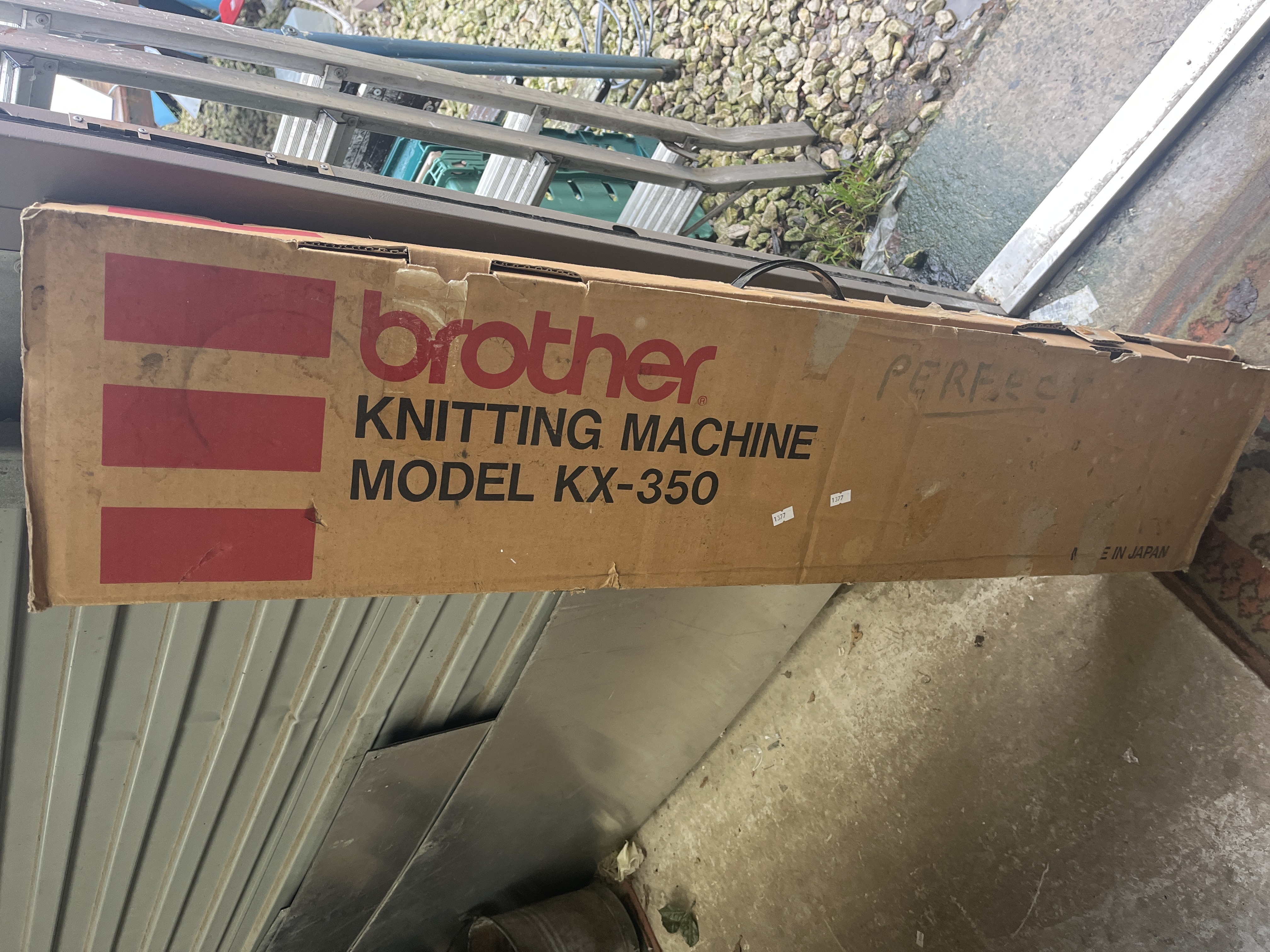 A vintage Brother Model KX-350 Home Knitter knitting machine, manufactured in Japan. The assembly includes a cream-colored plastic carriage with a blue tension dial, a metal needle bed section, and various auxiliary tools and rods. The components are secured within original white polystyrene protective inserts. The machine is contained within its original printed cardboard shipping box, which features the manufacturer’s branding and model identification.