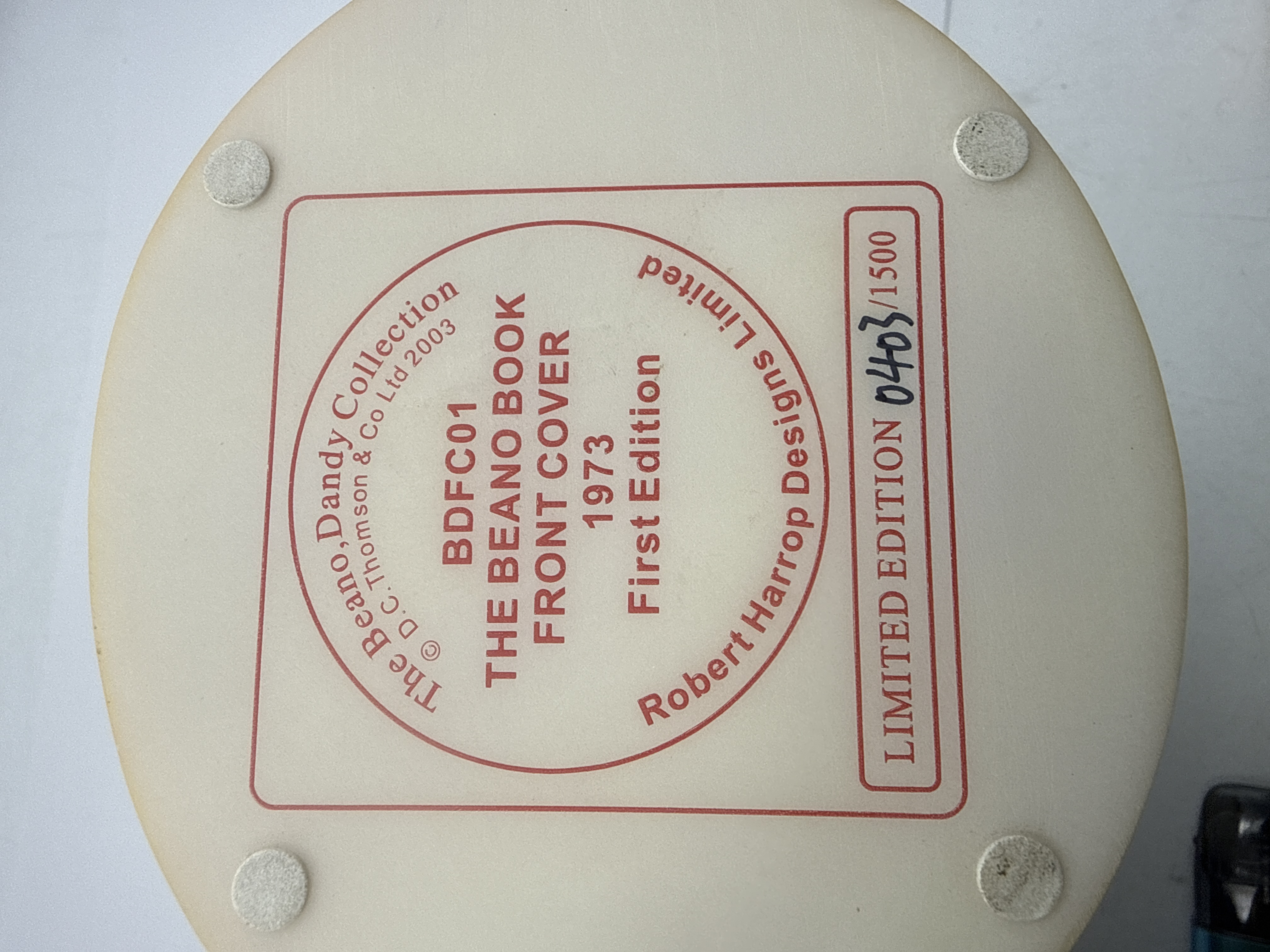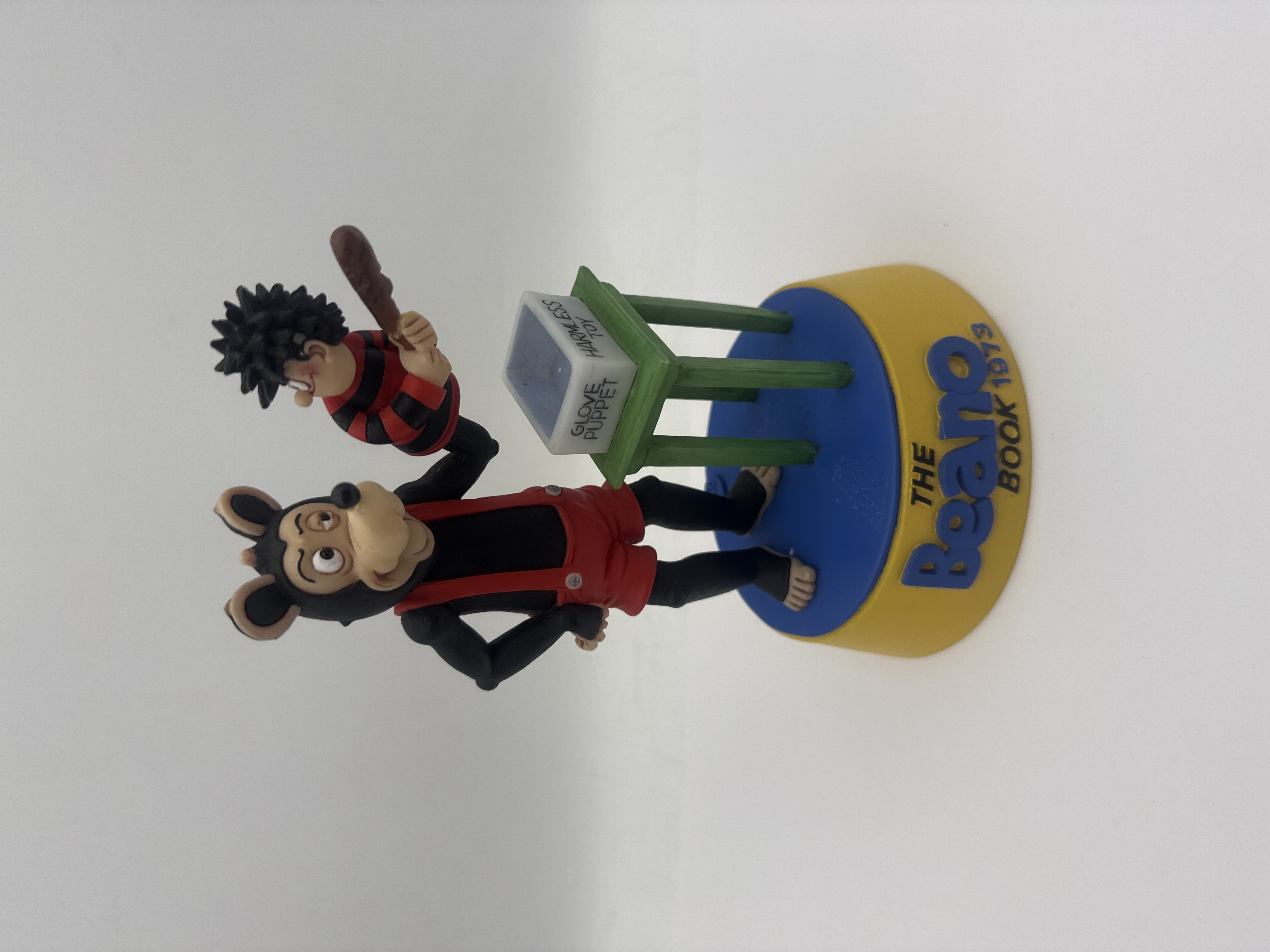 A Robert Harrop resin figurine from The Beano Dandy Collection, model BDFC01, providing a three-dimensional recreation of the 1973 Beano Book front cover. The piece features the character Dennis the Menace holding a club behind a green table with a box labeled GLOVE PUPPET HARMLESS TOY, while Gnasher stands alongside wearing red shorts. The circular base is finished in blue and yellow with raised lettering reading THE Beano BOOK 1973. This collectible piece stands 7 inches tall. The underside bears a first-edition printed label for Robert Harrop Designs Limited, dated 2003, and is hand-numbered 0403 from a limited edition of 1500.