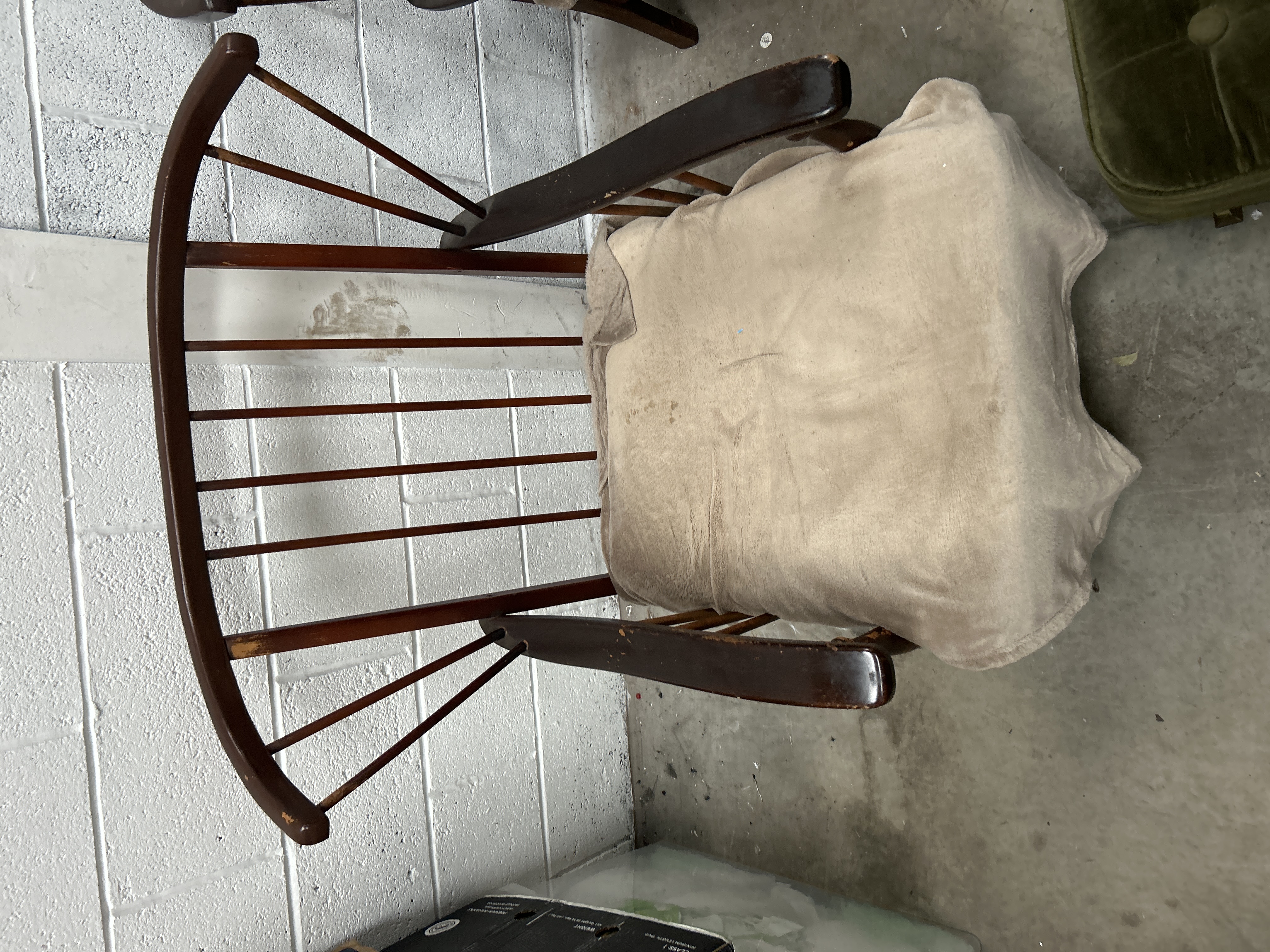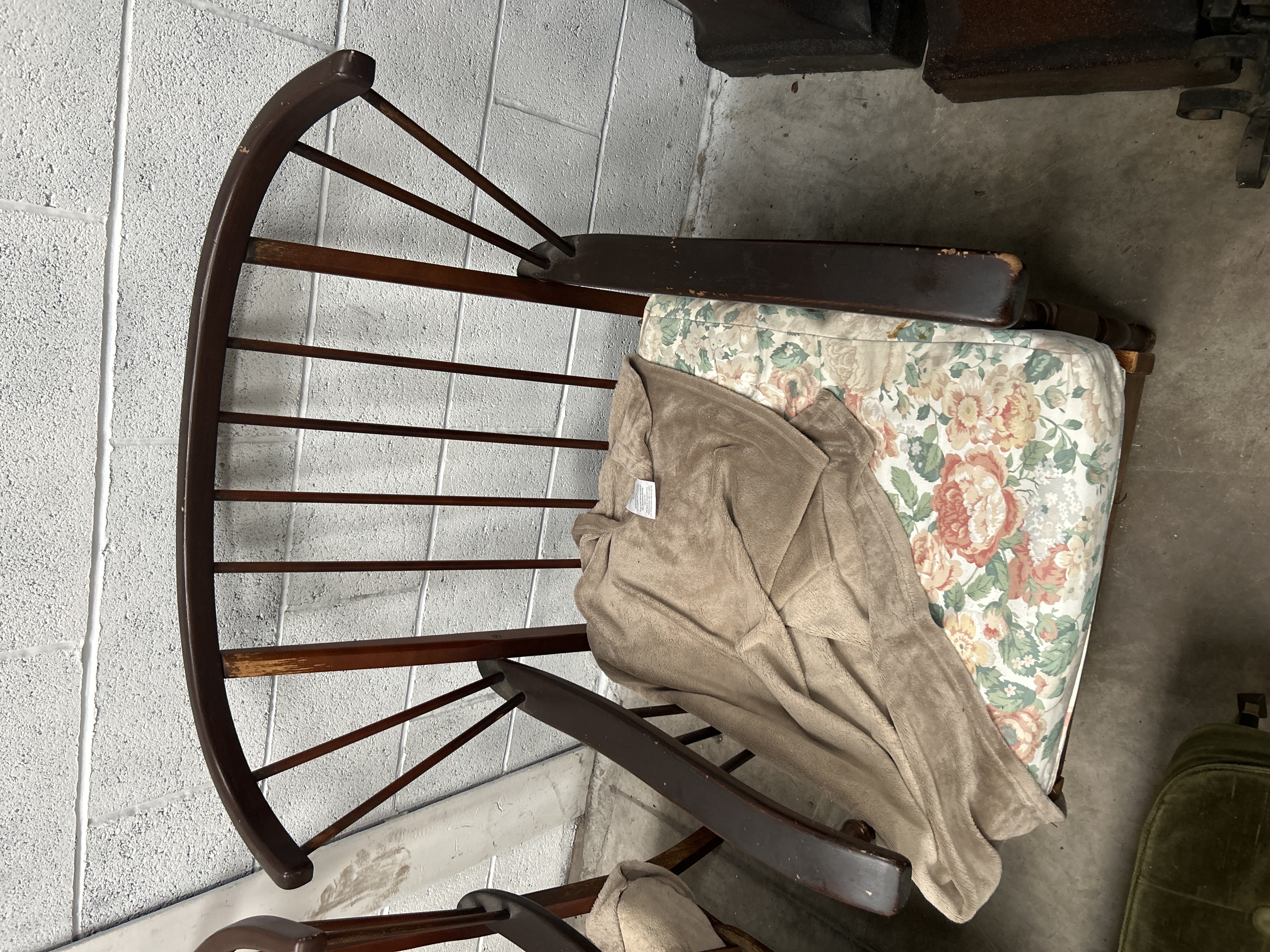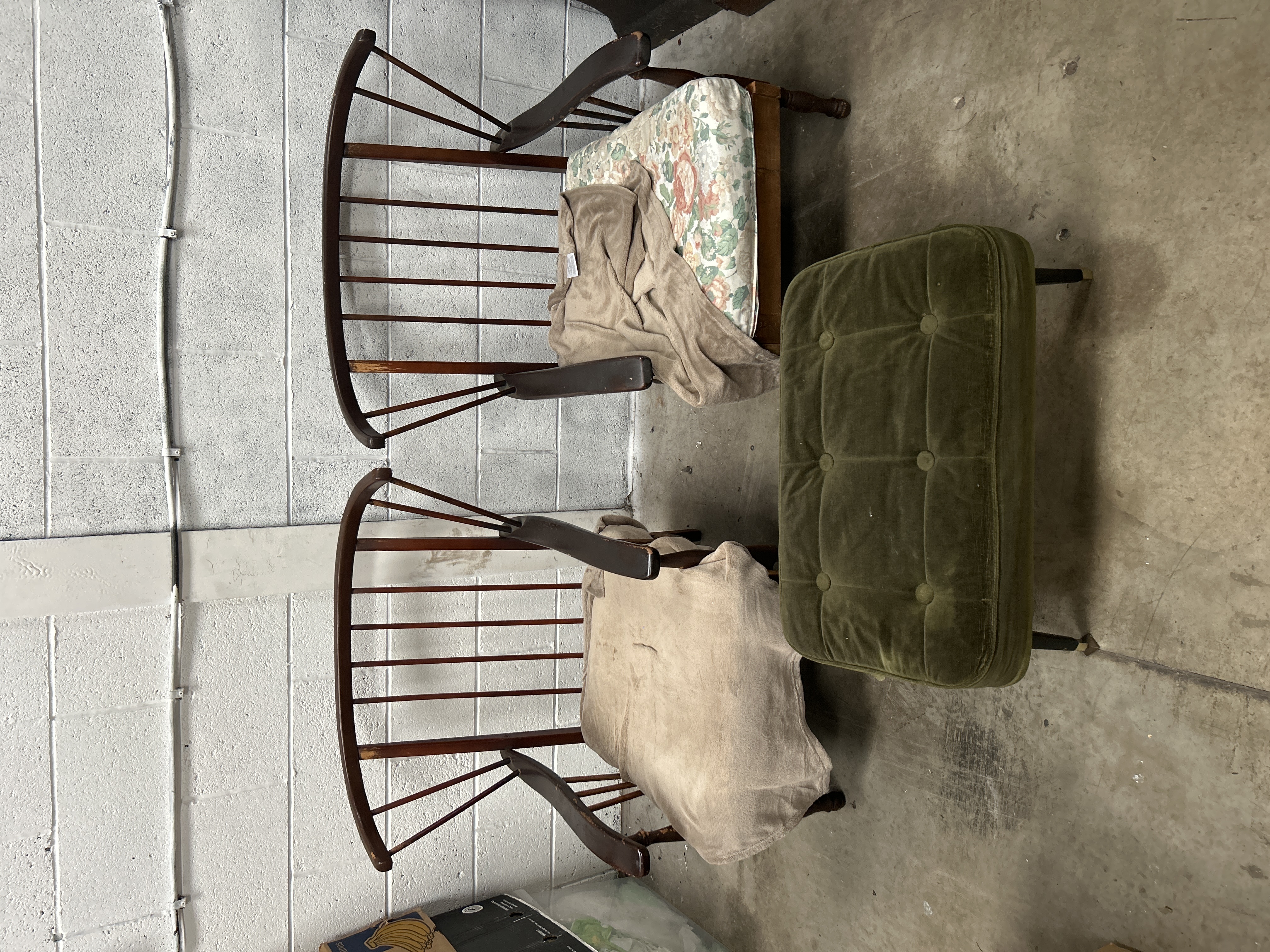 A trio of mid-century modern style furniture items comprising spindle-back armchairs and a rectangular ottoman. The armchairs feature dark-stained wood frames with curved crest rails, multiple vertical spindles, and wide, flat armrests. The seating is upholstered with a floral-patterned fabric, currently shown with tan fabric covers draped over the cushions. The companion ottoman is upholstered in olive green tufted velvet and stands on four dark tapered legs with metallic-colored tips.