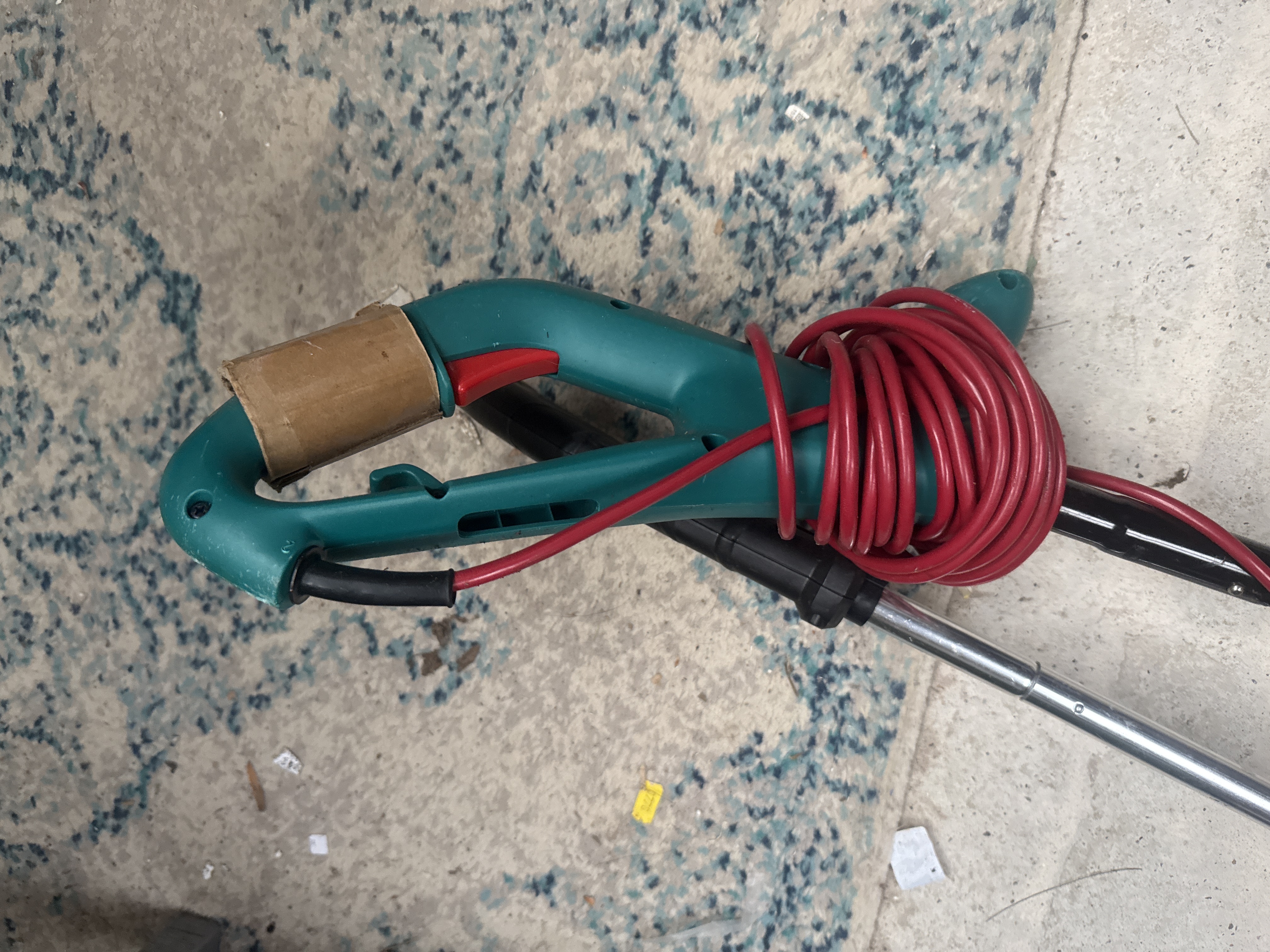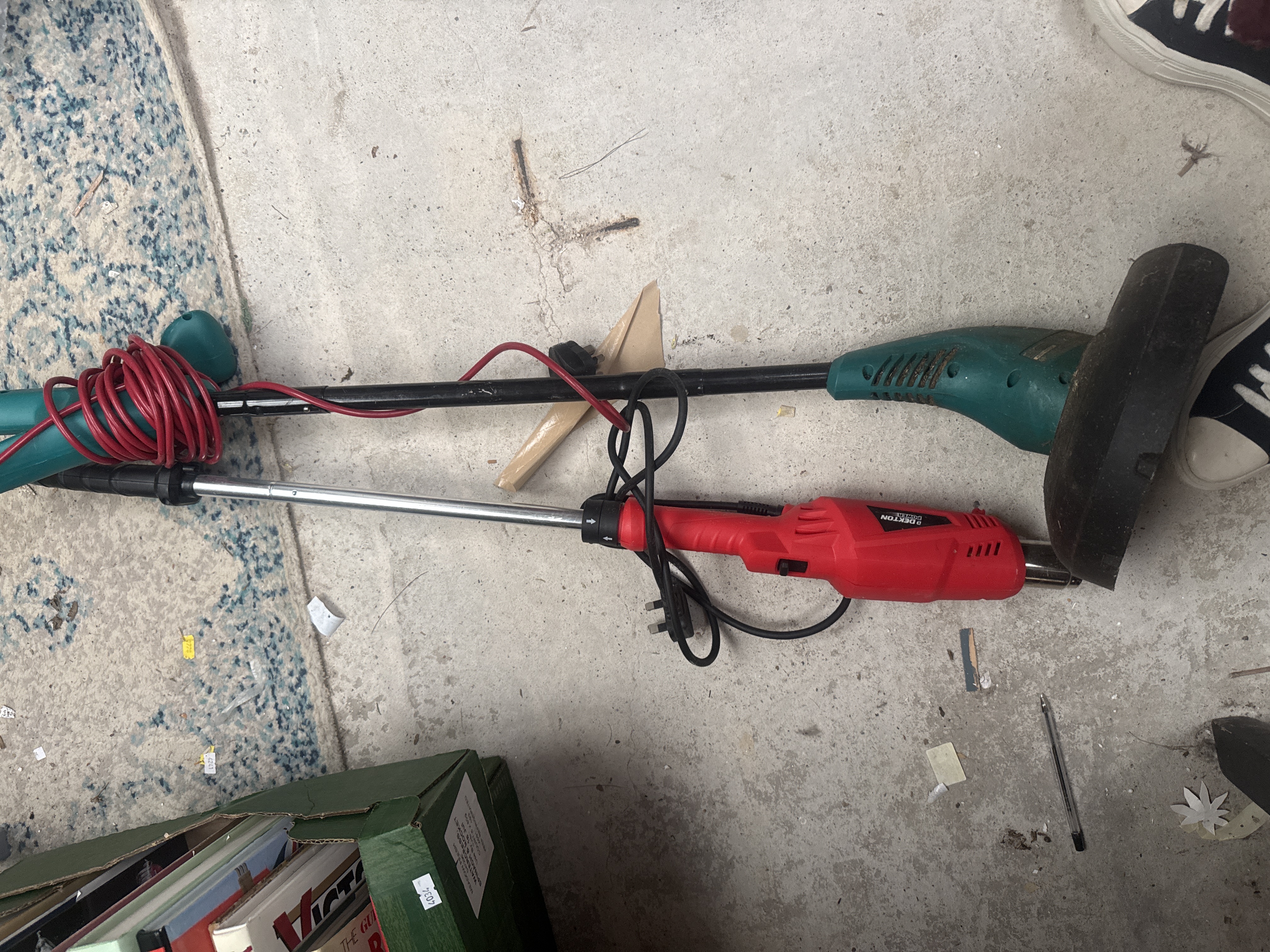 Two corded electric garden tools. The lot includes a Dekton Power electric weed burner featuring a red plastic motor housing with manufacturer labeling, an adjustable silver-tone metal extension pole, and a black power cord. Also included is a grass trimmer constructed with a green plastic housing, a black safety guard, and a red trigger mechanism. This unit features a red power cord coiled around the handle. Both tools are equipped with standard UK three-pin plugs.