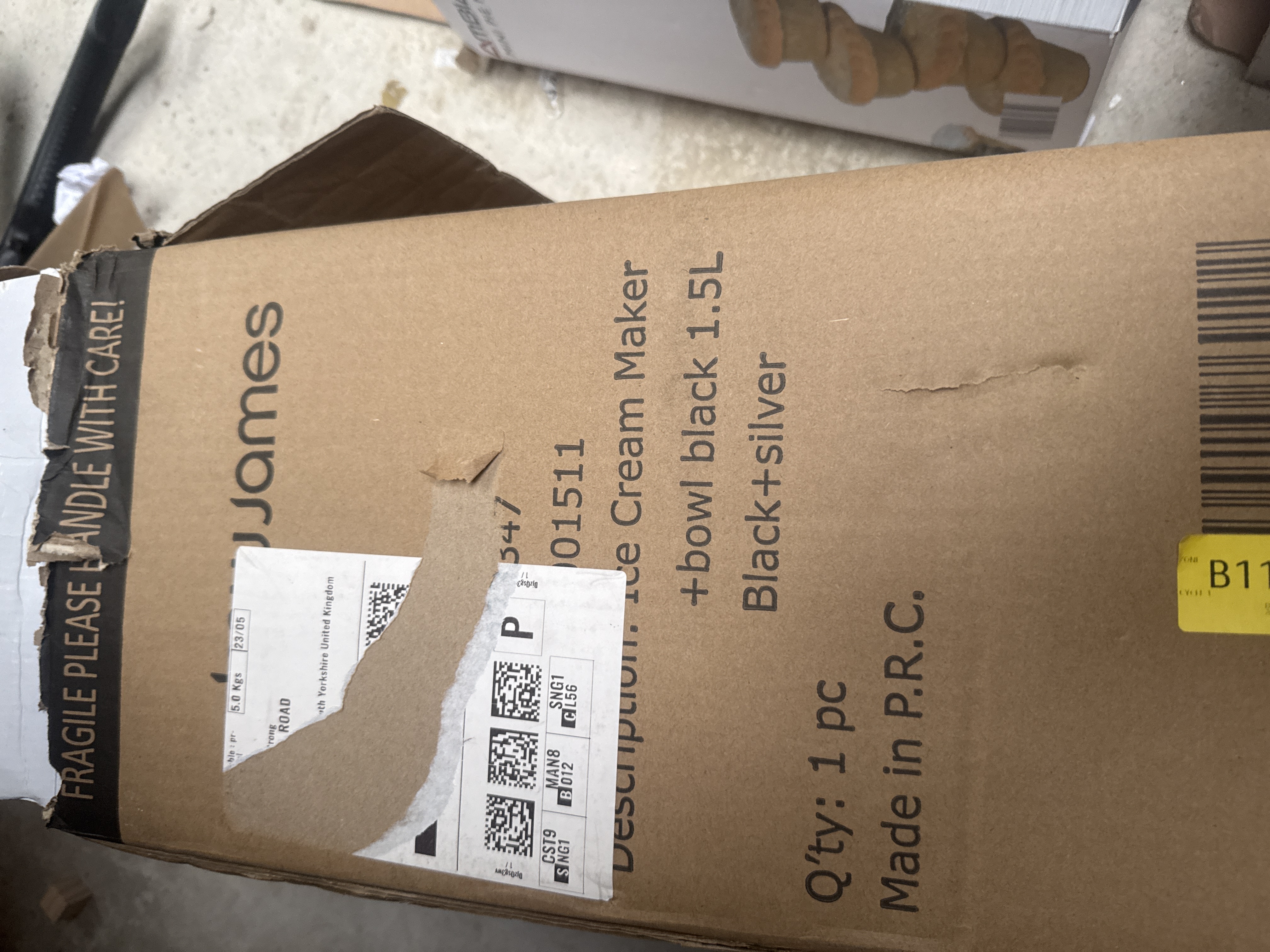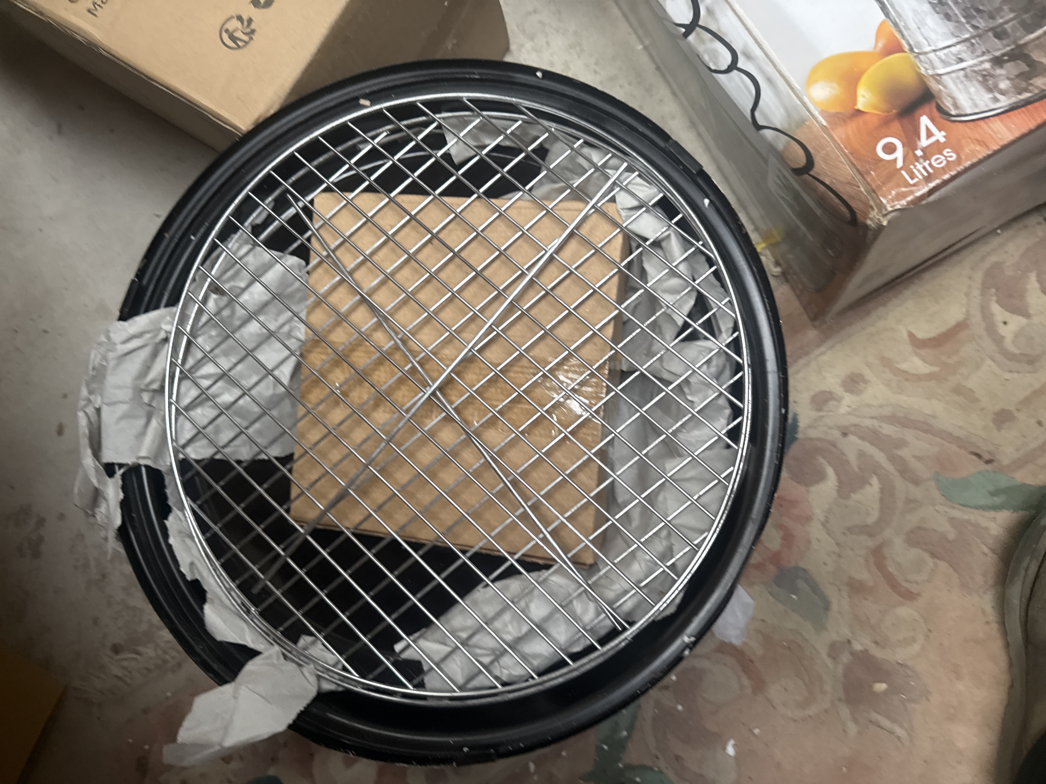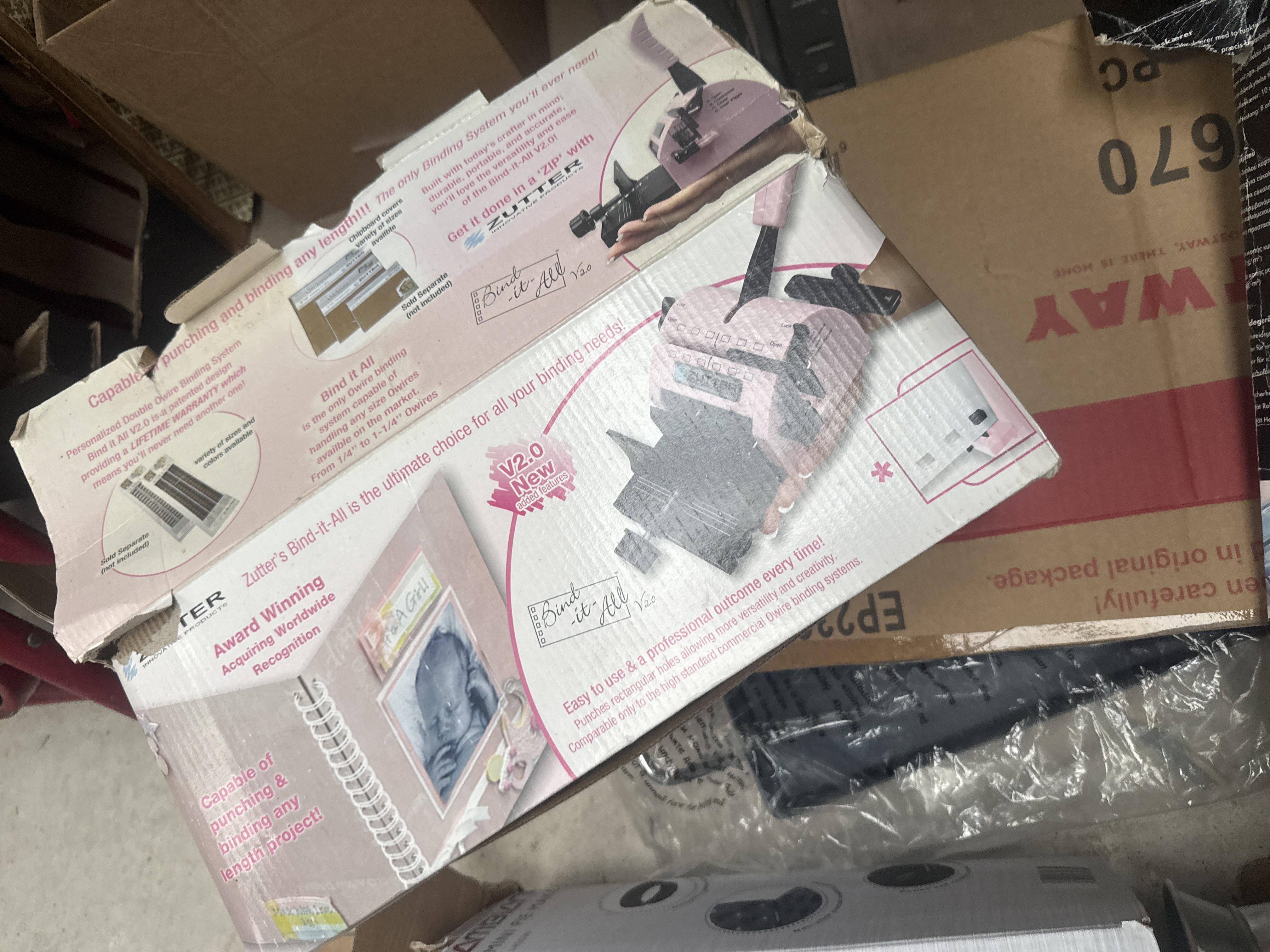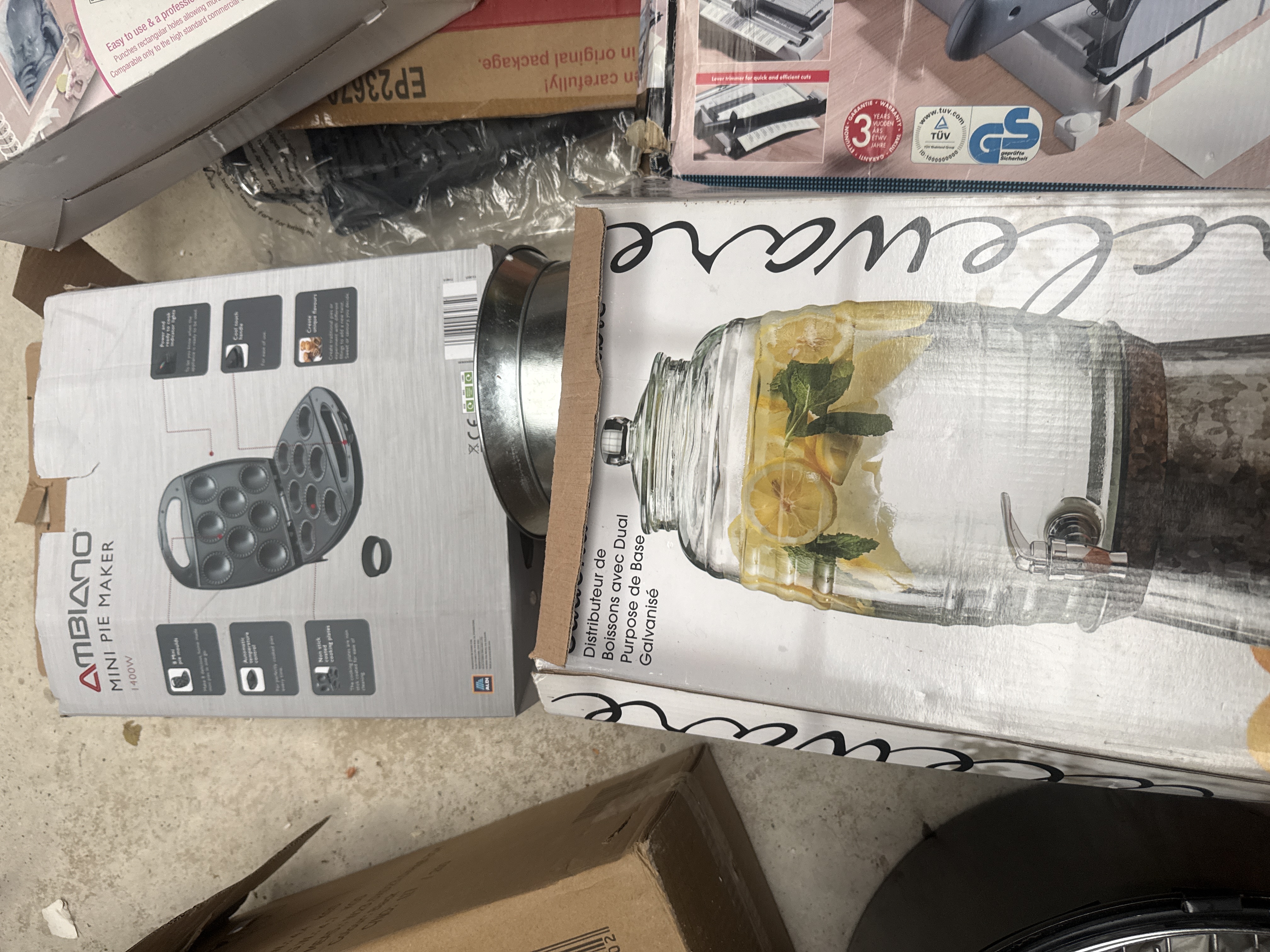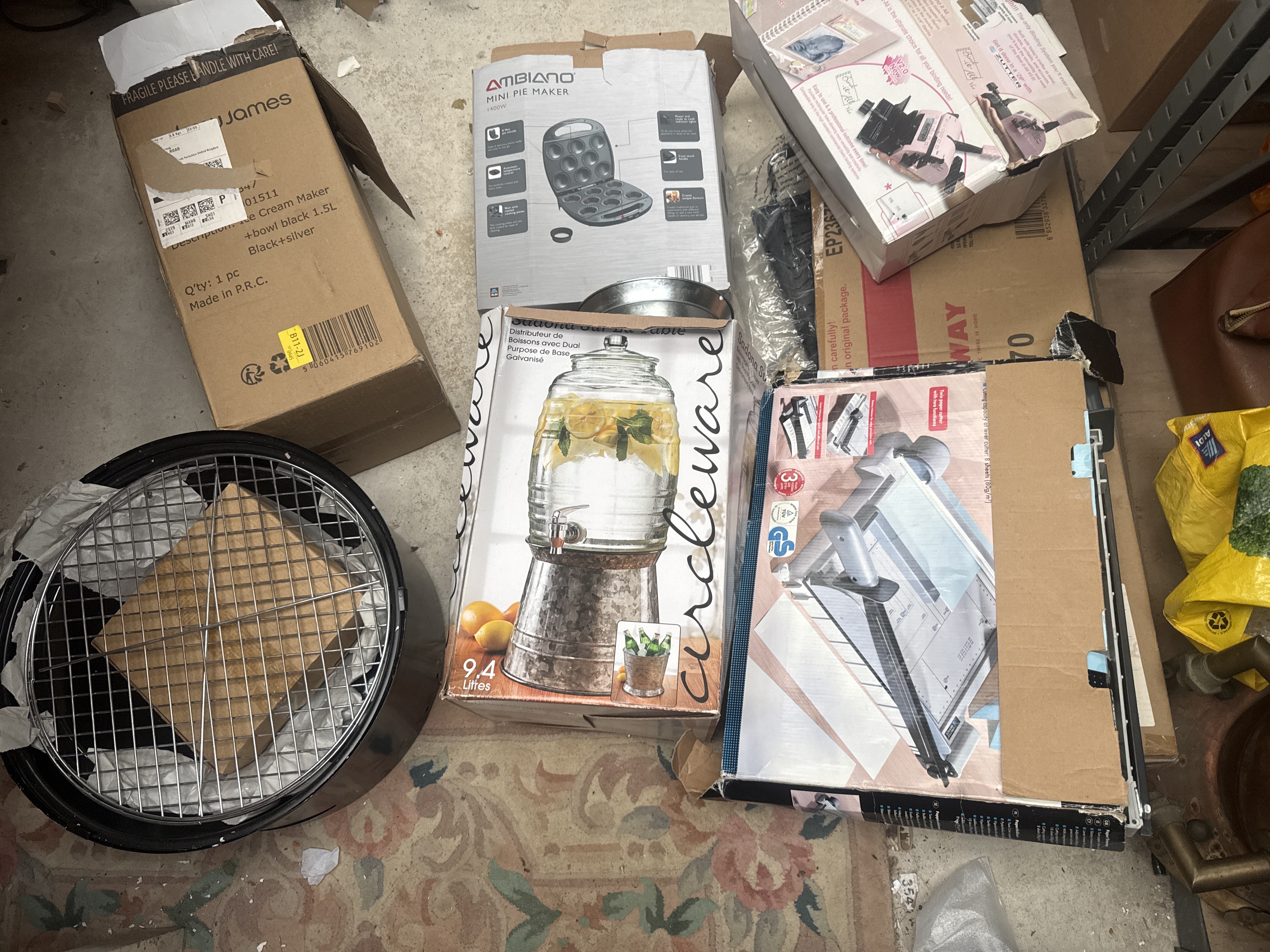 A group of household and crafting items comprising a James 1.5L ice cream maker in black and silver, an Ambiano 1400W mini pie maker, and a Zutter Bind-it-All V2.0 double O-wire binding system. The lot also includes a Circleware 9.4-liter glass beverage dispenser with a galvanized metal base, a manual precision guillotine paper cutter, and an unboxed circular black metal fire pit with a wire grate. Most items are housed in their original retail packaging.