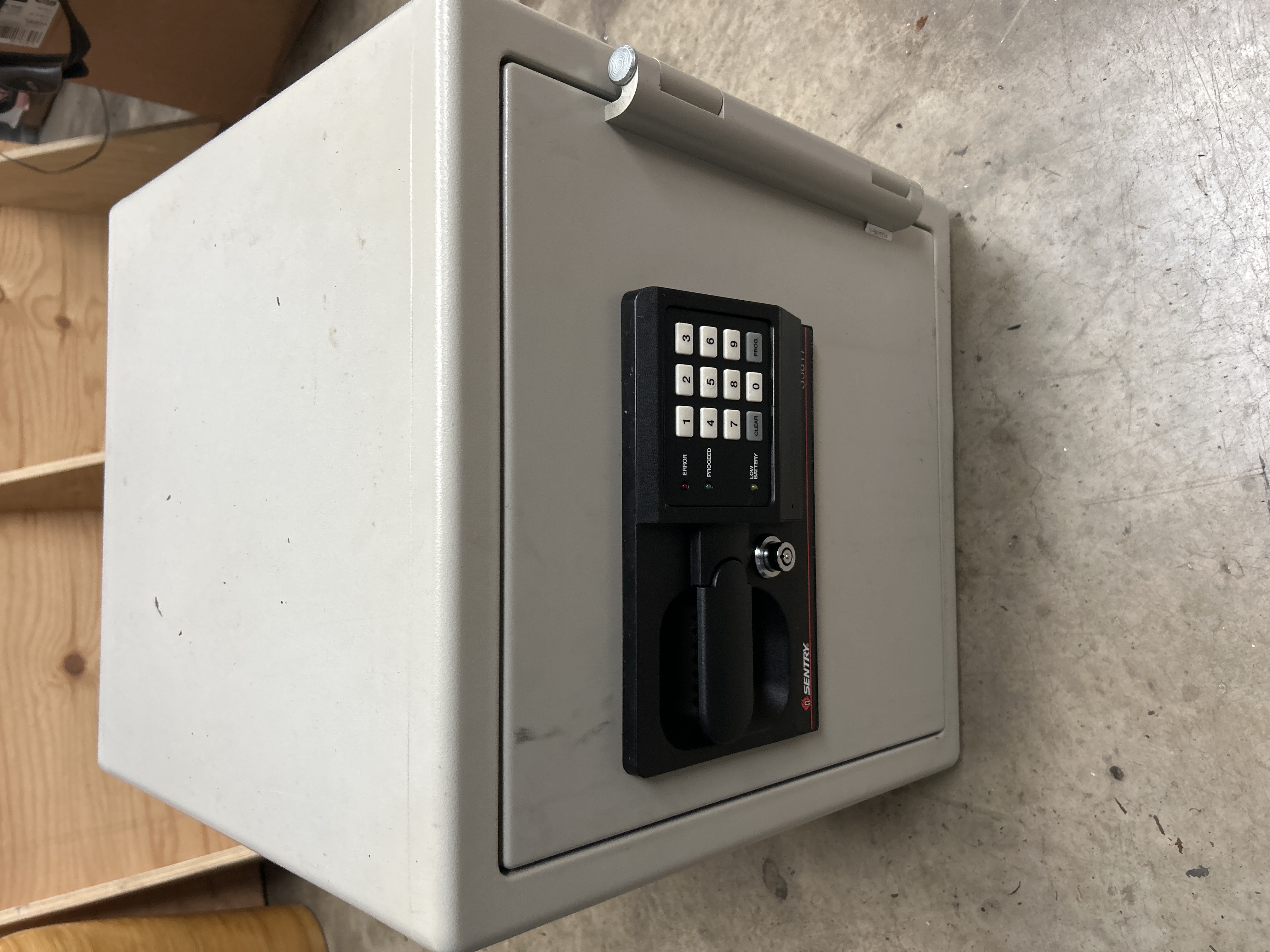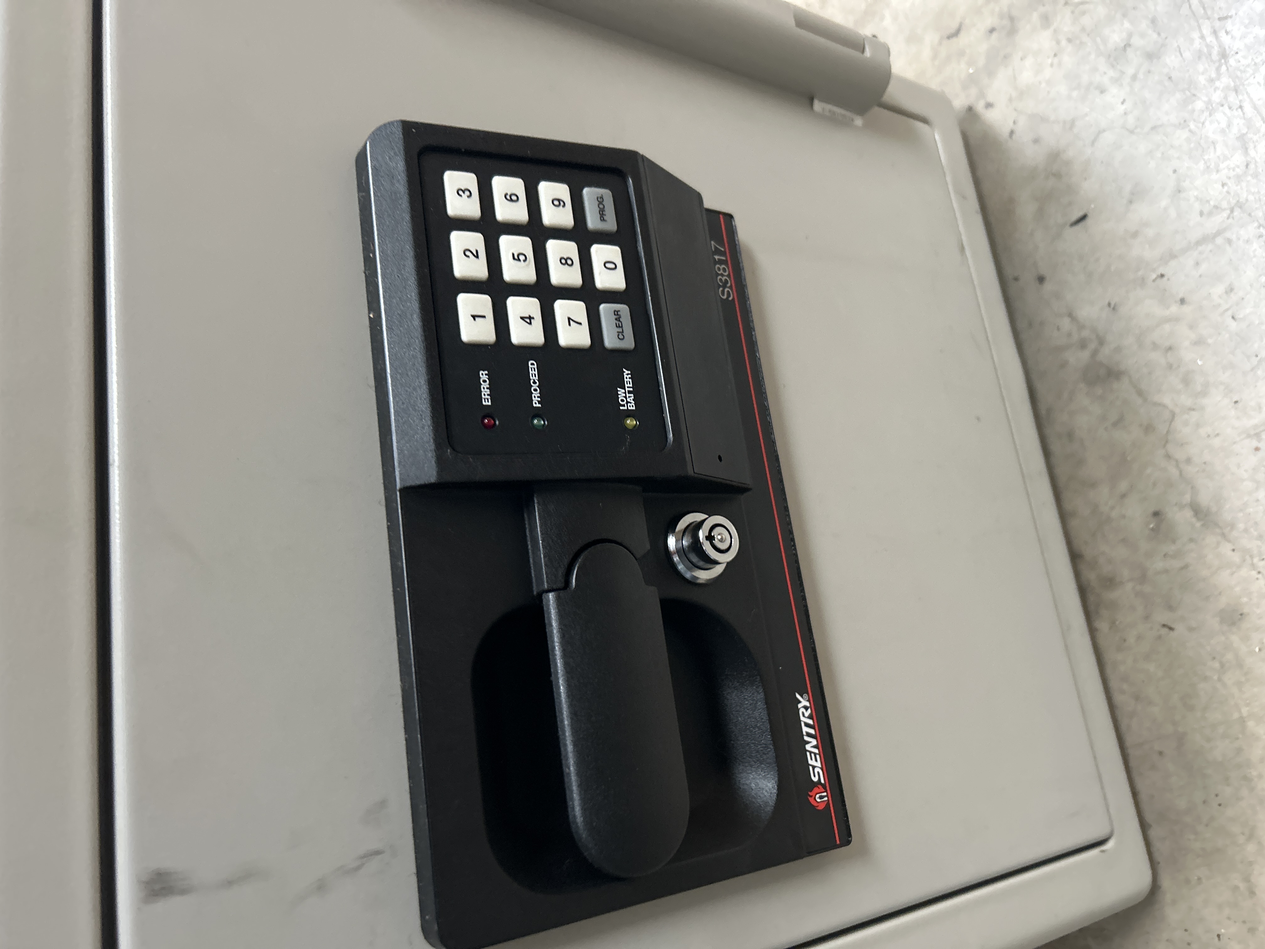 A Sentry model S3817 fire-resistant security safe featuring a gray finished metal body and a front-loading door. The unit is equipped with a black electronic control panel that includes a numeric keypad, a manual key override lock, and a recessed pull handle. The interface displays status indicator lights for error, proceed, and low battery alerts. The Sentry brand name and model number S3817 are clearly marked on the front panel.