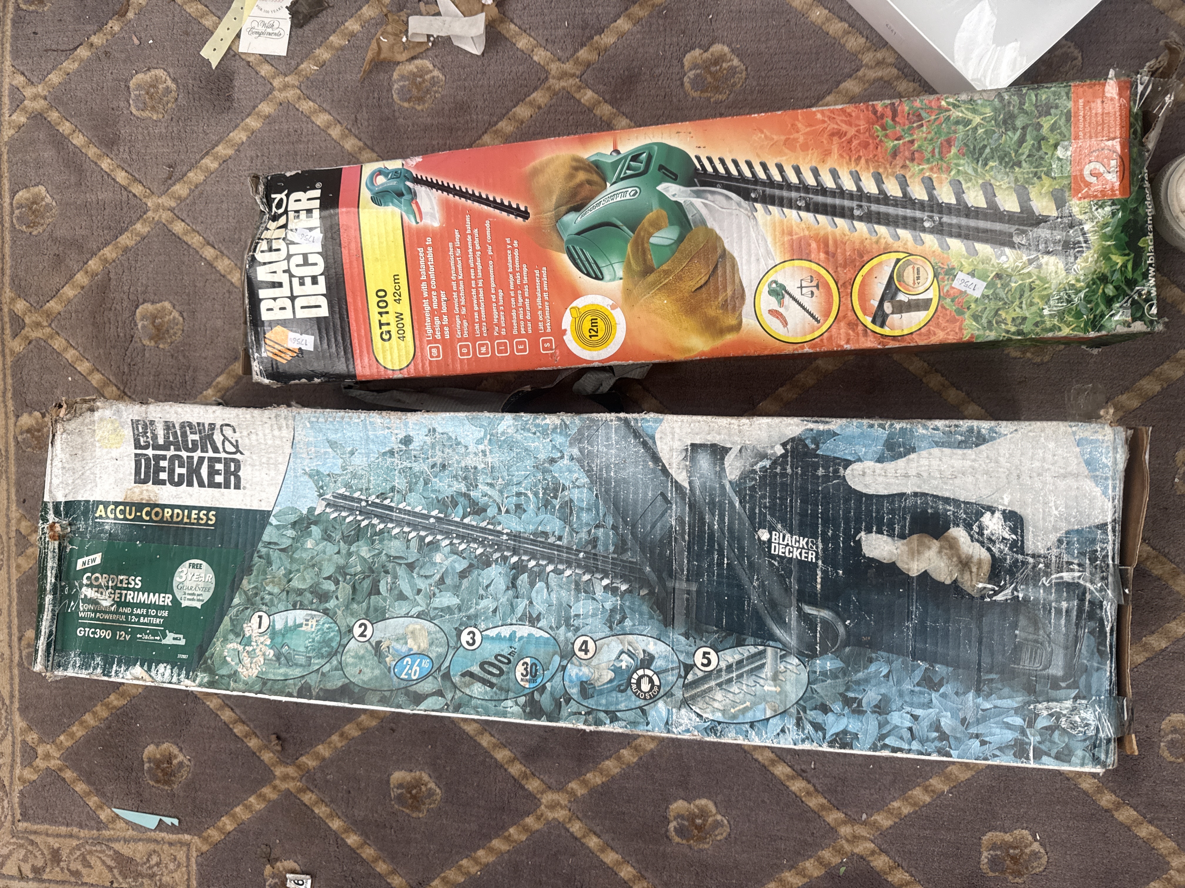 A group of two Black & Decker hedge trimmers including a corded GT100 model and an Accu-Cordless GTC390 model. The GT100 is specified as 400W with a 42cm blade. The GTC390 is a 12v cordless unit. Both items are contained within their original printed cardboard retail boxes.