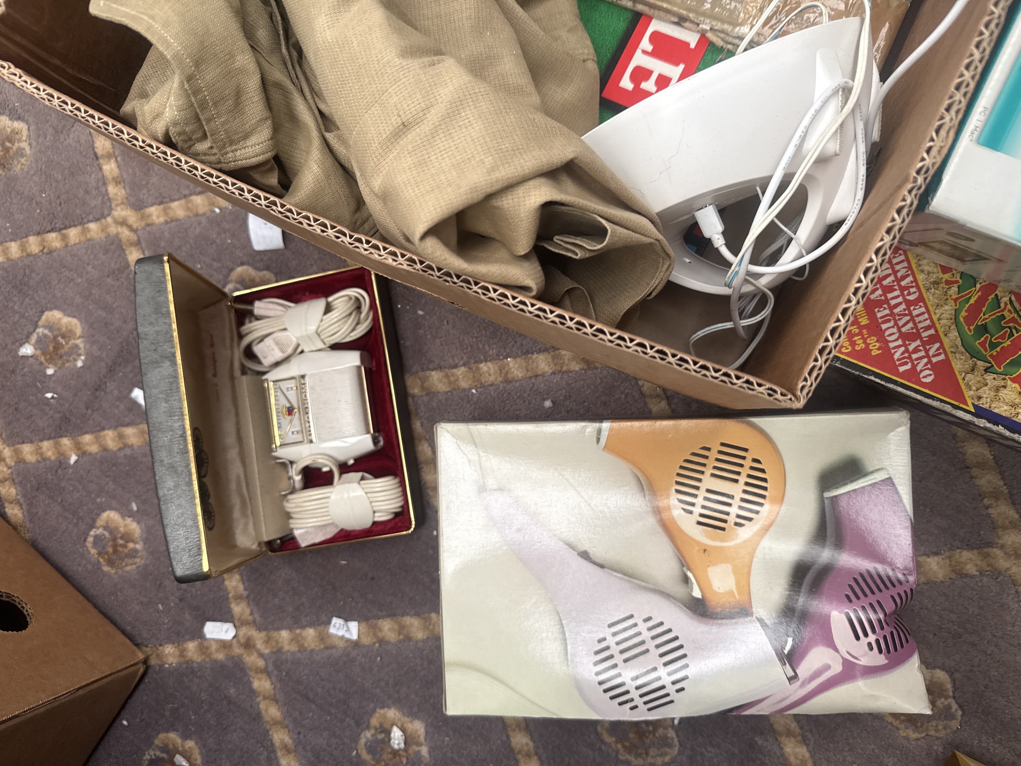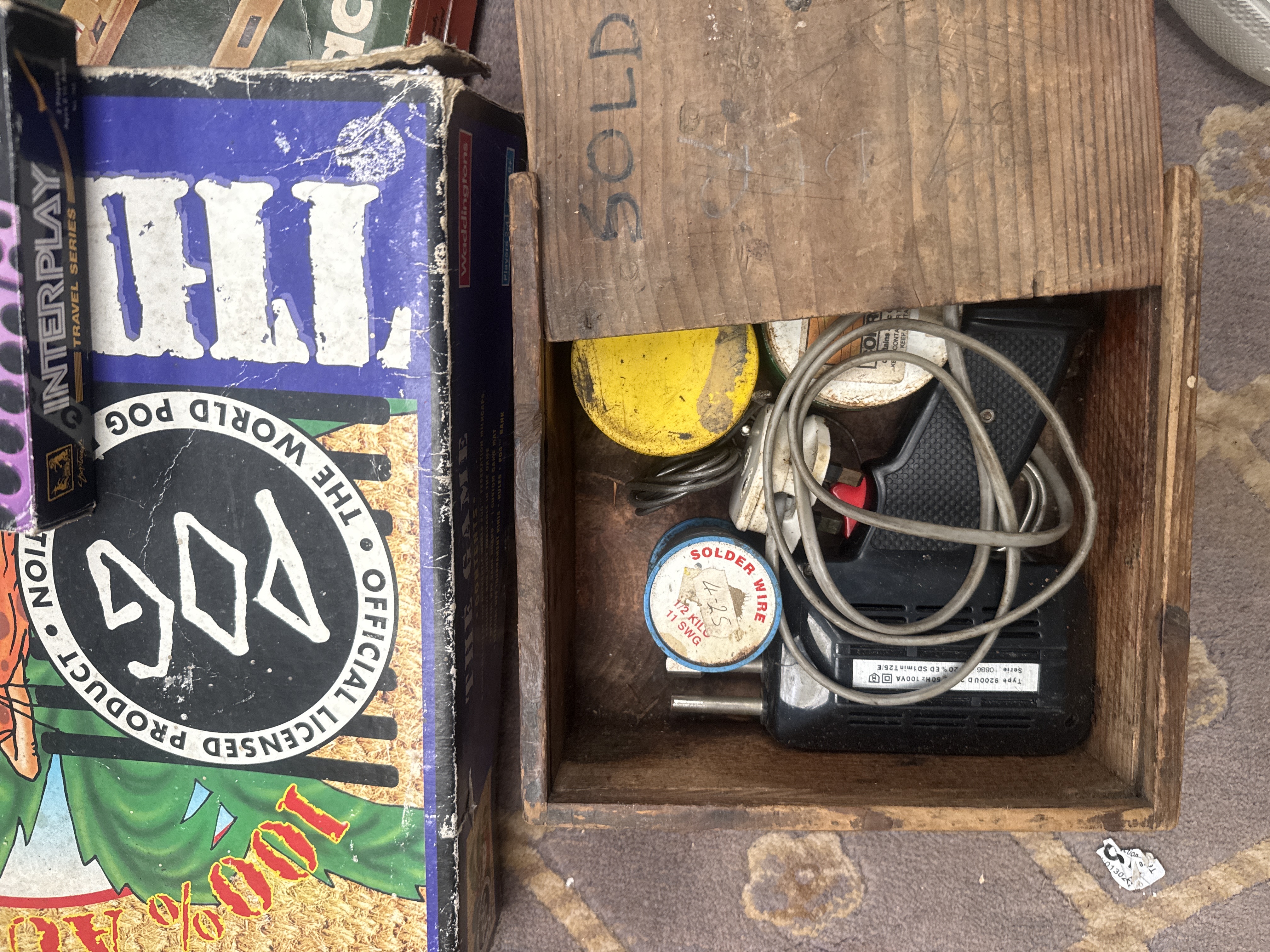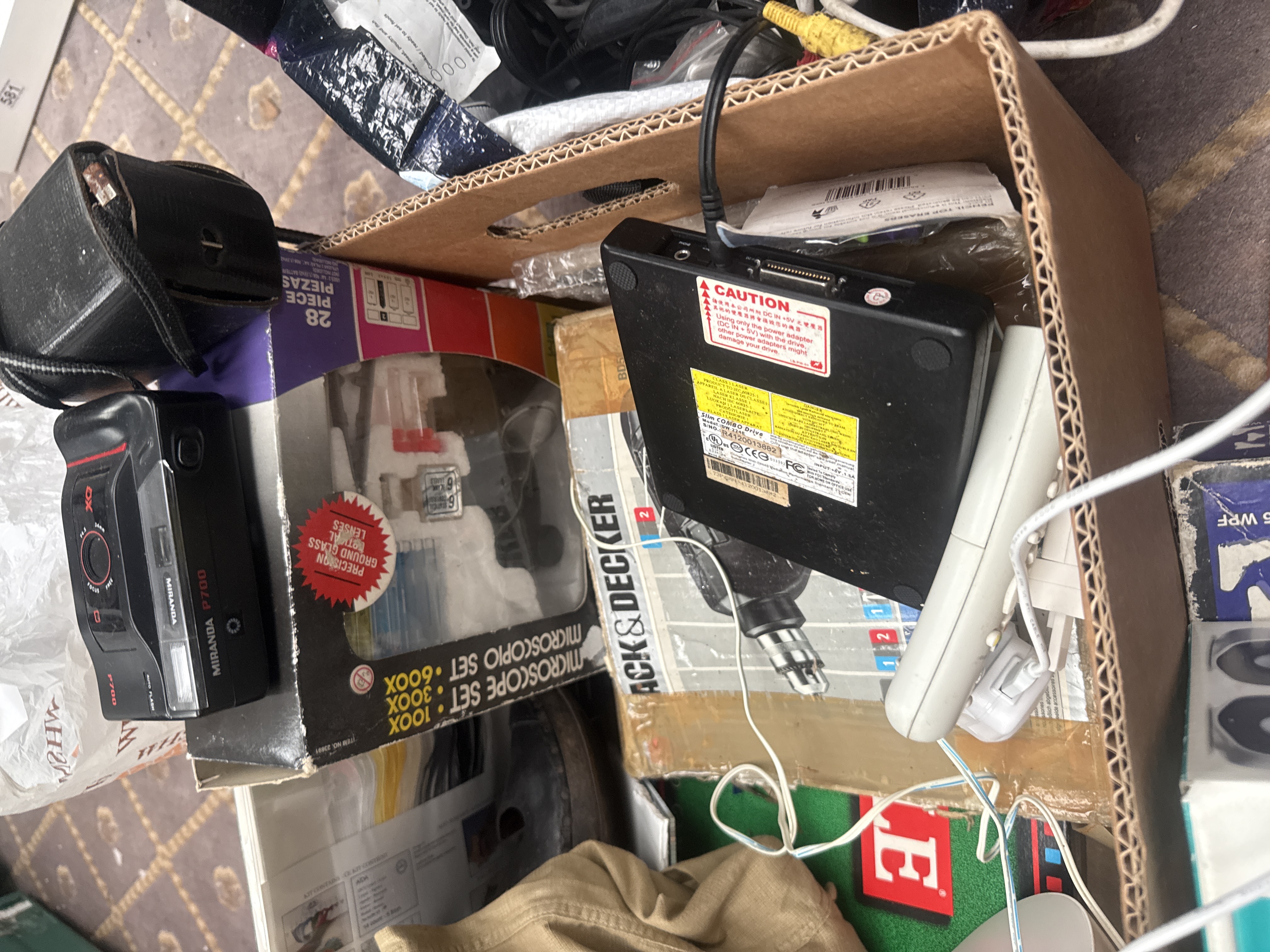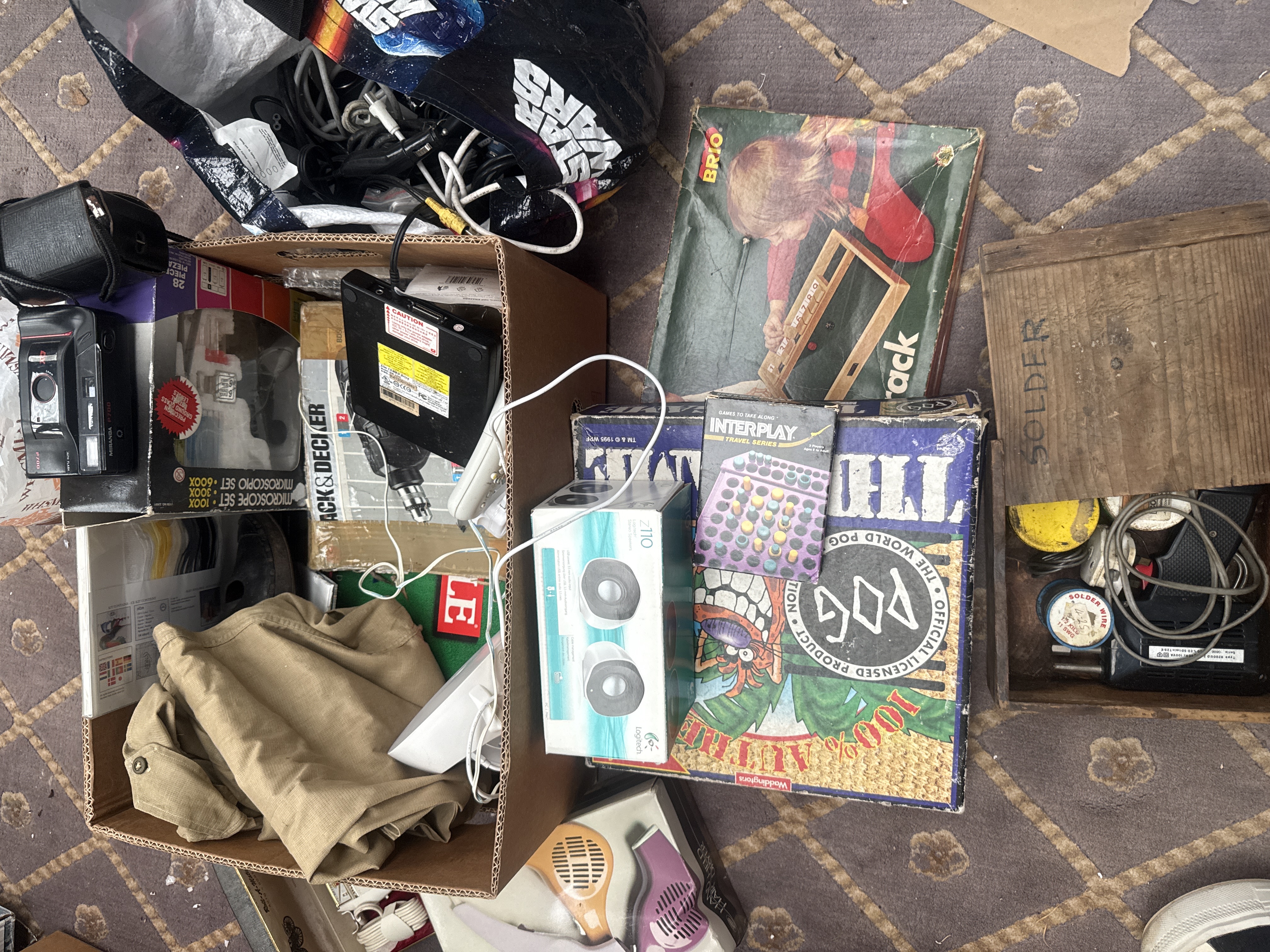 An assortment of late 20th and early 21st-century household goods, electronics, and toys. The collection features a Miranda P700 point-and-shoot camera, a Slim COMBO Drive, and boxed Logitech Z110 speakers. Personal care items include boxed hair dryers, a travel iron, and a vintage-style boxed shaver. The lot contains various games and educational sets, notably The World POG Federation board game, an Interplay travel series game, and a boxed microscope set. Tools are represented by a wooden box labeled SOLDER containing a soldering gun and accessories, alongside a Black and Decker drill box. Additional items include khaki trousers and a Star Wars branded bag. Construction materials primarily consist of molded plastic, metal components, and cardboard packaging.