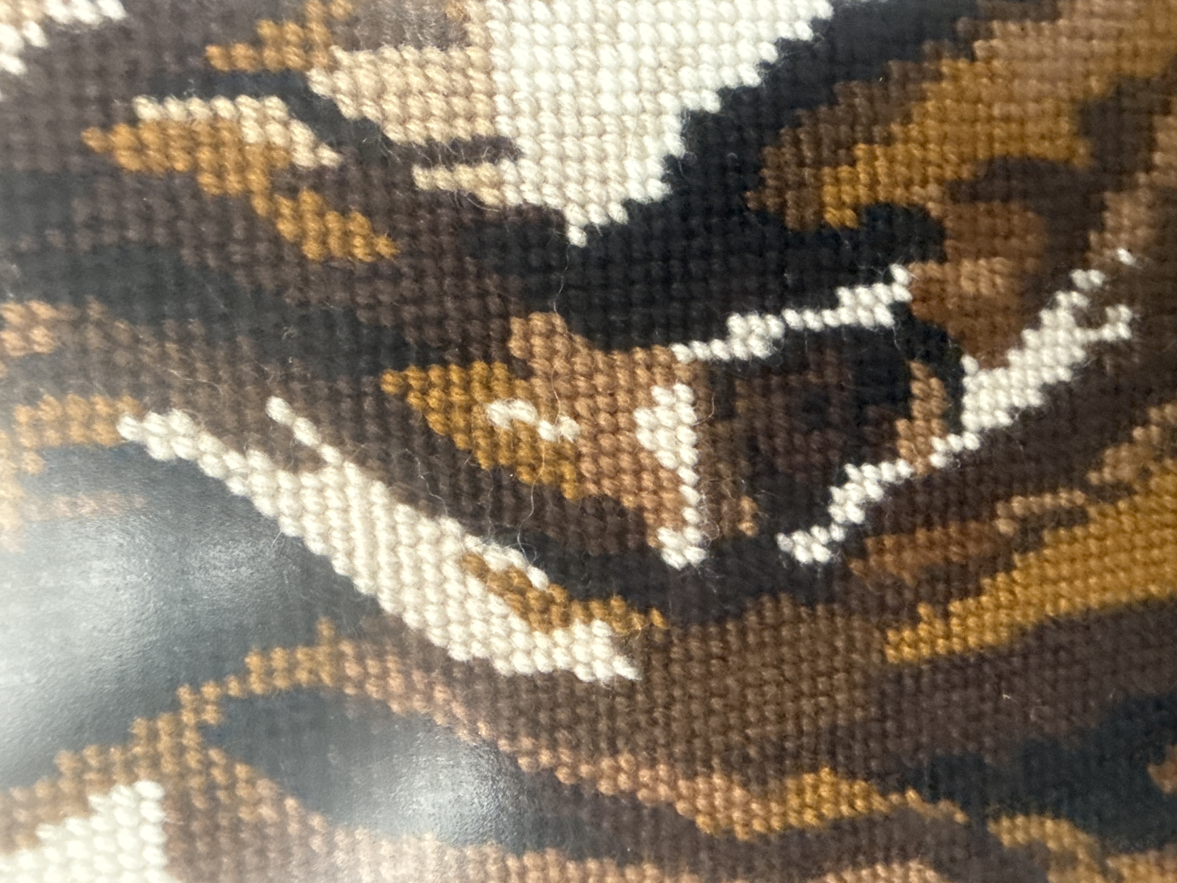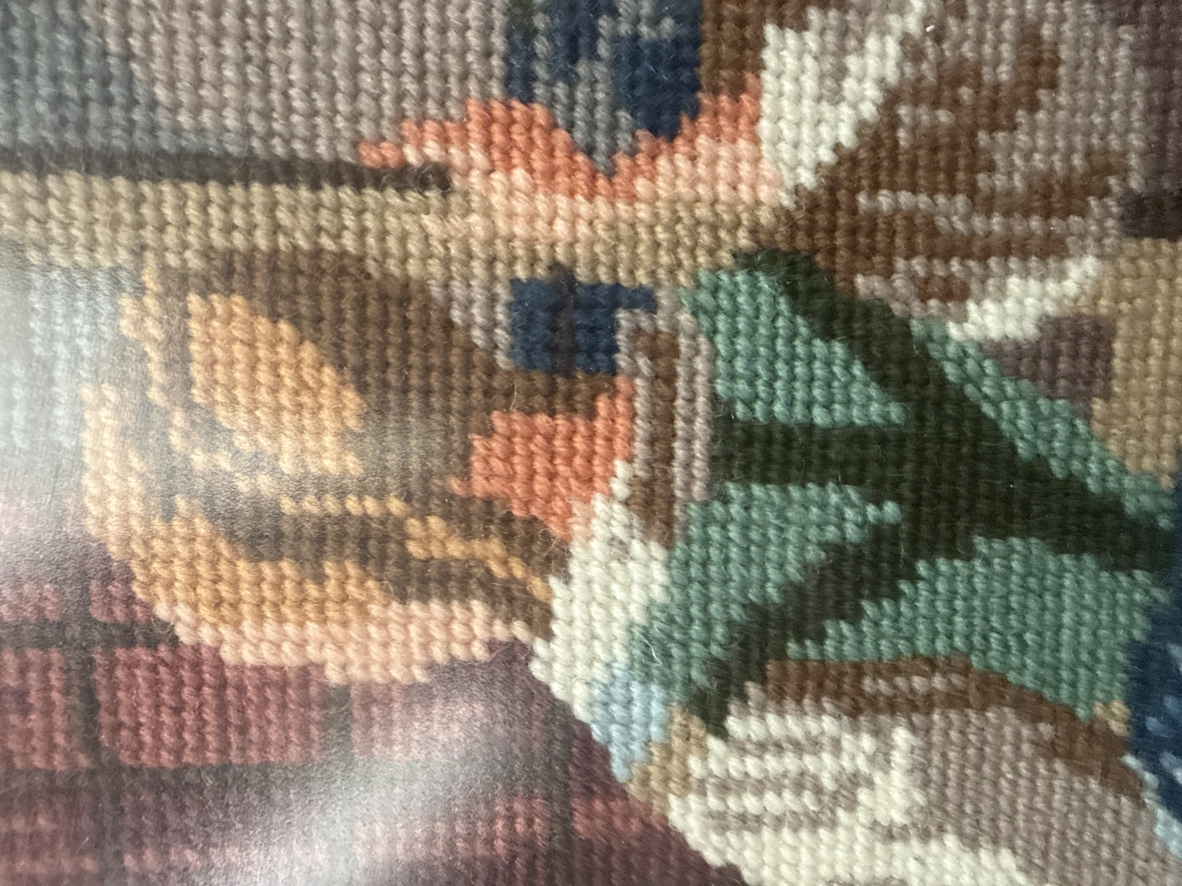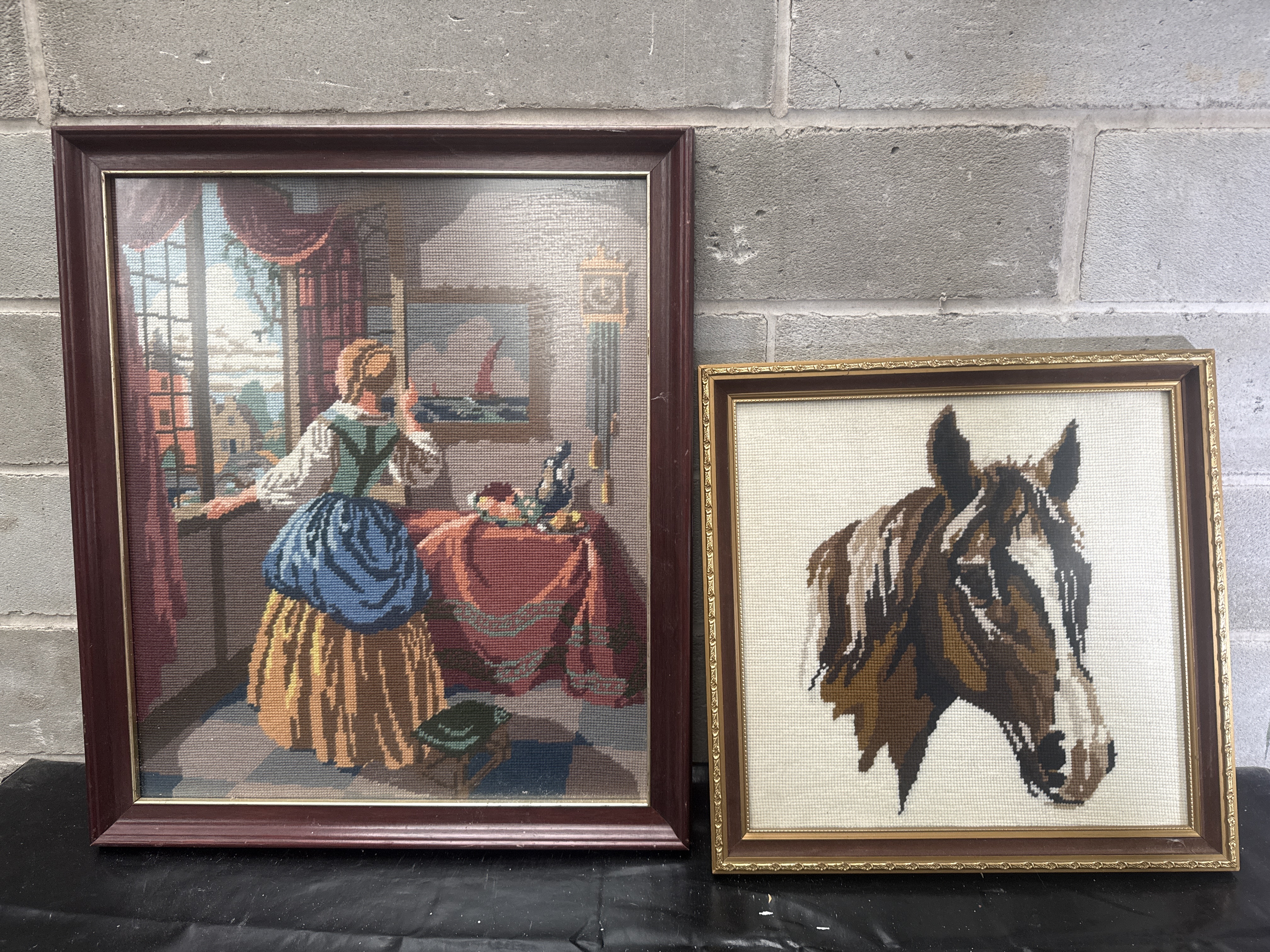 A pair of framed needlepoint artworks. One piece is a Wiehler Gobelin depicting a traditional European domestic interior scene with a woman in a blue and yellow dress looking out a window. The composition includes a checkerboard floor, a grandfather clock, and a table with fruit. The second piece is a portrait of a horse’s head rendered in shades of brown, black, and white against a cream background. Both items are constructed with dense, uniform yarn stitching on canvas. The interior scene is housed in a dark-stained wooden frame with a gold-toned inner border. The horse portrait is set within an ornate gilt and wood frame.