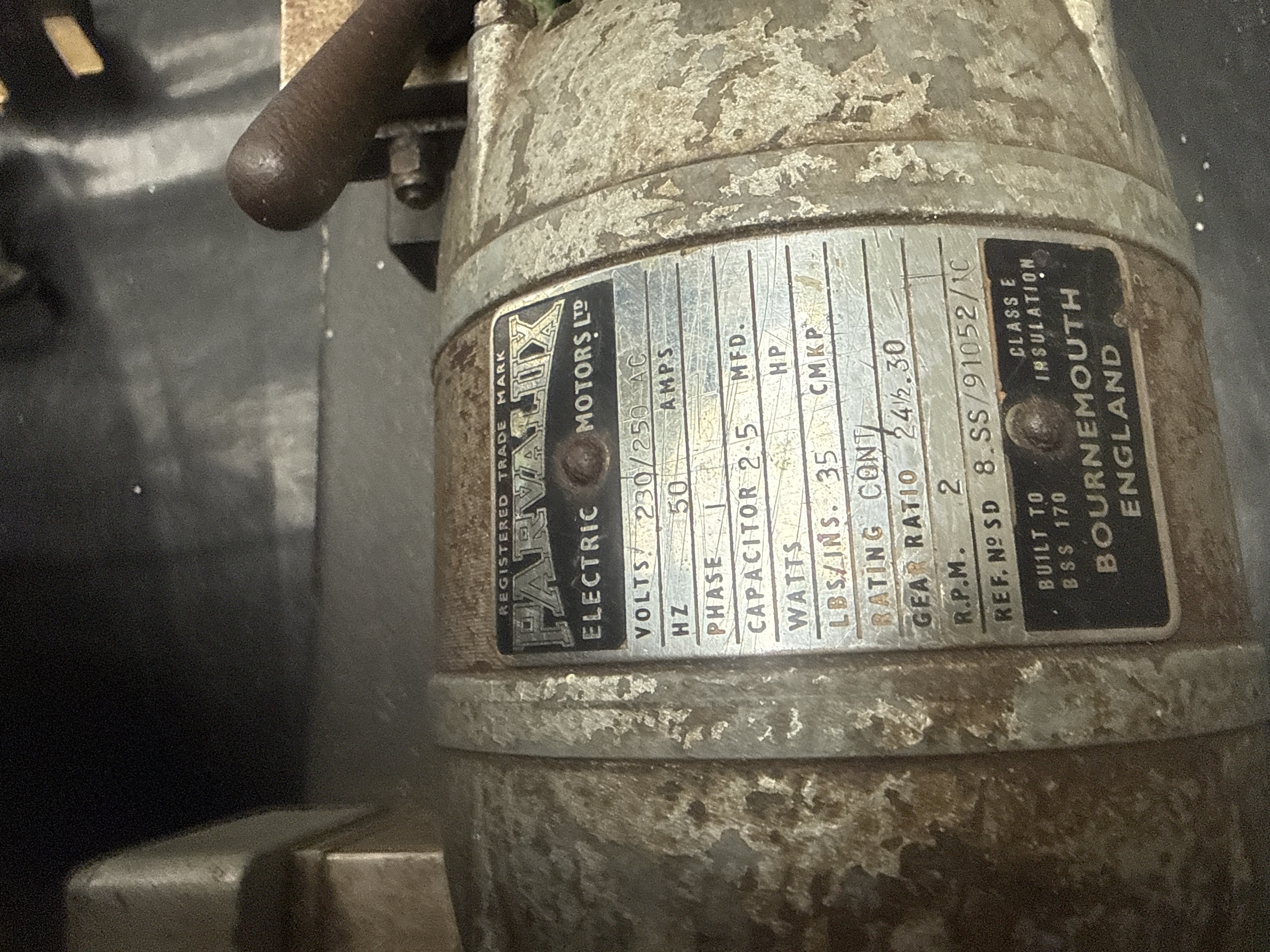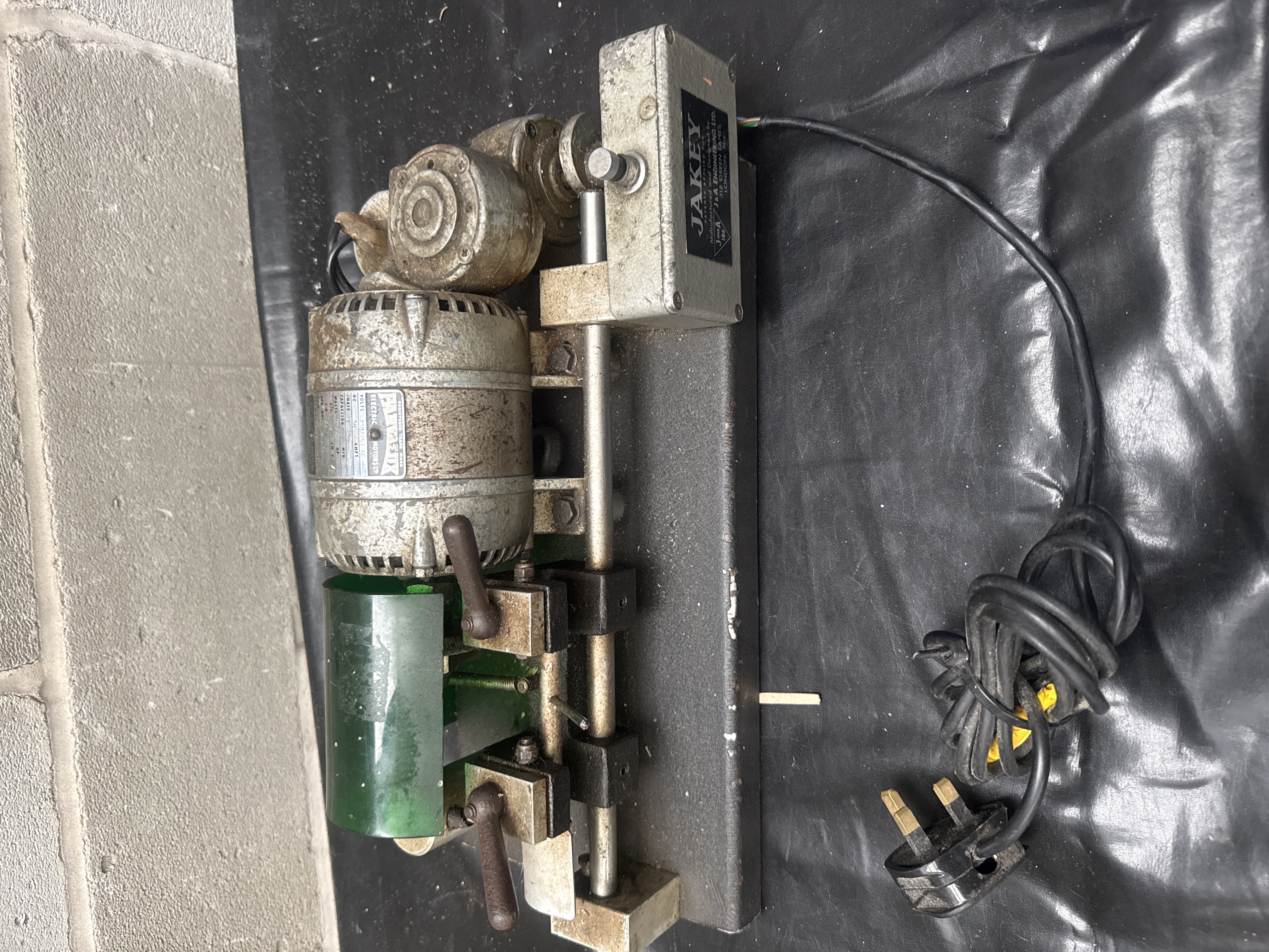 A vintage industrial key-cutting machine marketed under the brand name Jakey, manufactured by J and A Engineering Ltd. of 318 Green Lanes, London, N.4. The unit is powered by a Parvalux Electric Motors Ltd. motor from Bournemouth, England. The motor nameplate specifies 230/250V AC operation at 50Hz, single phase, with a 2.5 MFD capacitor. It features an output of 2 RPM and a gear ratio of 24.5:30. The machine is constructed primarily of cast metal with a heavy base and carriage assembly, featuring manual lever controls and a protective green plastic guard. A fixed power cord with a standard UK three-pin plug is attached. The motor is built to BSS 170 standards with Class E insulation.