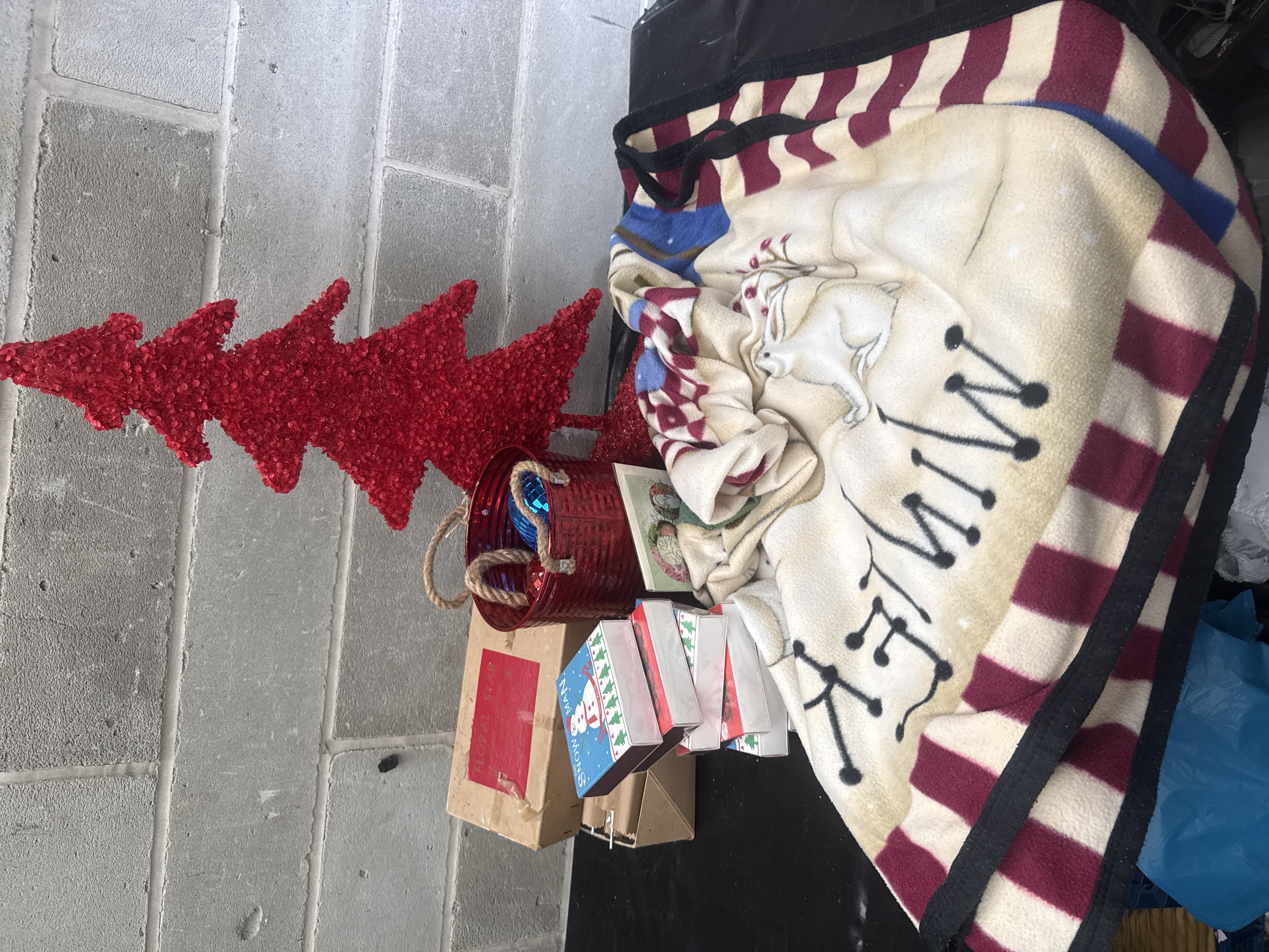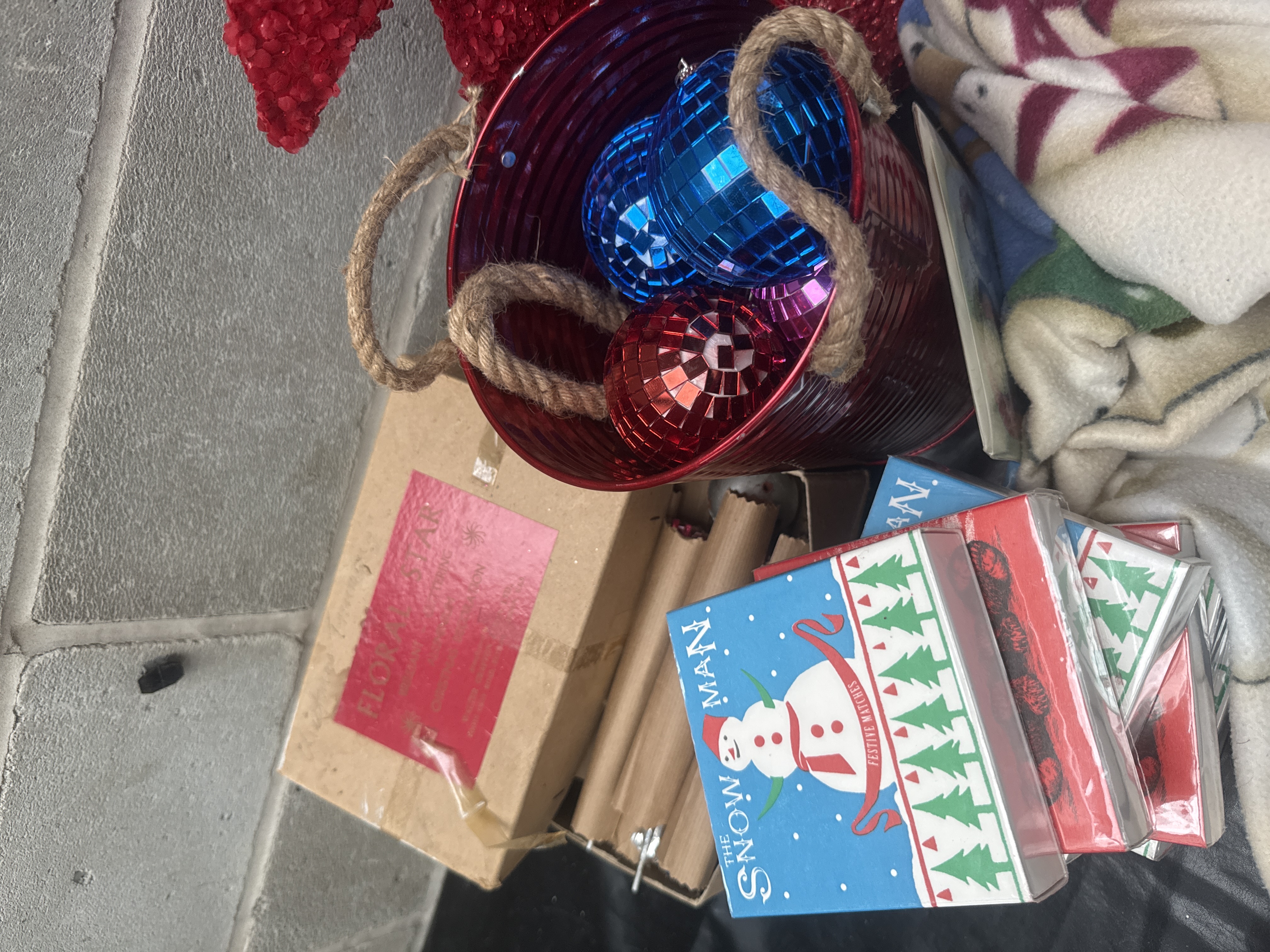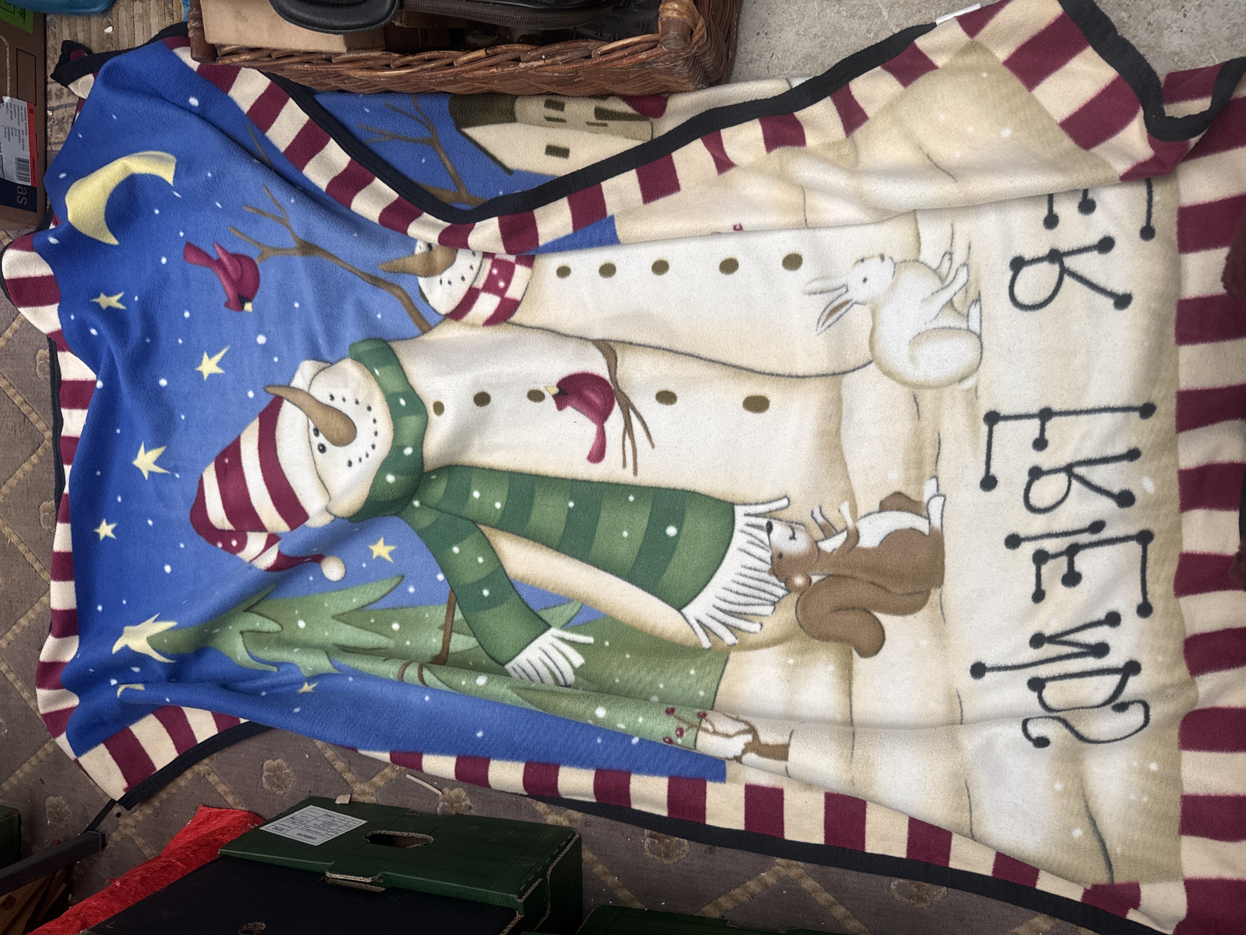 A collection of seasonal decorative items and household textiles. The group includes a red, textured Christmas tree silhouette decoration and a red metallic bucket featuring jute rope handles. The bucket contains several faceted, mirror-ball style ornaments in blue, red, and pink. Also included is a stack of decorative matchboxes titled The Snowman Festive Matches, each featuring seasonal illustrations. The lot further contains a cardboard box labeled Floral Star and a plush fleece throw blanket. The blanket depicts snowmen and woodland animals, including a rabbit, squirrel, and cardinal, with the stylized text Best Friends and a striped border.