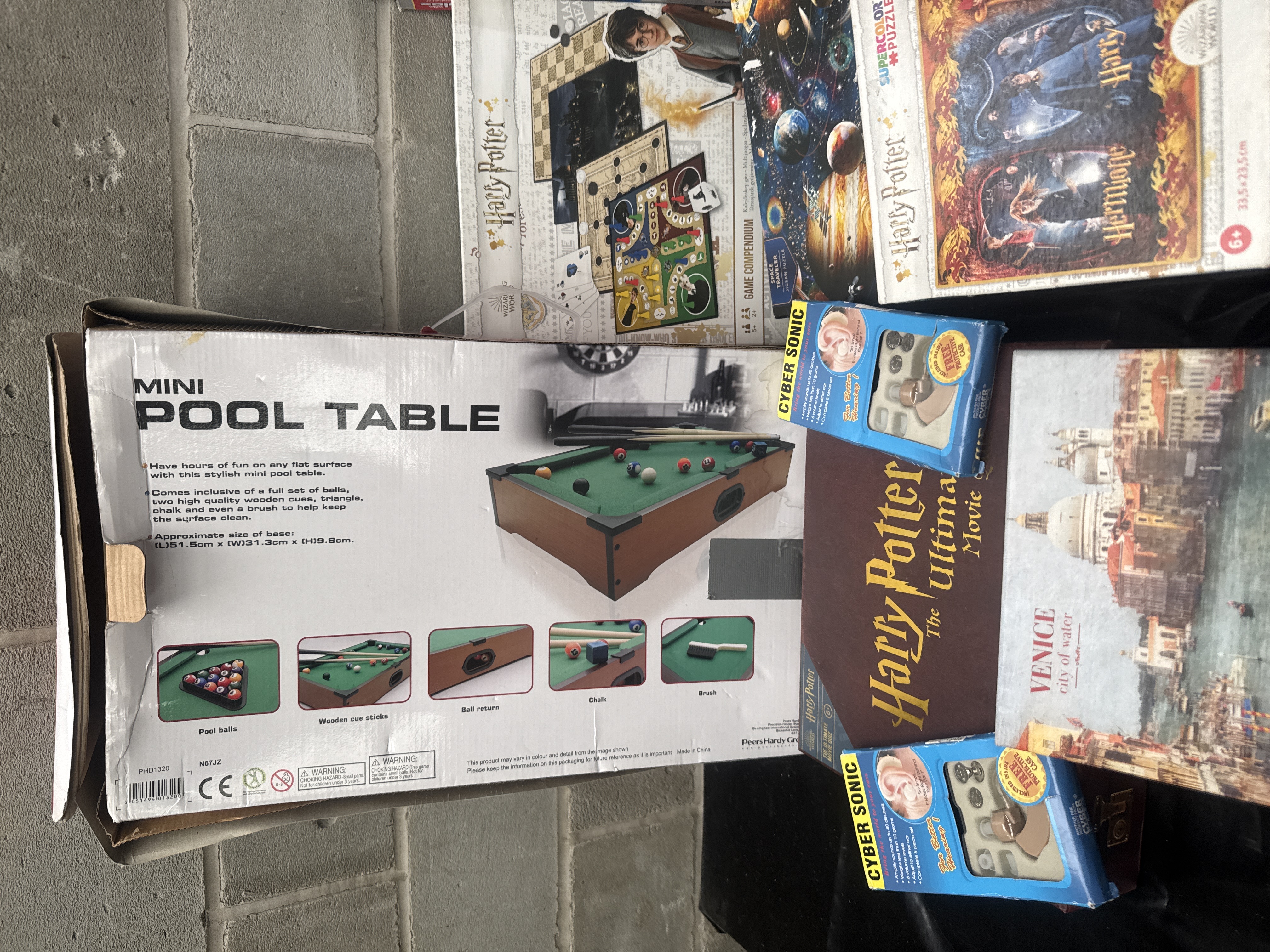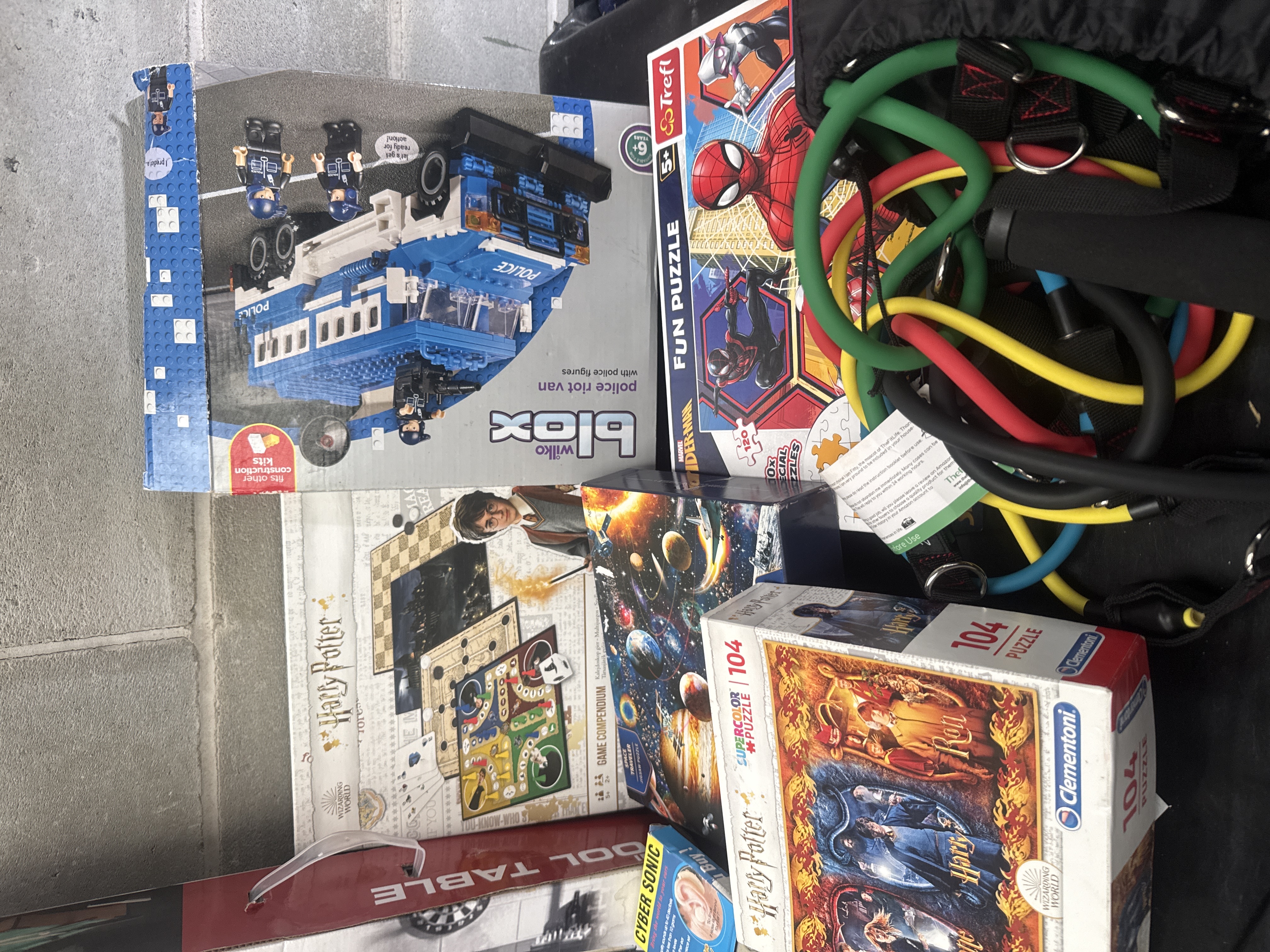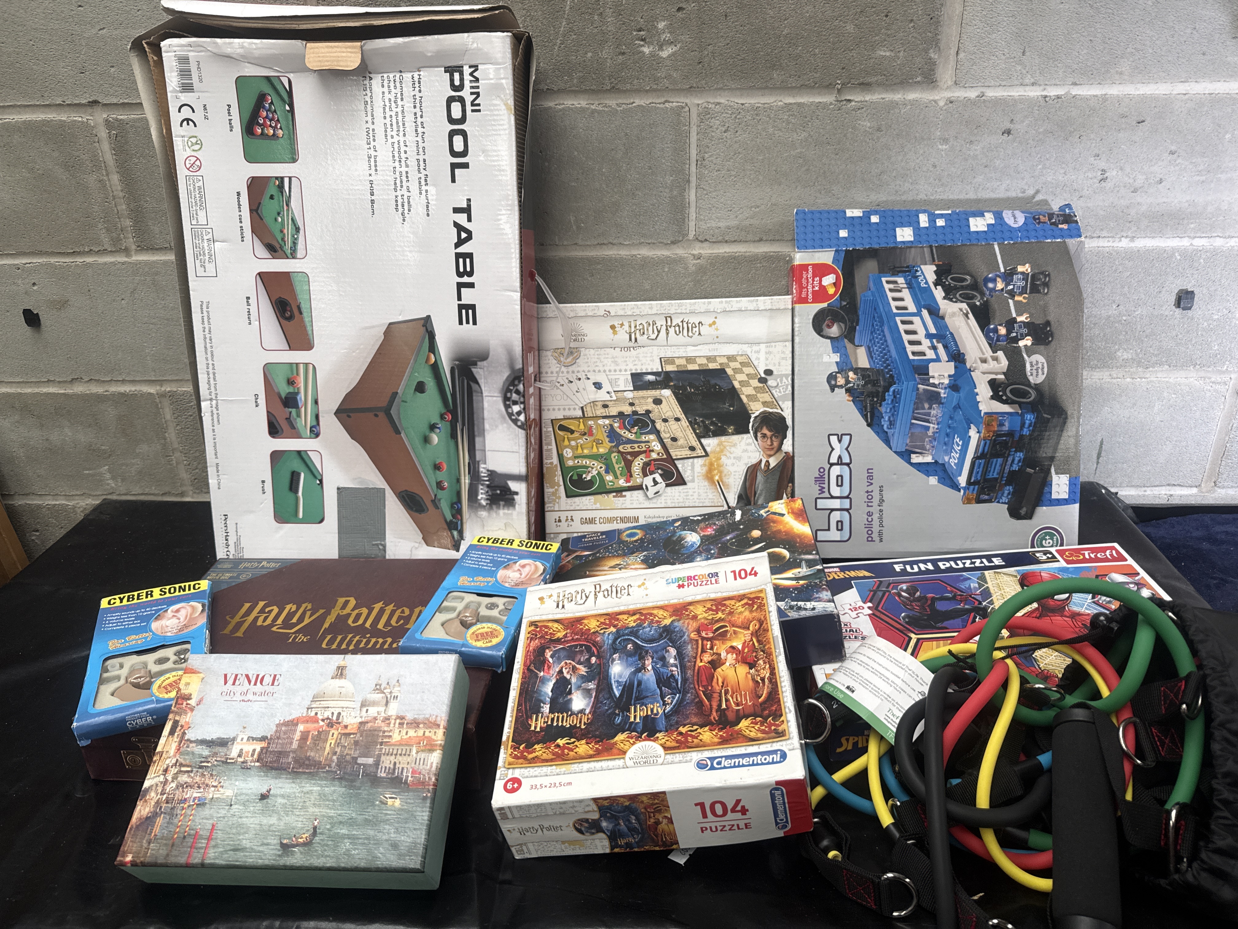 An assortment of contemporary leisure items featuring a boxed Mini Pool Table by the Peers Hardy Group. The lot includes several Harry Potter themed items, such as a game compendium and various jigsaw puzzles by Clementoni, alongside a Spider-Man puzzle by Trefl and a landscape puzzle titled Venice City of Water. Also present are a Wilko Blox police riot van construction kit, several Cyber Sonic sound amplifiers in their original retail packaging, and a set of multi-colored resistance bands with black handles and metal attachments. The items are primarily housed in their original retail cardboard packaging.