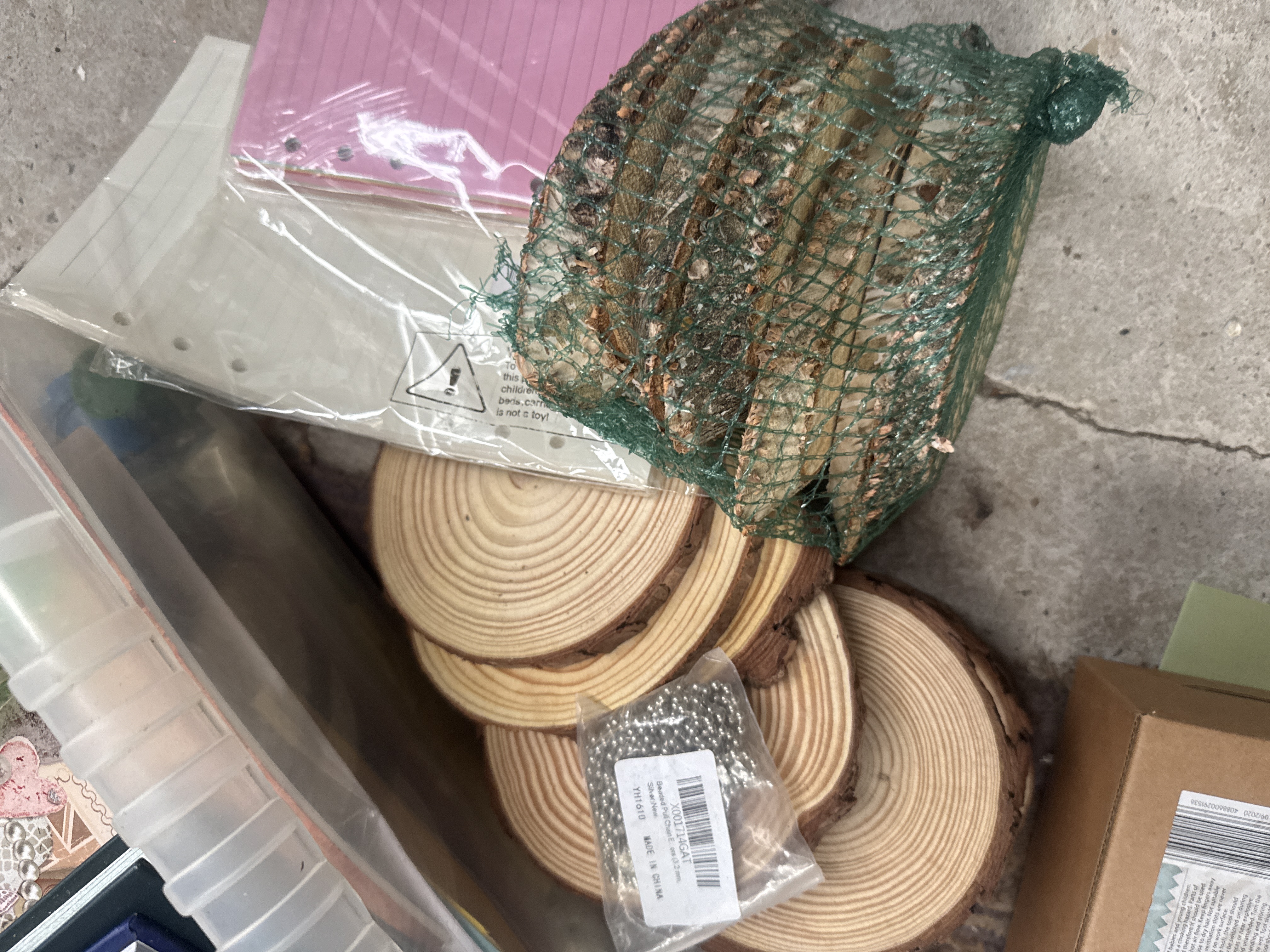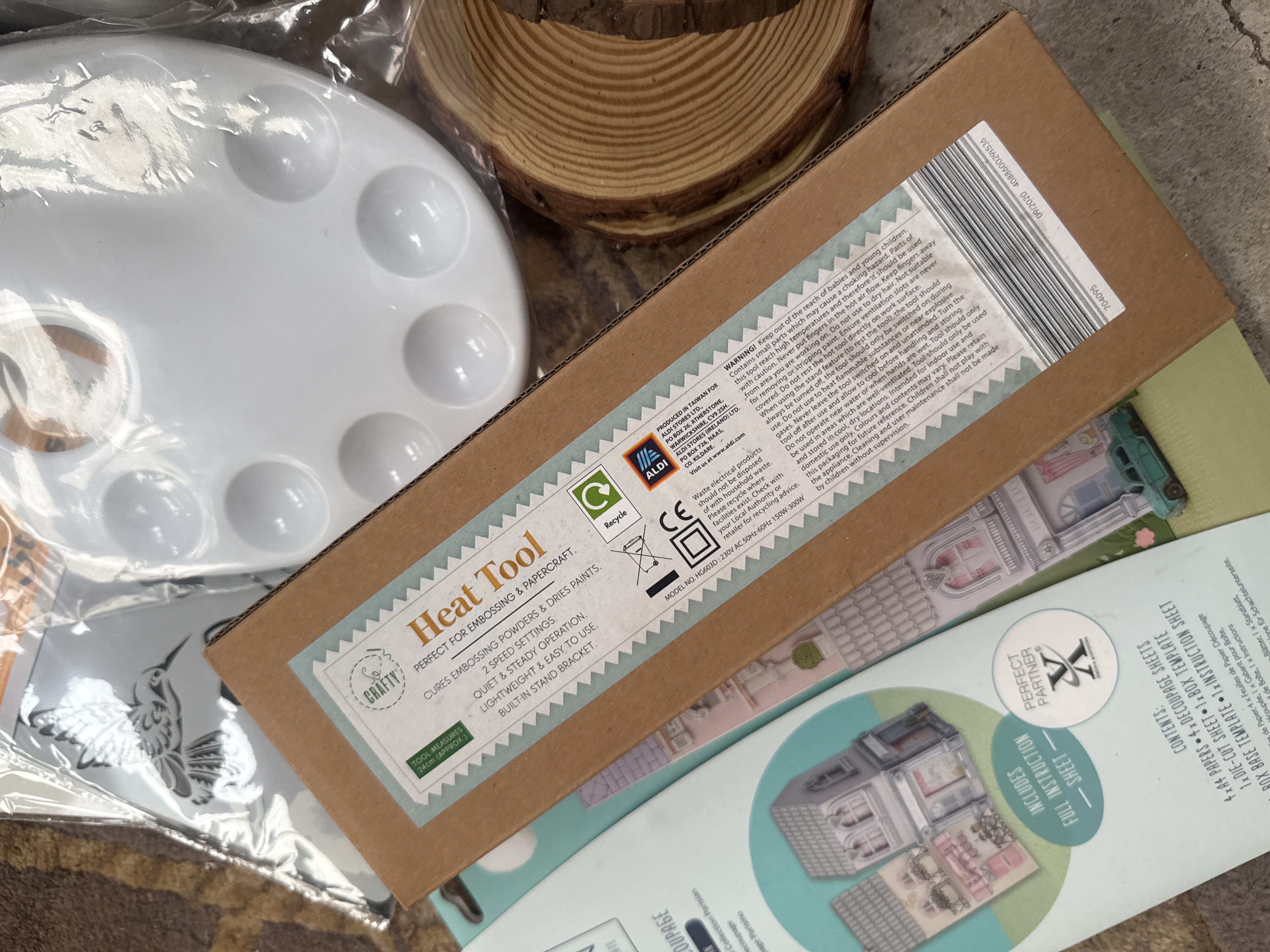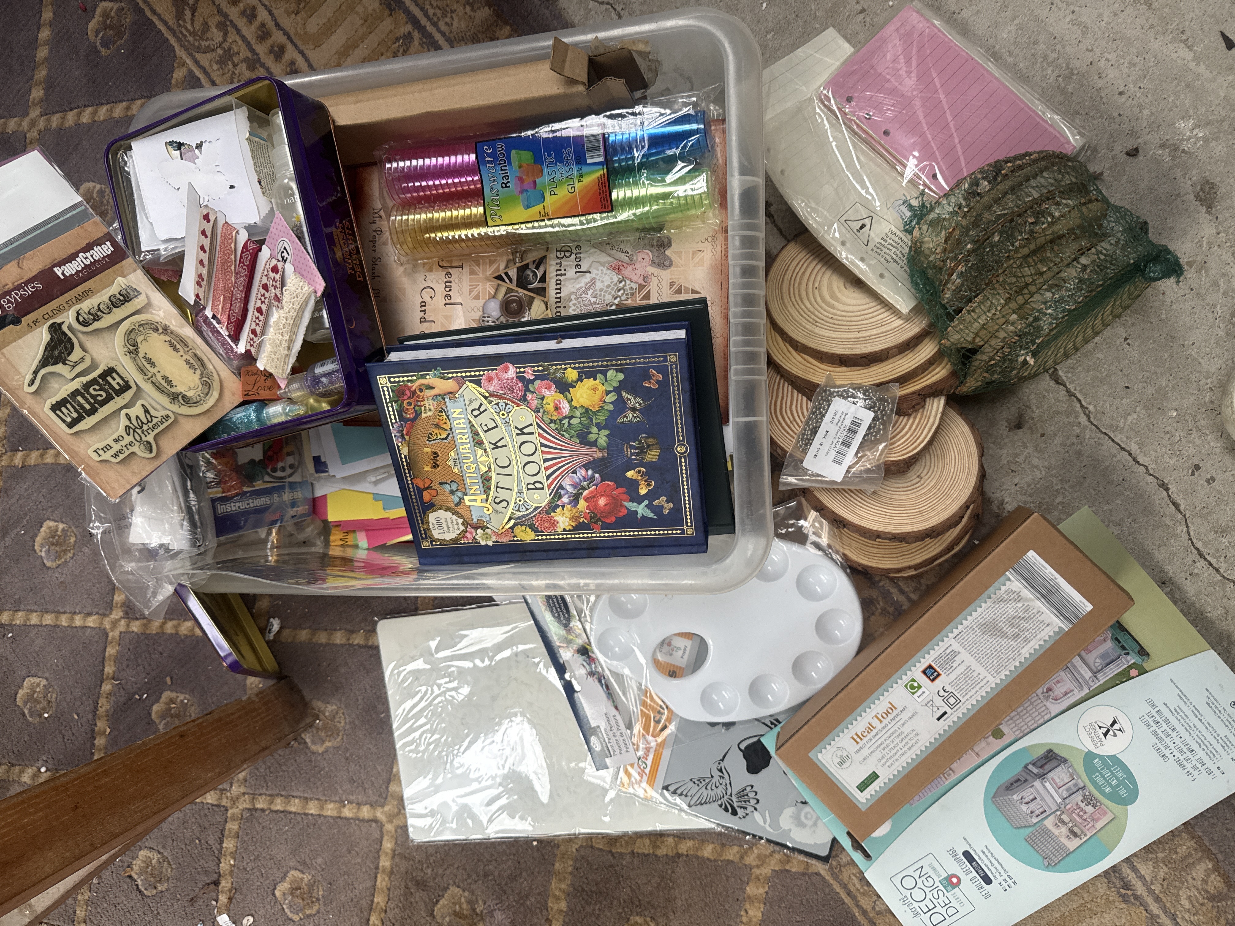A group of various arts, crafts, and hobby materials. The collection features The Antiquarian Sticker Book: Over 1,000 Exquisite Victorian Stickers. Also included is a So Crafty heat tool for embossing and papercraft in its original retail box, produced for Aldi. The lot contains several natural-edge wood slices, a package of Plasware Rainbow plastic shot glasses, and PaperCrafter cling stamps. Additional items include a collection of ribbons and decorative tapes housed in a purple Turkish Delights tin, a white plastic paint palette, various stencils, decoupage kits, stationery, and a small bag of silver-colored metal beads.