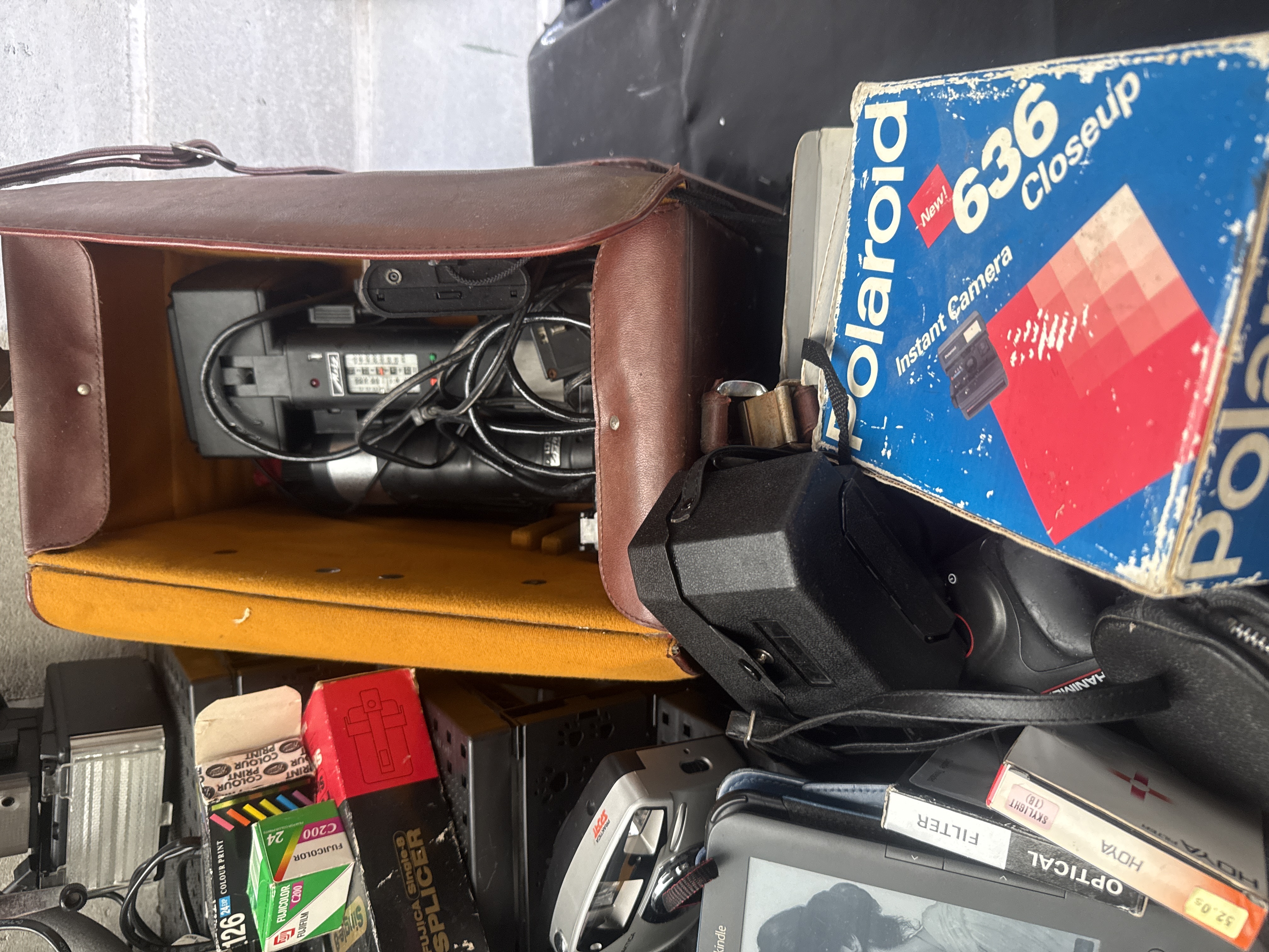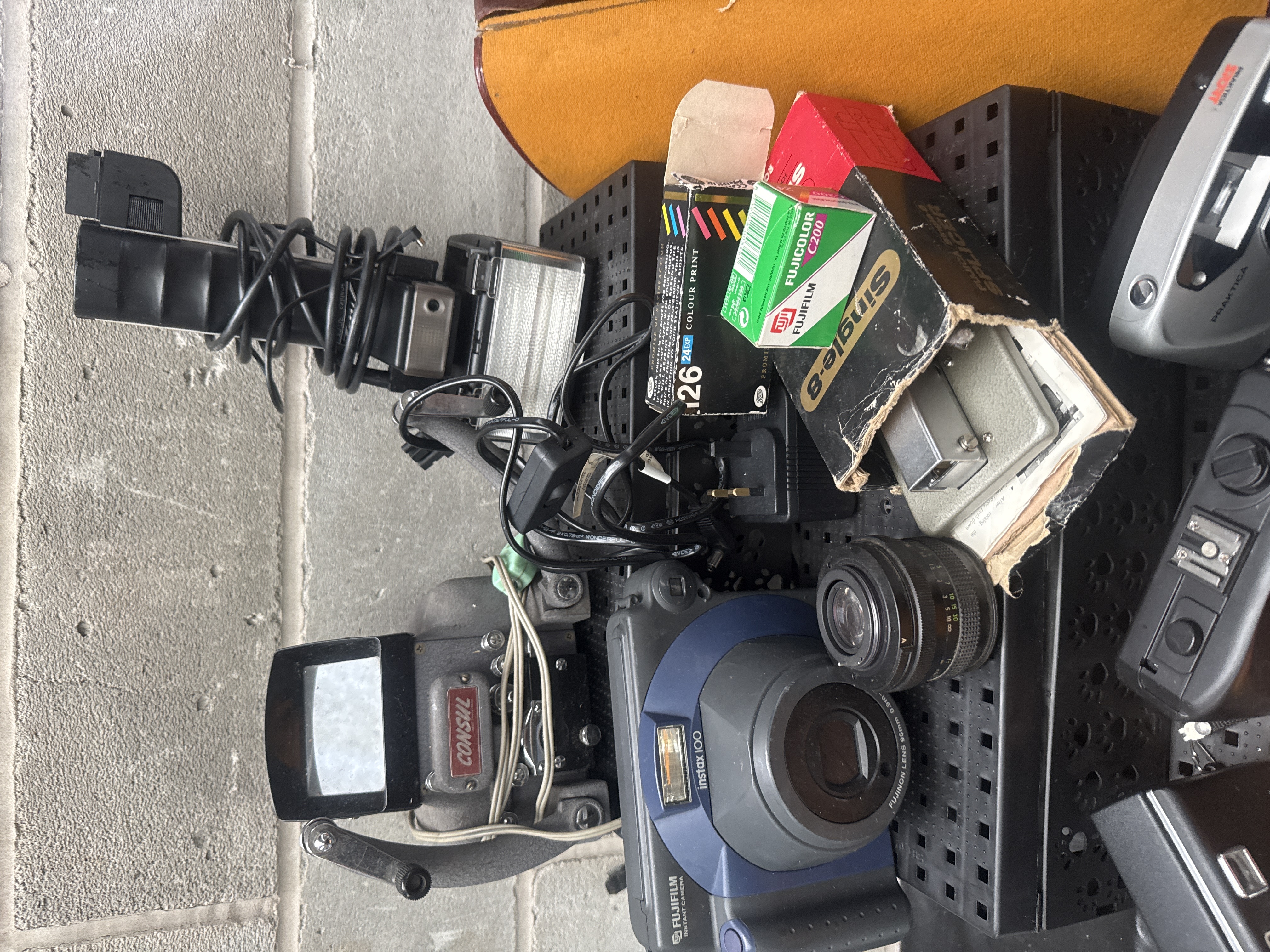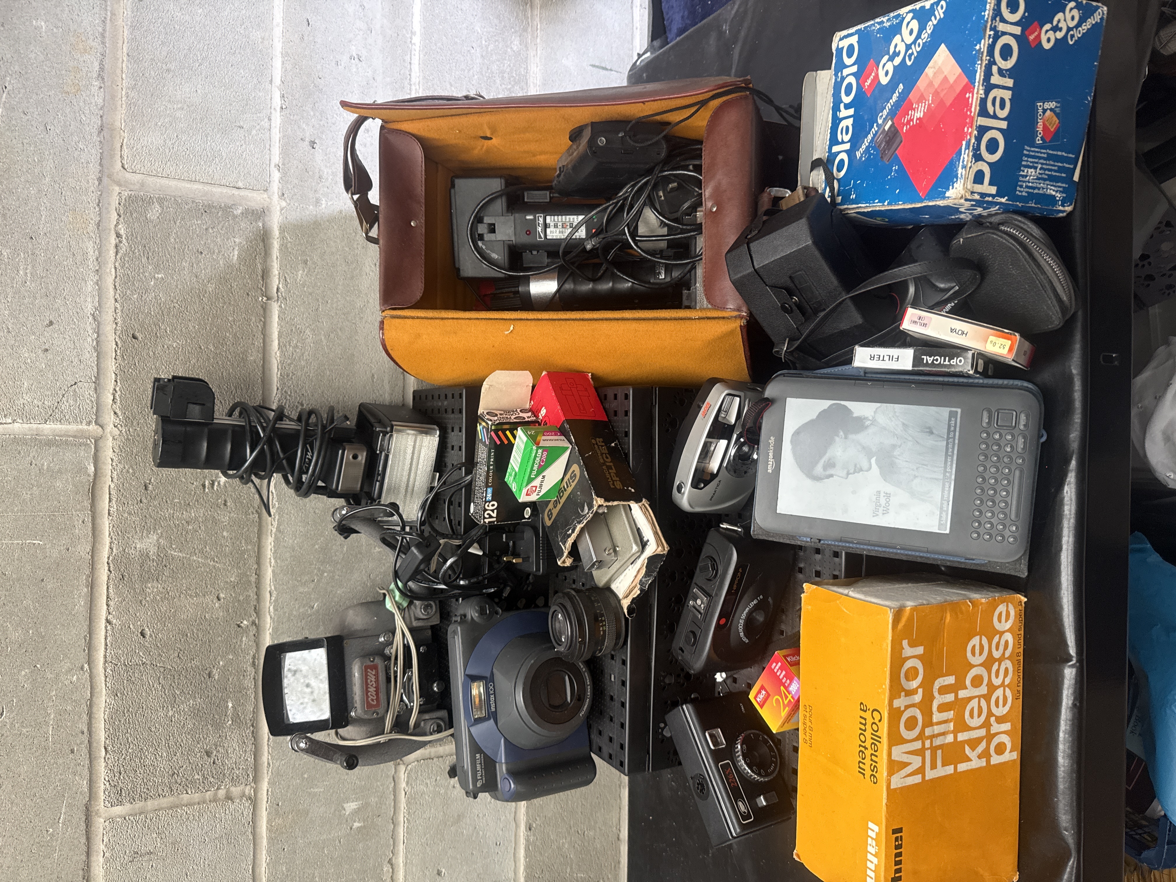 A collection of photographic equipment and personal electronics. The group includes a Polaroid 636 Closeup instant camera and a Hähnel Motor Film Klebepresse motorized film splicer, both in original retail packaging. The lot features a Fujifilm Instax 100 instant camera, a Praktica compact camera, a vintage video camera in a brown carrying case, and a Consul film viewer. Additional accessories consist of a Fujica Single-8 Splicer, a handle-mount electronic flash, various lens filters by Hoya and Optical, and several boxes of Fujicolor C200 film. An Amazon Kindle e-reader is also included. The items are composed of various materials including plastic, metal, and glass.