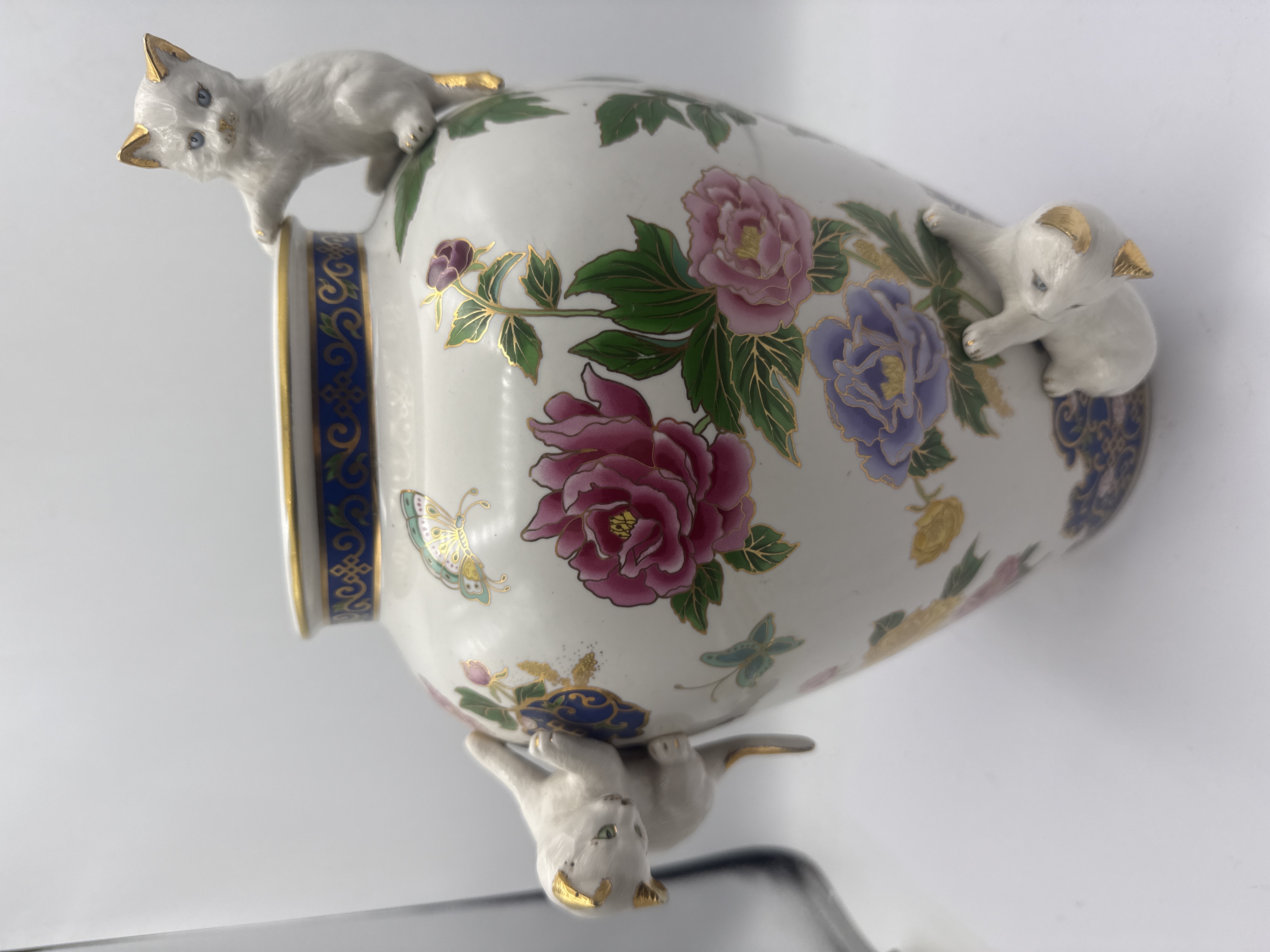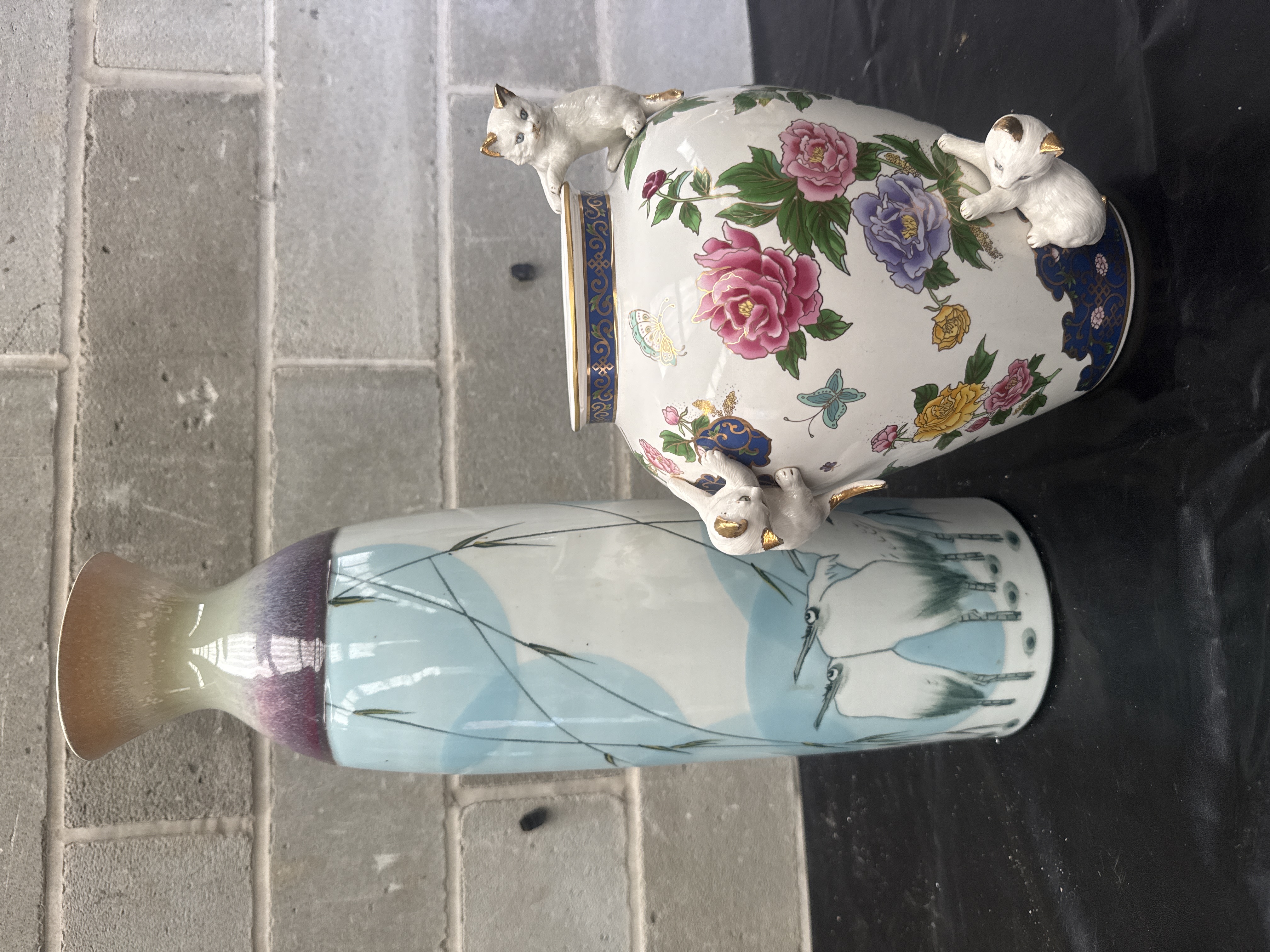 A group of two decorative porcelain vases of varying styles. The first is a Franklin Mint porcelain vase titled The Vase of the Imperial Cats, featuring a white ground decorated with polychrome peony blooms, butterflies, and blue and gold patterned borders. The vessel is further decorated with applied three-dimensional white cat figurines featuring gilded accents. The base is marked with the title and © THE FRANKLIN MINT along with a Crafted in Malaysia sticker. The second item is a tall, slender porcelain vase featuring a minimalist design of herons among reeds against a pale blue and white background. This piece exhibits a flared neck with an ombre glaze transitioning from brown to purple.