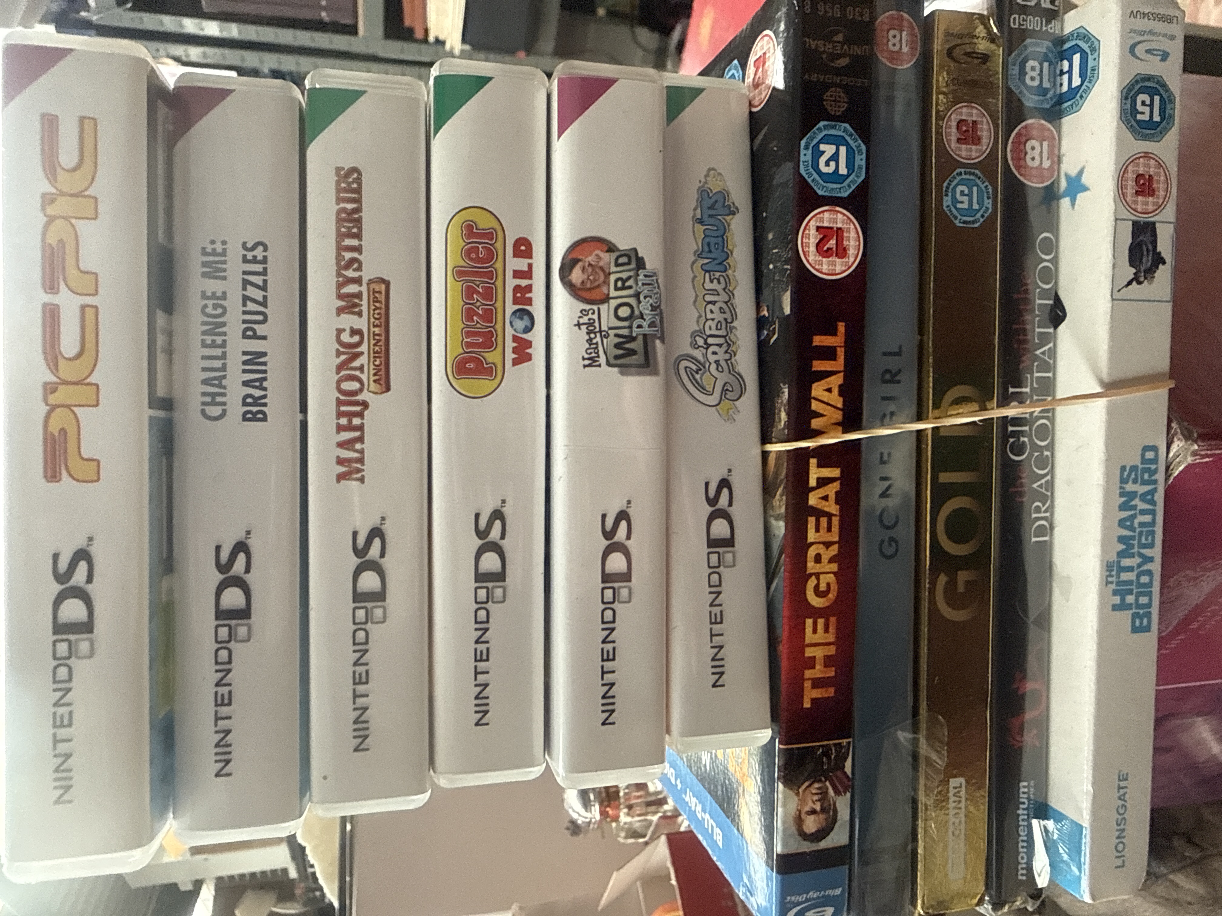 A collection of Nintendo DS video games and a selection of Blu-ray and DVD movies. The Nintendo DS titles include PicPic, Challenge Me: Brain Puzzles, Mahjong Mysteries: Ancient Egypt, Puzzler World, Margot’s Word Brain, and Scribblenauts. These games are housed in standard white PAL-region retail cases. The movie selection includes titles such as The Great Wall, Gone Girl, Gold, The Girl with the Dragon Tattoo, and The Hitman’s Bodyguard. Several movie cases are labeled with UK and Irish age rating symbols from the British Board of Film Classification and the Irish Film Classification Office. The items are presented in their original retail packaging.