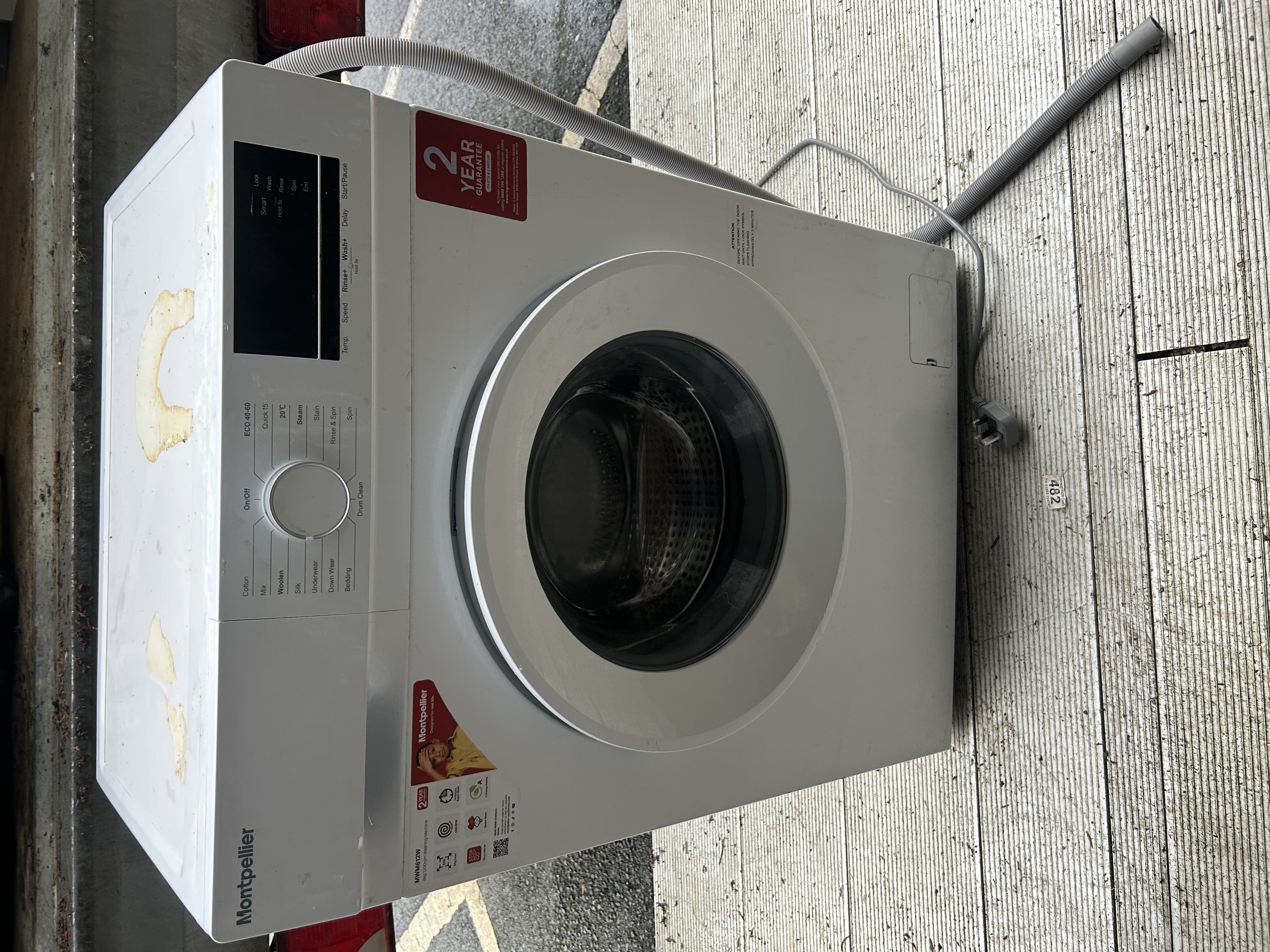 A Montpellier model MW612W front-loading washing machine featuring a white finish and a silver-toned door surround. The unit is equipped with a digital control panel comprising a central rotary dial for various wash cycles including Cotton, Mix, Woolen, Quick 15, 20C, Steam, Stain, Rinse and Spin, and Spin. The interface includes a black digital display and touch-sensitive buttons for temperature, speed, and rinse settings. Two 2 YEAR GUARANTEE stickers are affixed to the front casing. The appliance includes its integrated power cord and a flexible gray drain hose.