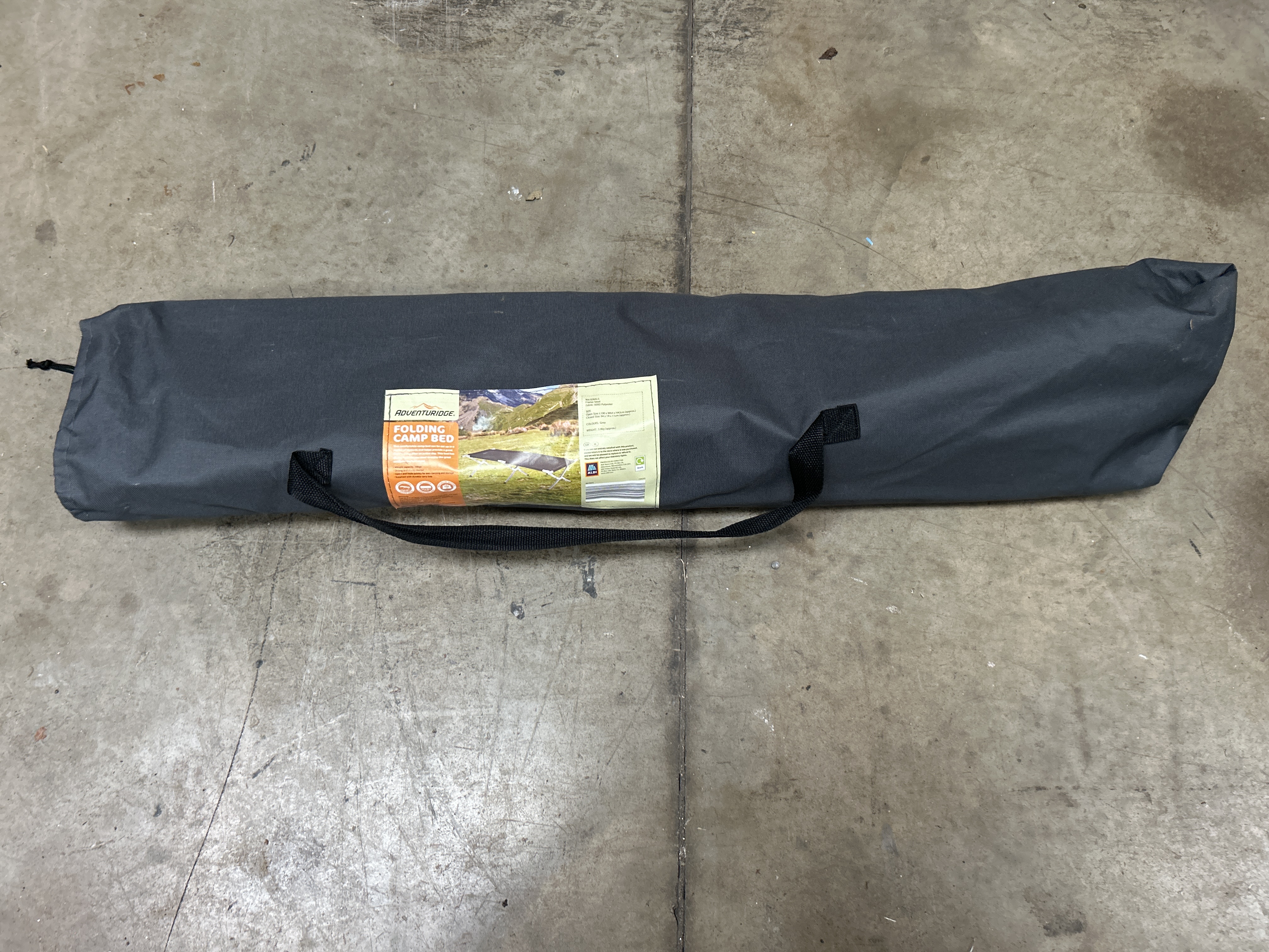 An Adventuridge brand folding camp bed contained within its original dark grey synthetic fabric carrying bag. The bag features black webbing handles and a drawstring closure. A prominent manufacturer label is attached to the bag, identifying the item as a Folding Camp Bed and providing product specifications and imagery. The construction consists of a folding frame and synthetic fabric surface.