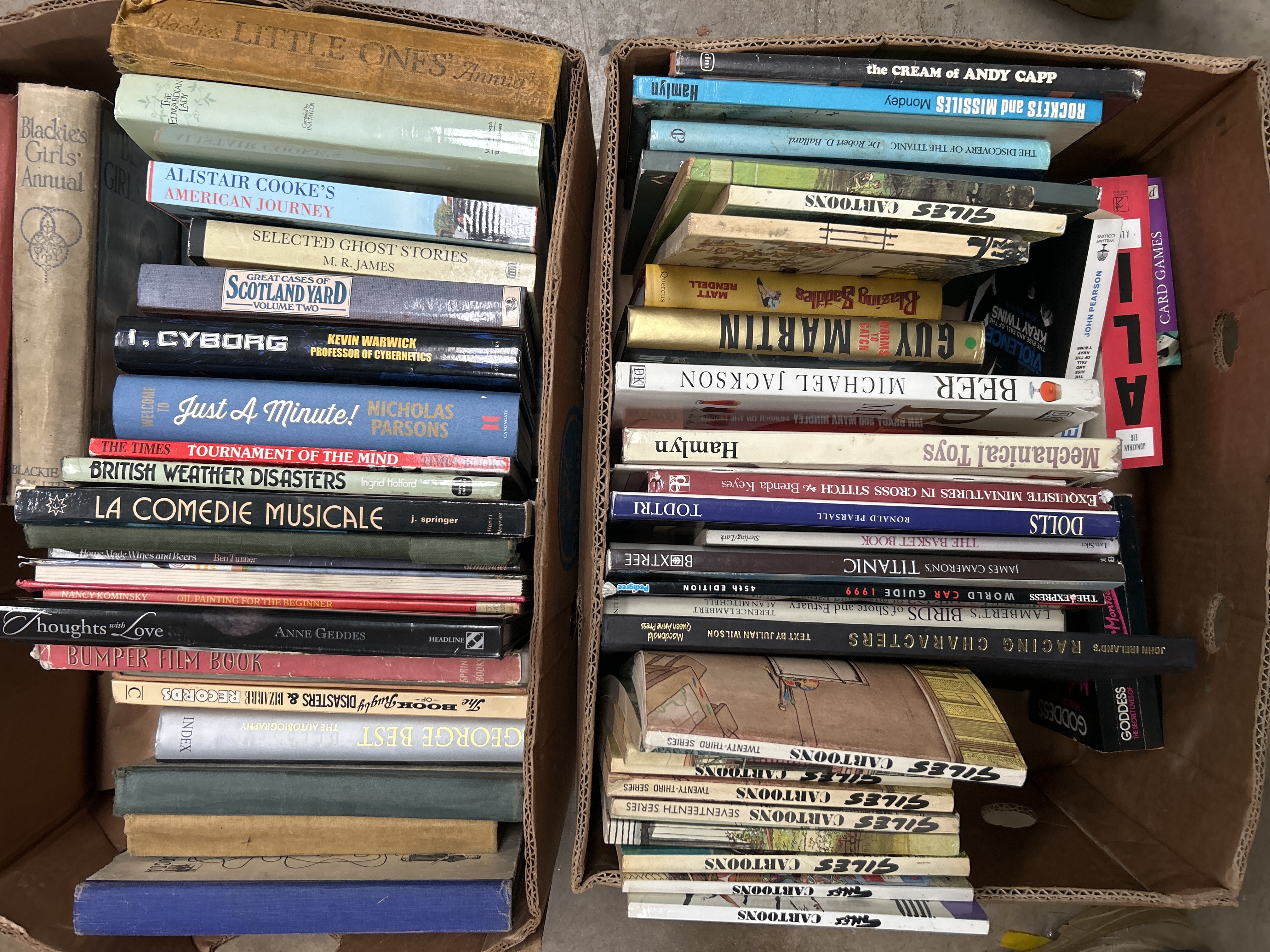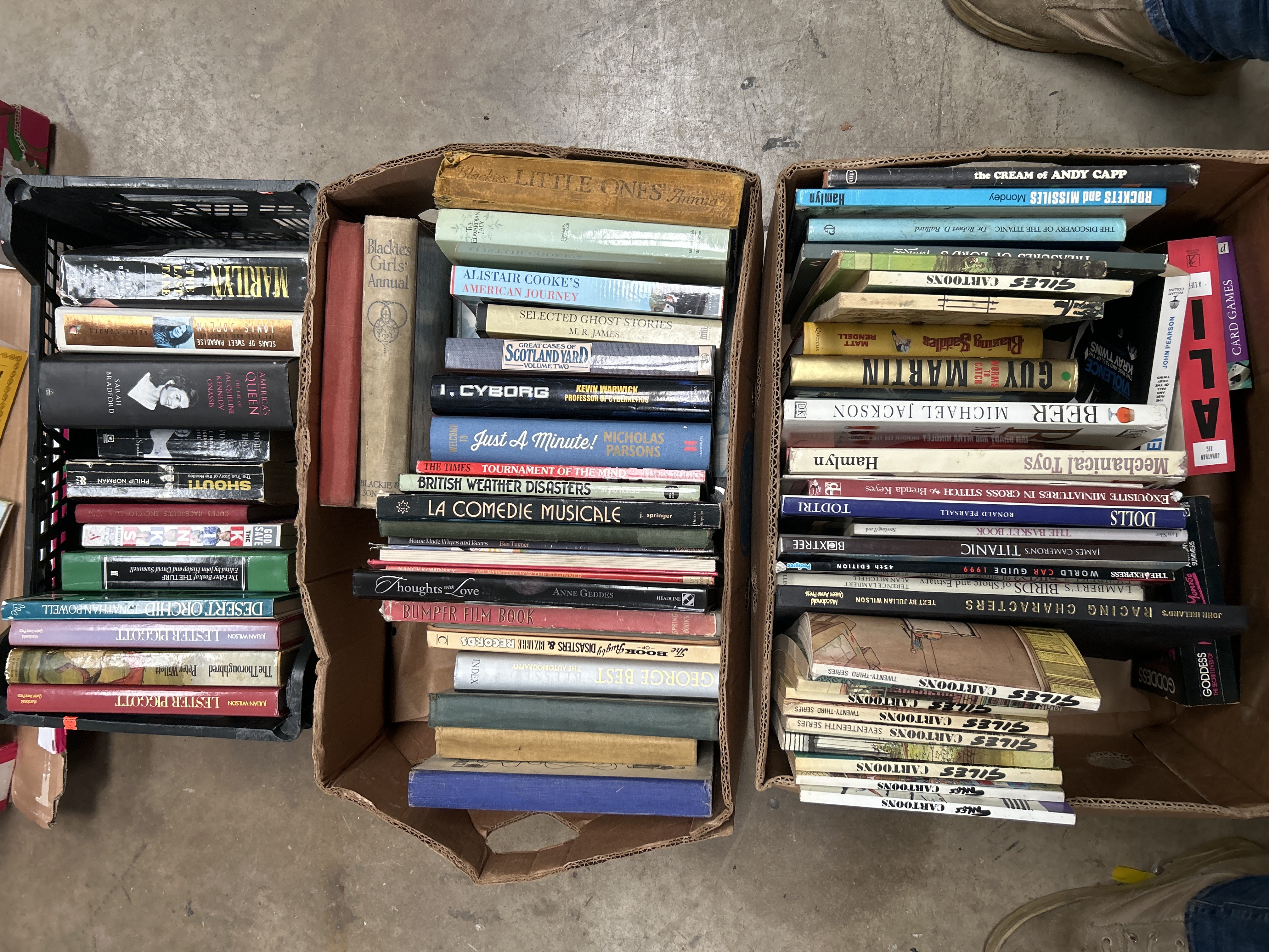 A collection of reference books, annuals, and paper ephemera spanning the 20th and 21st centuries, presented in two cardboard boxes and one black plastic crate. The assortment includes biographies of figures such as Marilyn Monroe, Janis Joplin, Jacqueline Kennedy Onassis, and George Best. Music history is represented by titles concerning The Beatles and The Kinks. Sports interest is featured through horse racing volumes including Desert Orchid and Lester Piggott. The collection also contains vintage annuals such as Blackie’s Girls’ Annual and Blackie’s Little Ones’ Annual, alongside numerous cartoon compilations including Giles and Andy Capp. Additional subjects represented include maritime history, technology, and various hobbies.