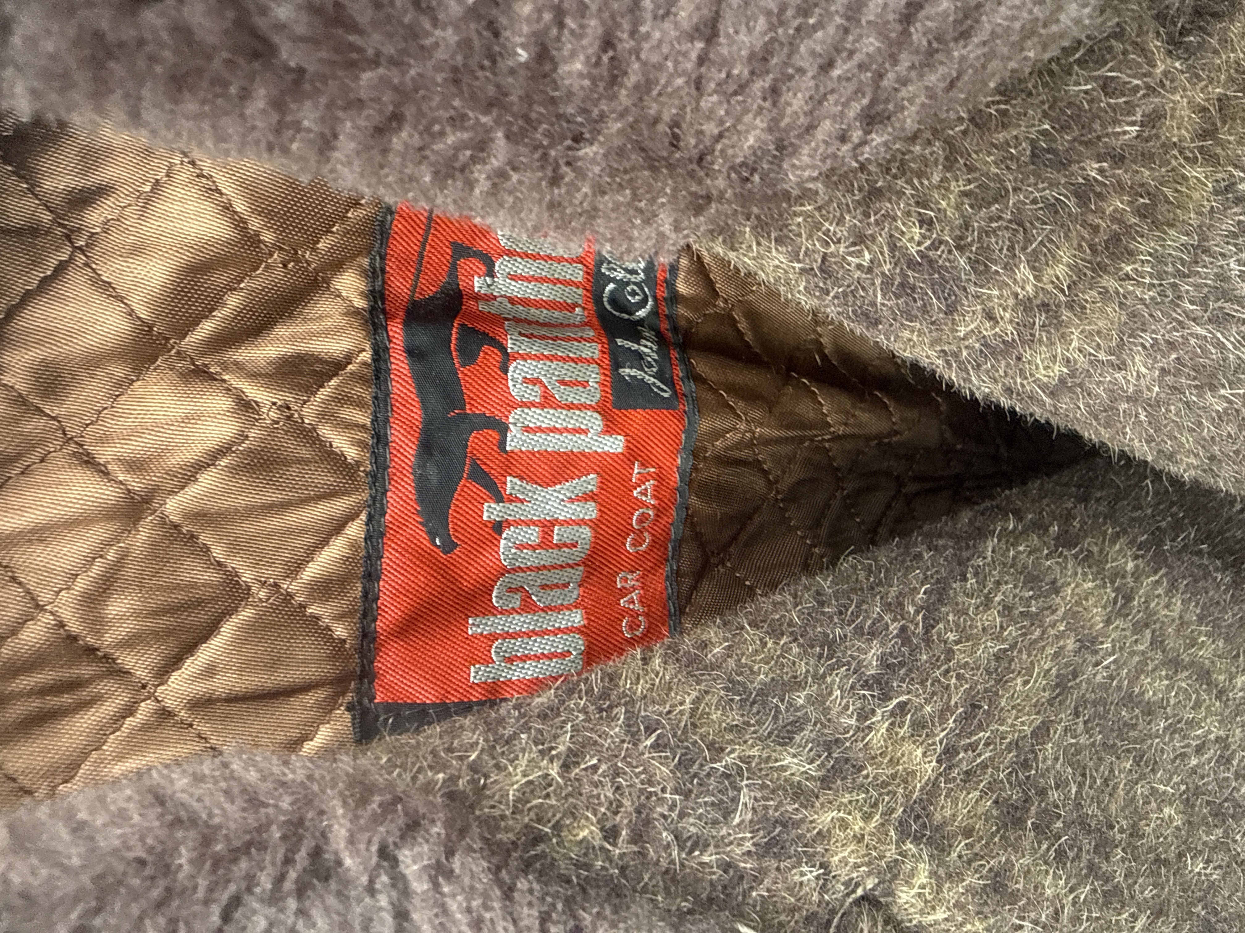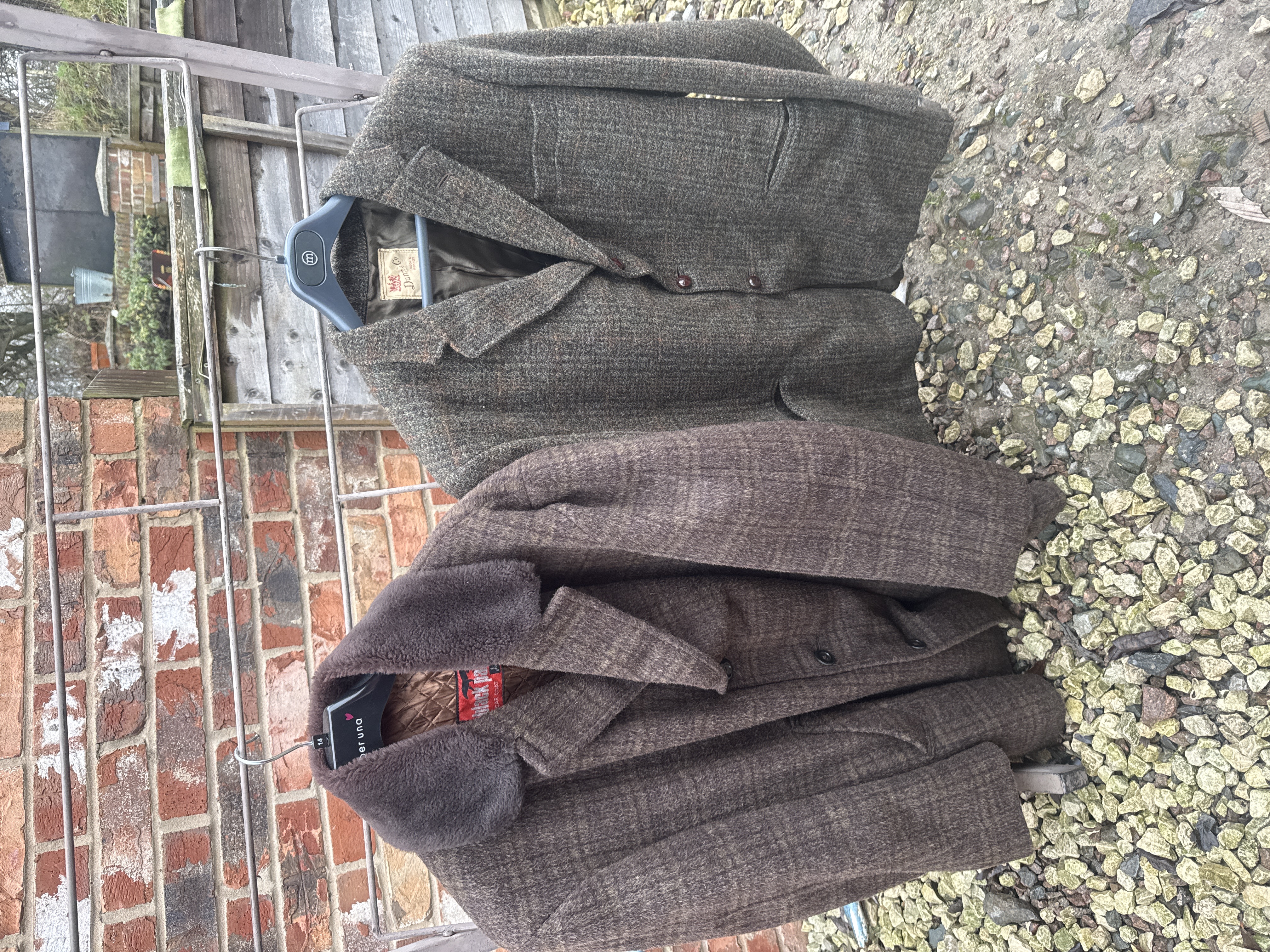 A lot consisting of two men’s vintage outerwear garments in size M/L. The first item is a Harris Tweed sport coat by Dunn and Co. London and Provinces. It is constructed from a multi-tonal brown textured wool tweed and features notched lapels, a button-front closure, and a full interior lining. The second item is a Black Panther car coat by John Collier. This garment features a brown textured fabric exterior, a contrasting plush faux-fur collar, and a quilted interior lining. Both pieces include original maker labels and are designed with a classic mid-century aesthetic.