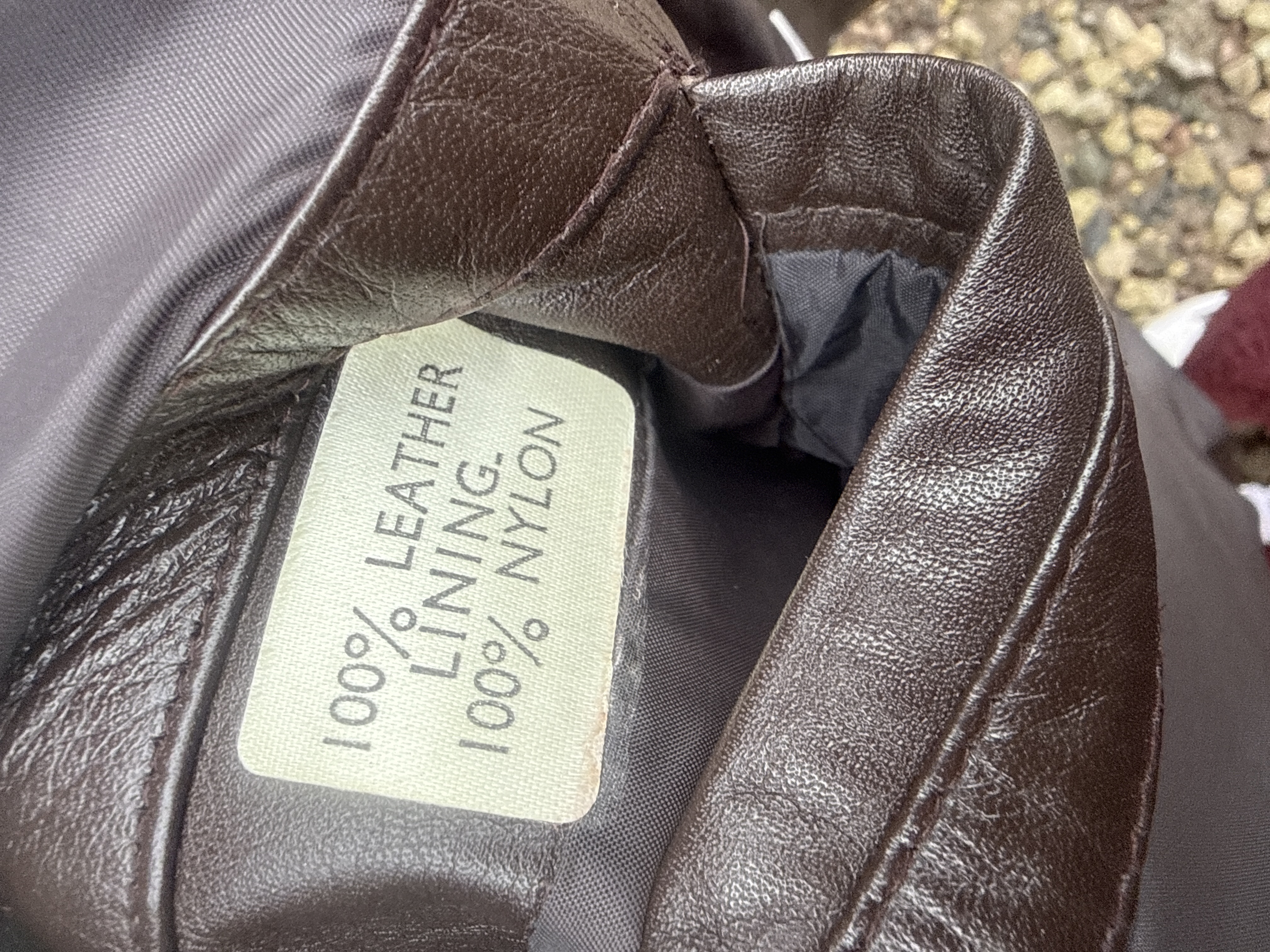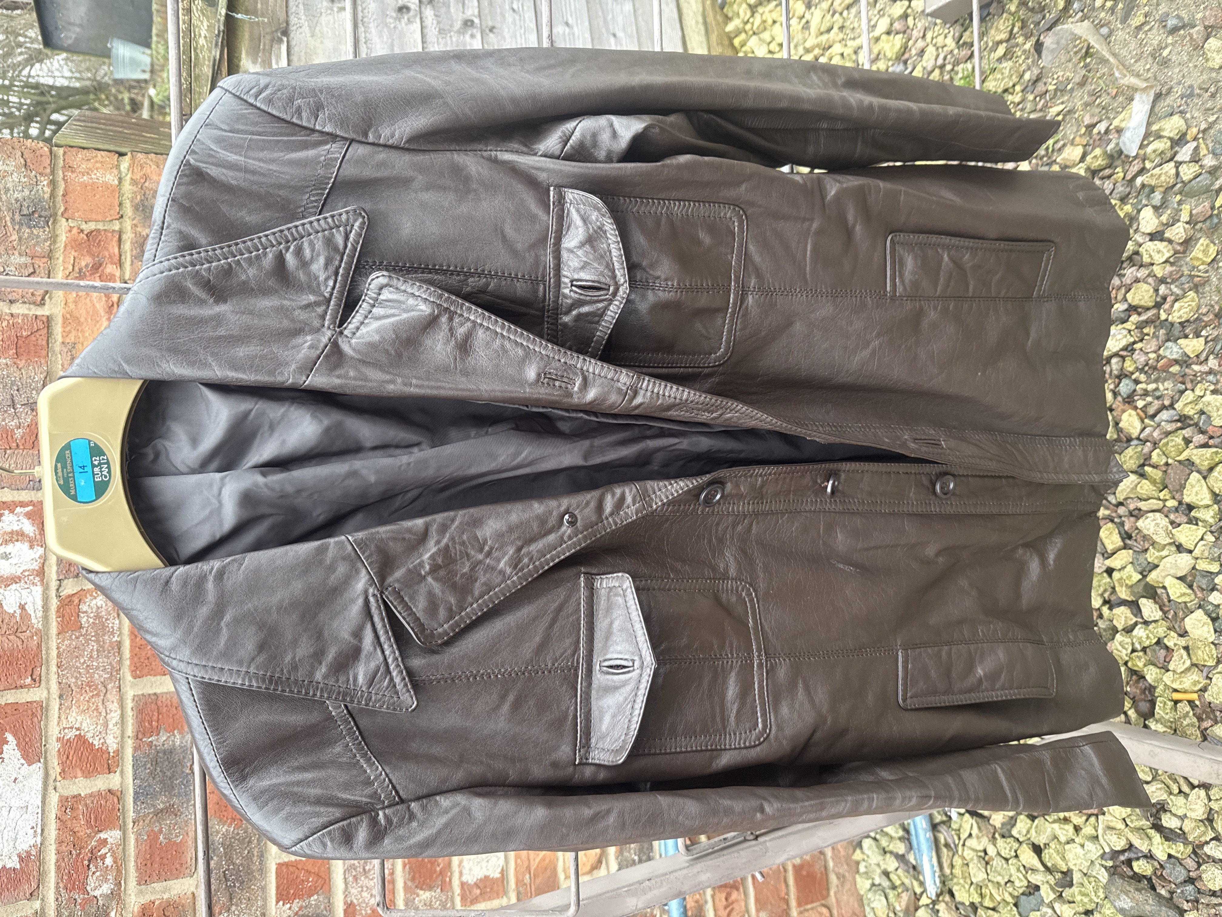 A Marks & Spencer mid-length jacket constructed from 100 percent leather with a 100 percent nylon lining. The garment features a dark brown color, a notched lapel, and a four-button front closure. The design includes two buttoned flap pockets positioned on the chest and two lower welt pockets. Internal labeling and the hanger marker indicate a size UK 14 (EUR 42, CAN 12), which aligns with a size M/L.