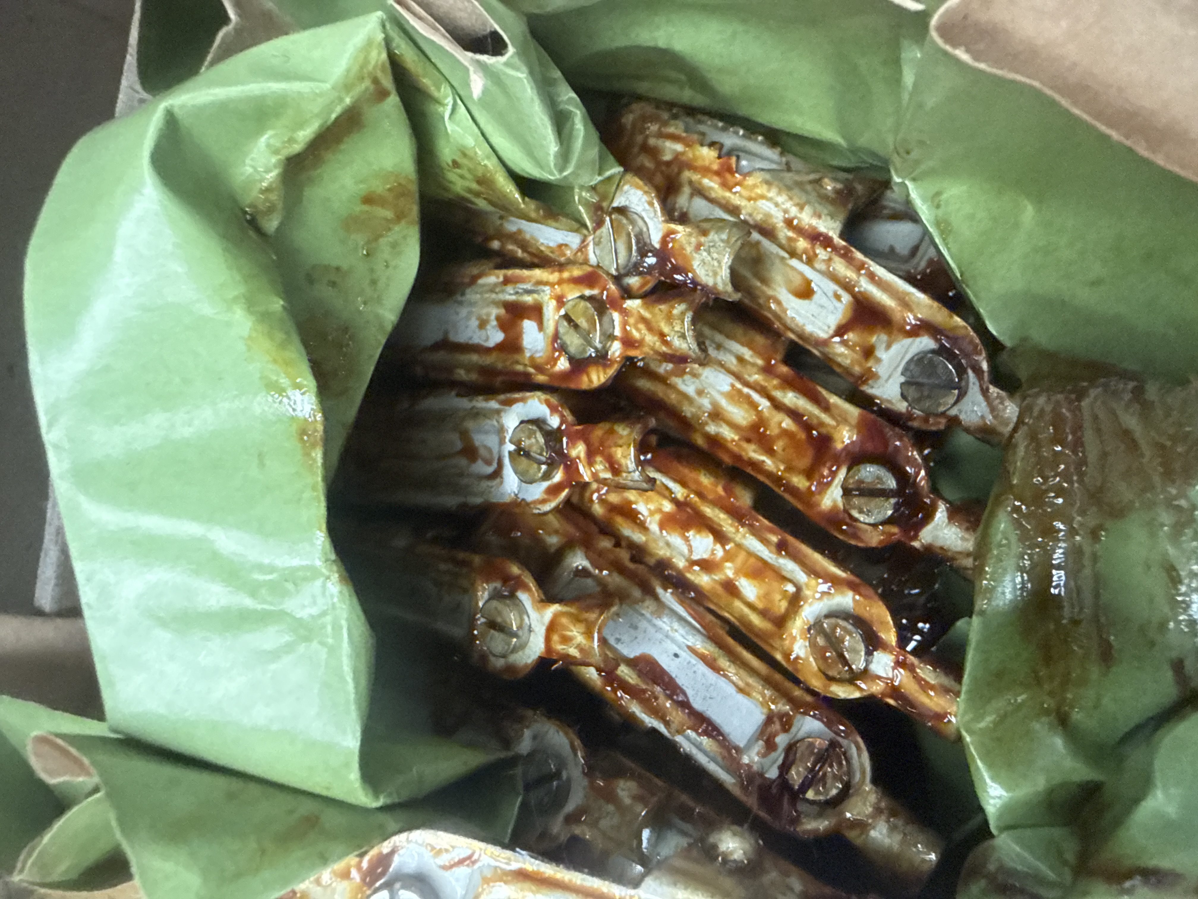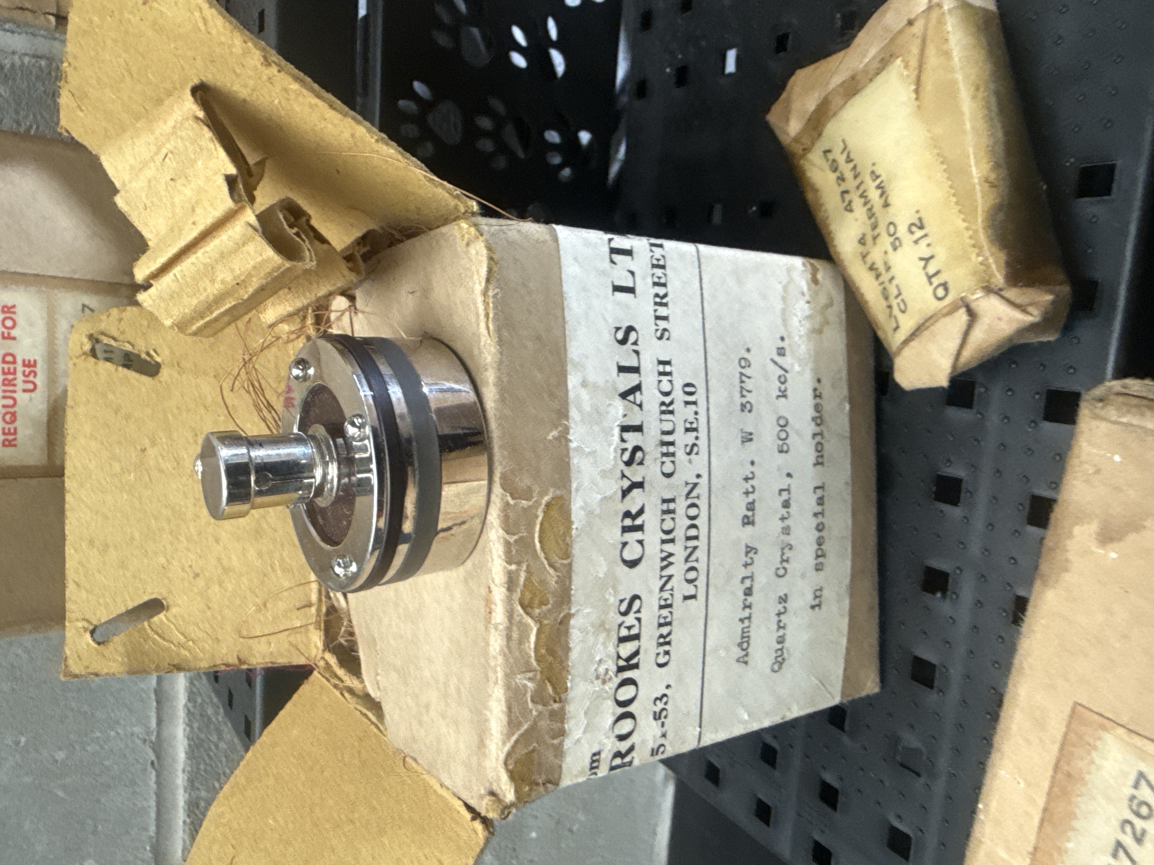 A group of vintage radio components primarily manufactured by Brookes Crystals Ltd of London. The collection includes Admiralty Pattern W 3779 quartz crystals (500 kc/s) in specialized chrome-finished holders. Also included is a box of 50-amp terminal clips, identified as Part No. LV6/MT4 47267. The terminal clips are wrapped in green protective paper and coated in a brown anti-corrosive grease. The items are housed in their original cardboard packaging, which bears labels indicating mid-20th-century British maritime or military provenance. One label identifies the maker as Whitaker Cutler and indicates a packaging date of October 1952. Some boxes include the cautionary text, Not to be opened until required for use.