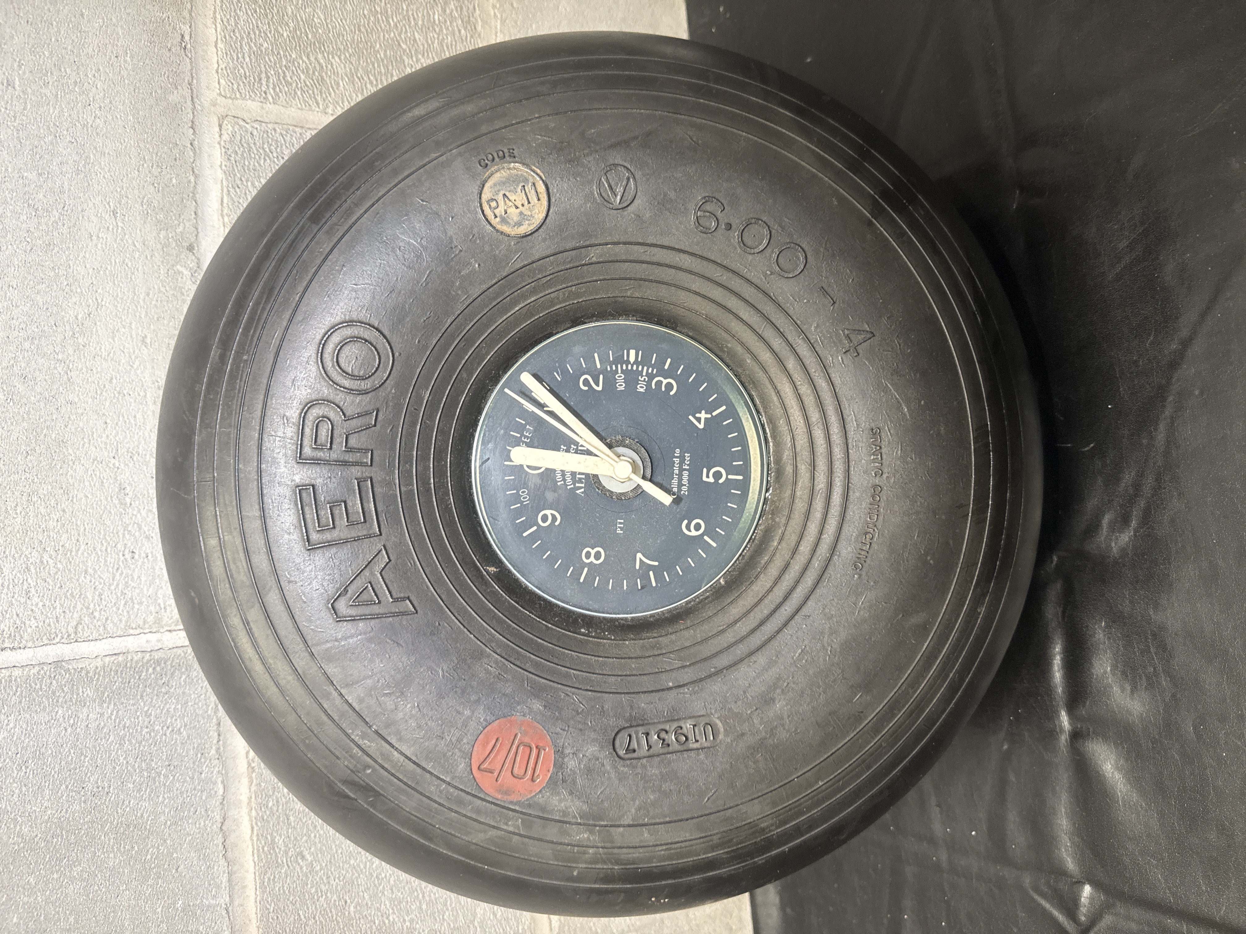This novelty clock is constructed from a black rubber aircraft tire with a central inset clock face designed to replicate an aircraft altimeter. The tire sidewall features embossed lettering including AERO, 6.00-4, STATIC CONDUCTING, and U19317. It also bears a circular PA II stamp and a red 10/7 marking. The clock dial is black with white numerals and includes text such as FEET, ALTITUDE, and Calibrated to 20,000 Feet. The clock is equipped with three hands.