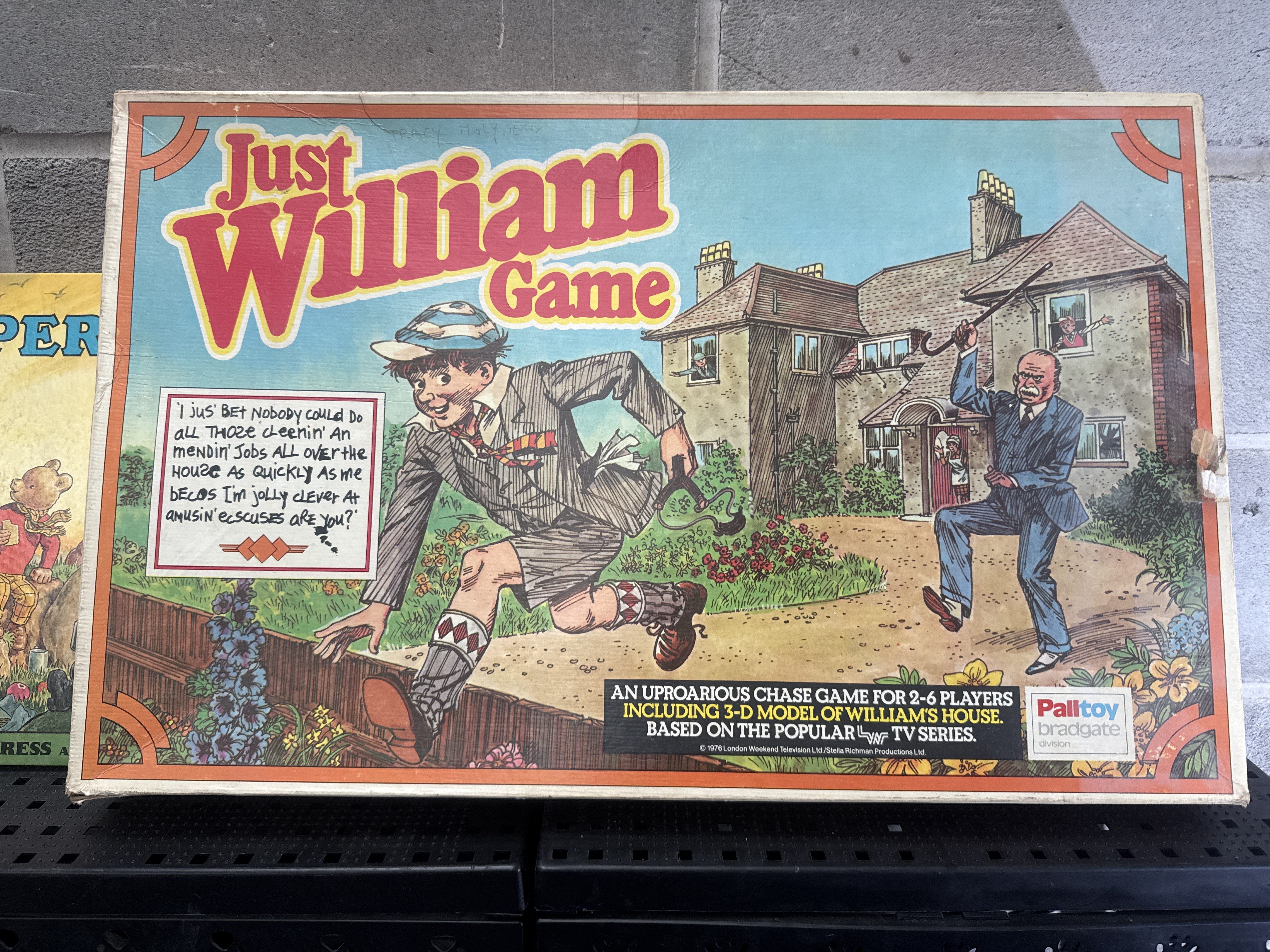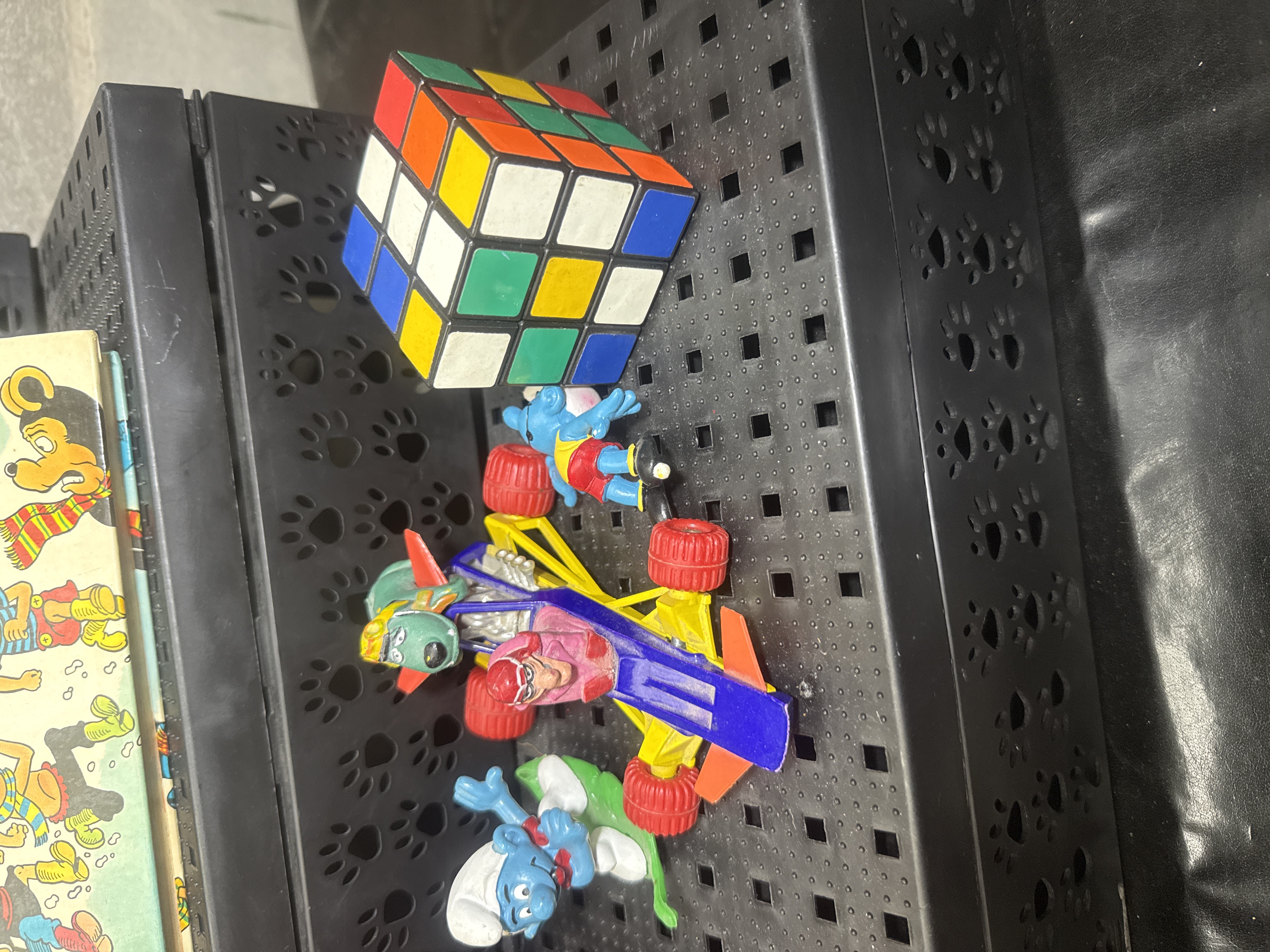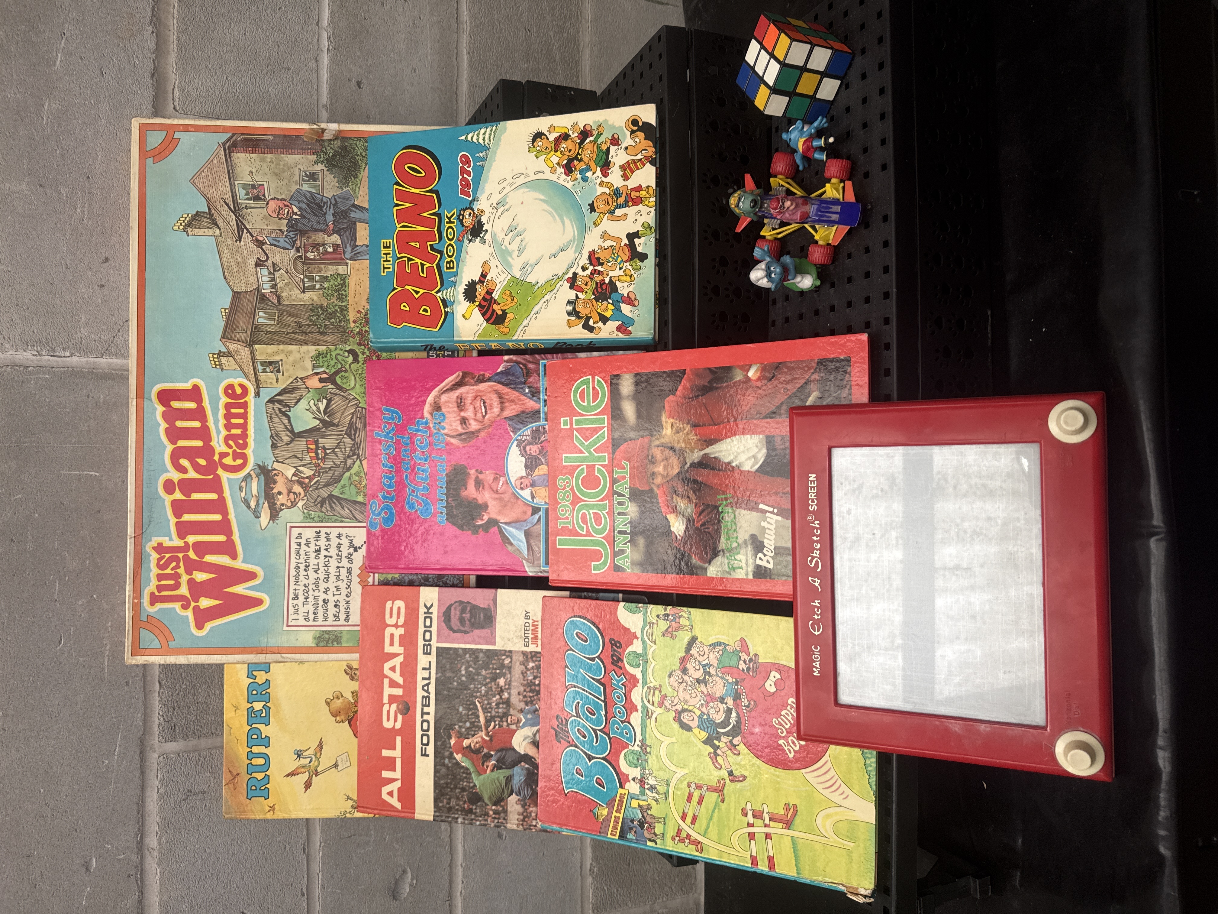 This collection comprises an assortment of children’s toys and hardback annuals primarily from the 1970s and 1980s. The group features an Ohio Art Company No. 505 Etch A Sketch Magic Screen in a red plastic housing. Also included is a Just William Game board game by Palitoy, Bradgate division, dated 1976, which was based on the London Weekend Television series. The selection of books includes The Beano Book for 1978 and 1979, the Starsky and Hutch Annual 1978, the Jackie Annual 1983, an All Stars Football Book, and a Rupert annual. Completing the collection are various small toys, including a Rubik’s cube, plastic Smurf figurines, and a stylized toy racing car.