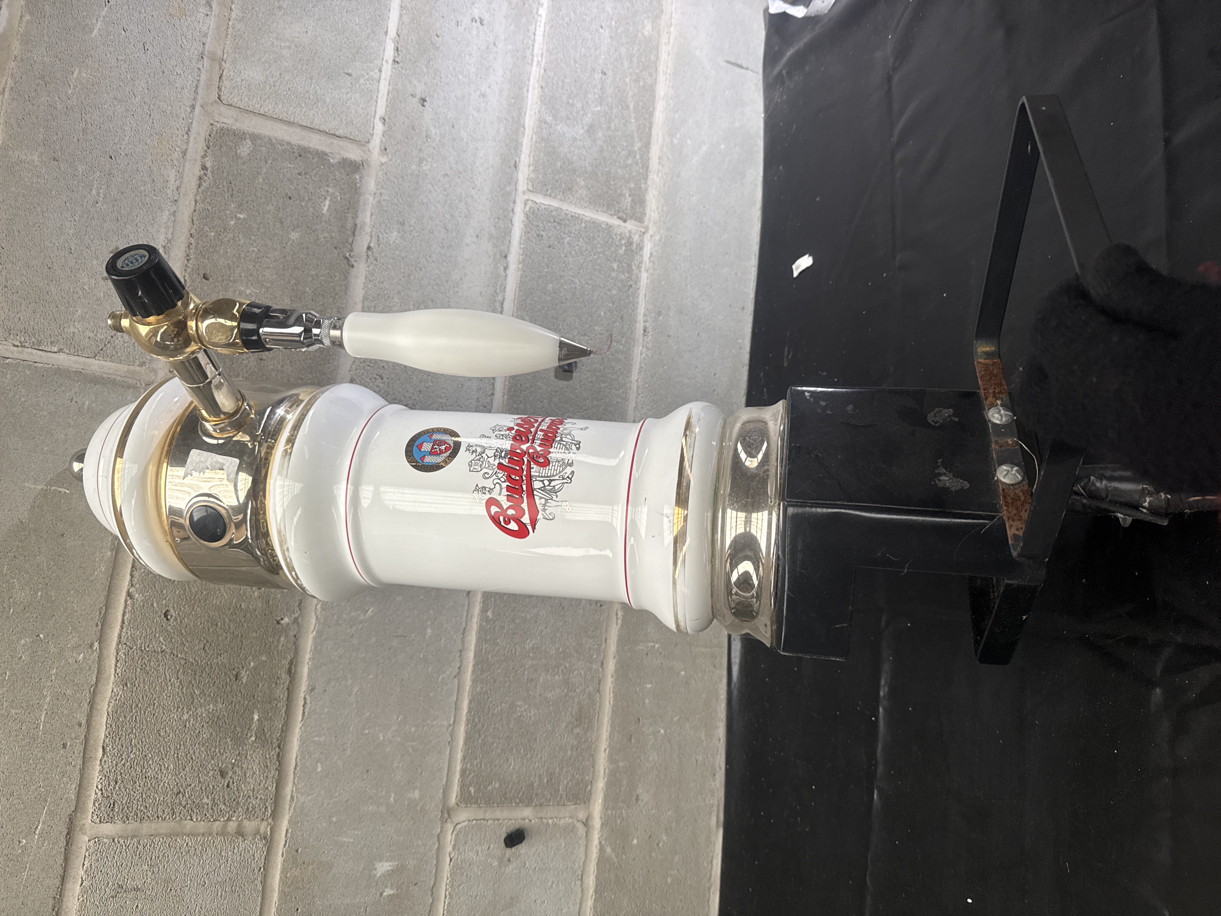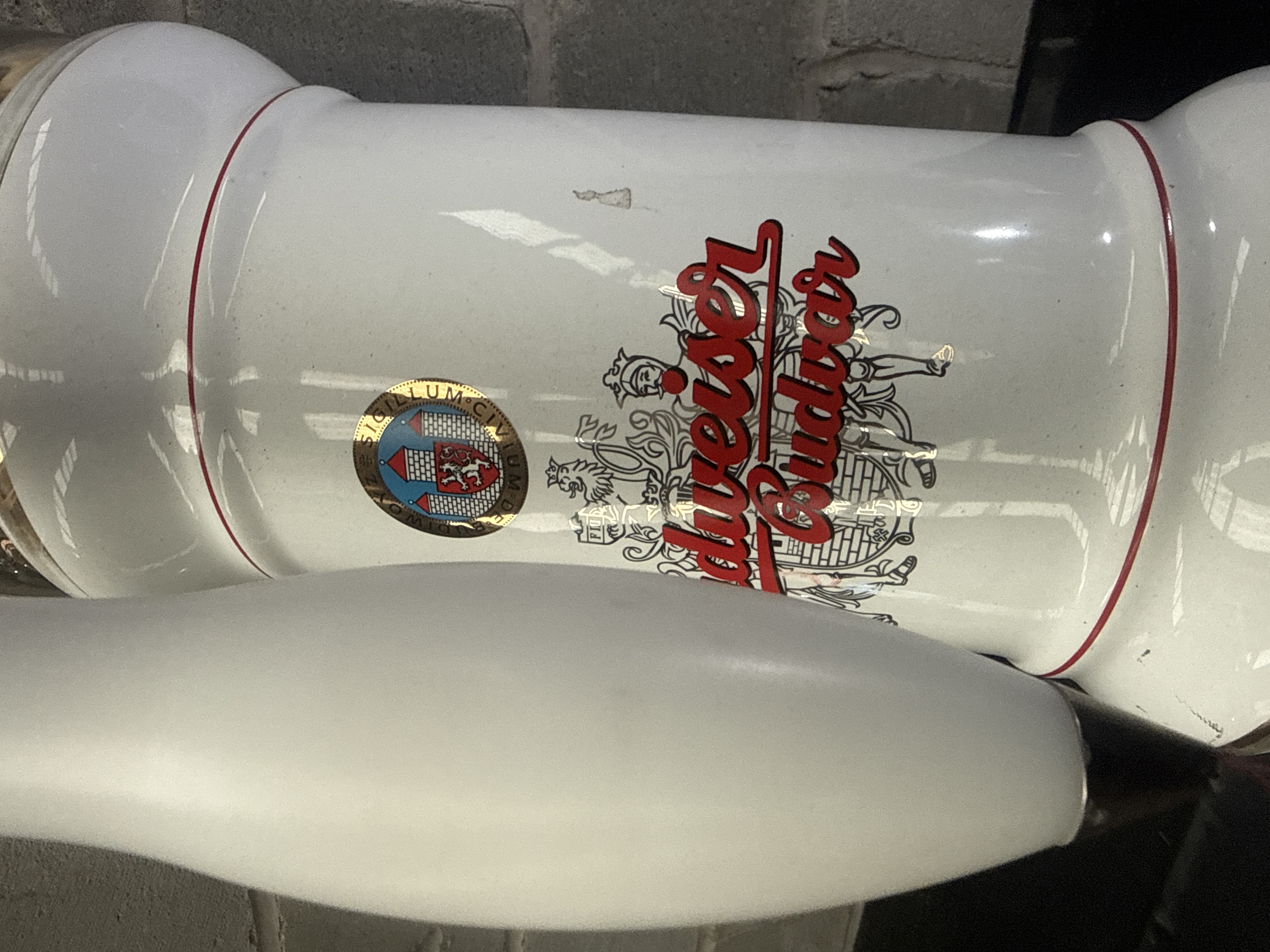 A commercial Budweiser Budvar draught beer tap font featuring a cylindrical white glazed ceramic body. The central column is decorated with the Budweiser Budvar red script logo and a circular seal for the city of Ceske Budejovice inscribed SIGILLUM CIVIUM DE BUDWEIS. The unit is constructed with gold-tone and chrome-tone metal accents and is equipped with a single metal faucet assembly capped with a white tapered handle. The tower is attached to a black metal mounting bracket designed for bar-top installation.