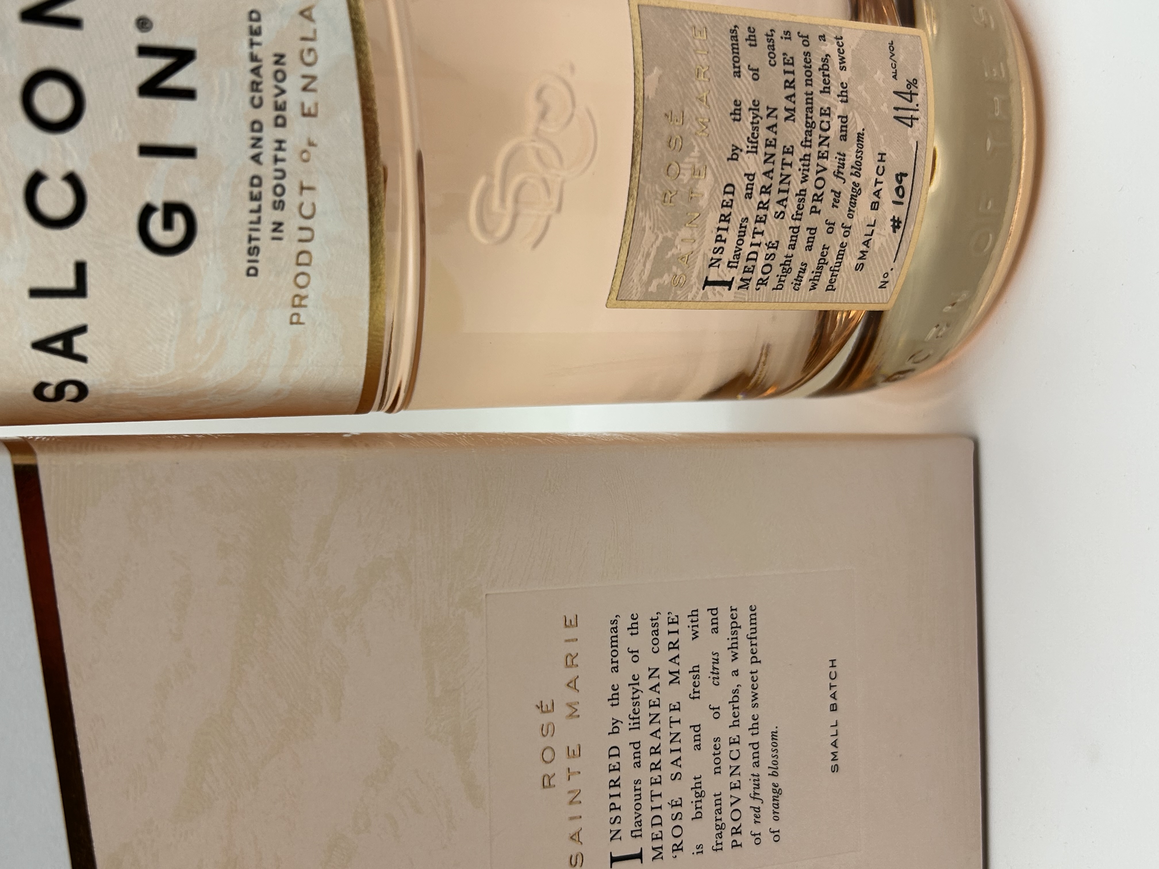 A bottle of Salcombe Gin Rose Sainte Marie, distilled and crafted in South Devon, England. The clear glass bottle contains a pale pink spirit and features a cream and copper-foil label. The labeling identifies the product as an exceptional dry rose gin, small batch number 109, with an alcohol by volume of 41.4 percent. The bottle features an embossed logo on the glass and is sealed with a copper-colored cap and a tamper-evident strip. It is housed in its original cardboard presentation box with matching copper-foil detailing and descriptive text.