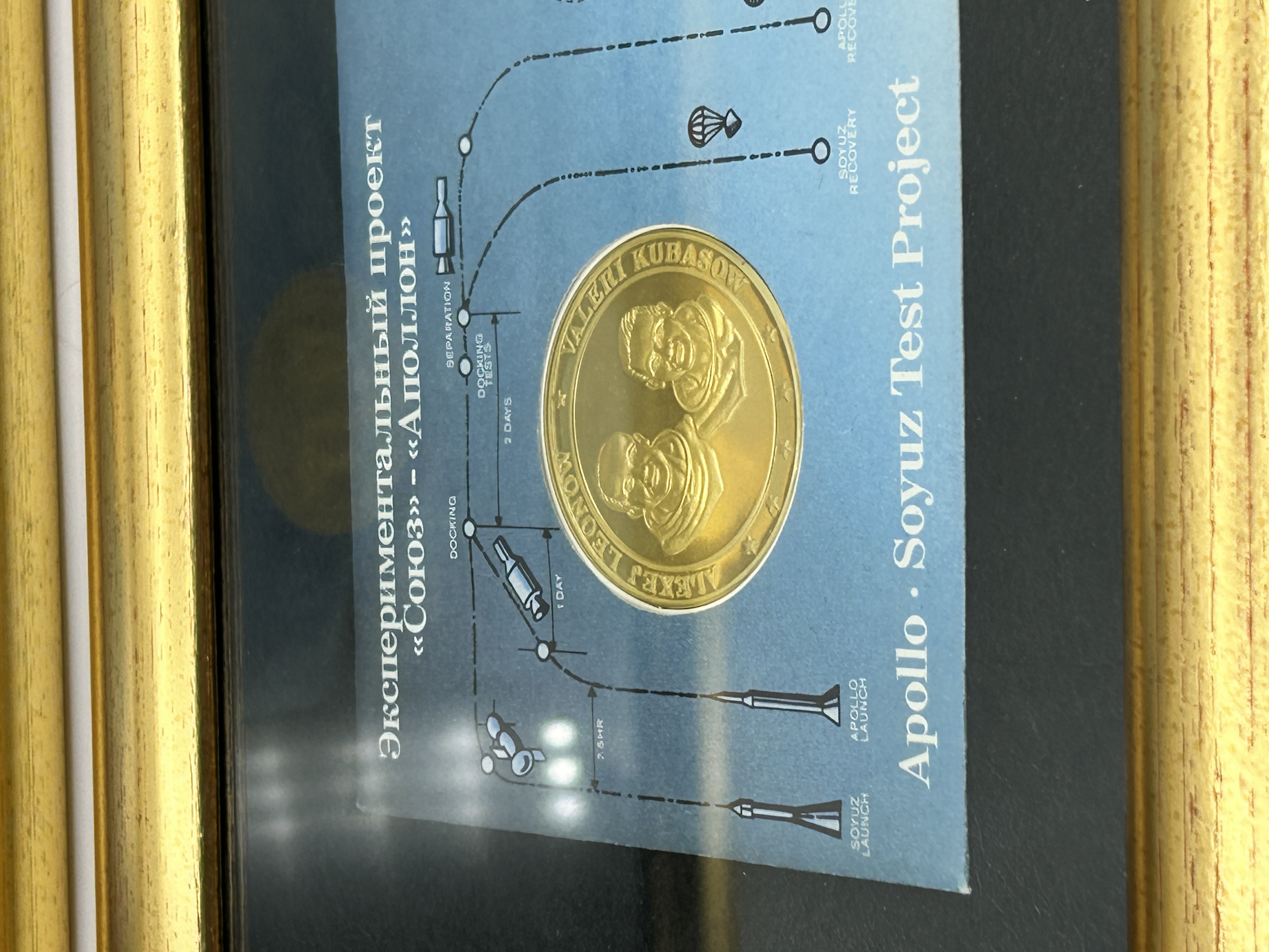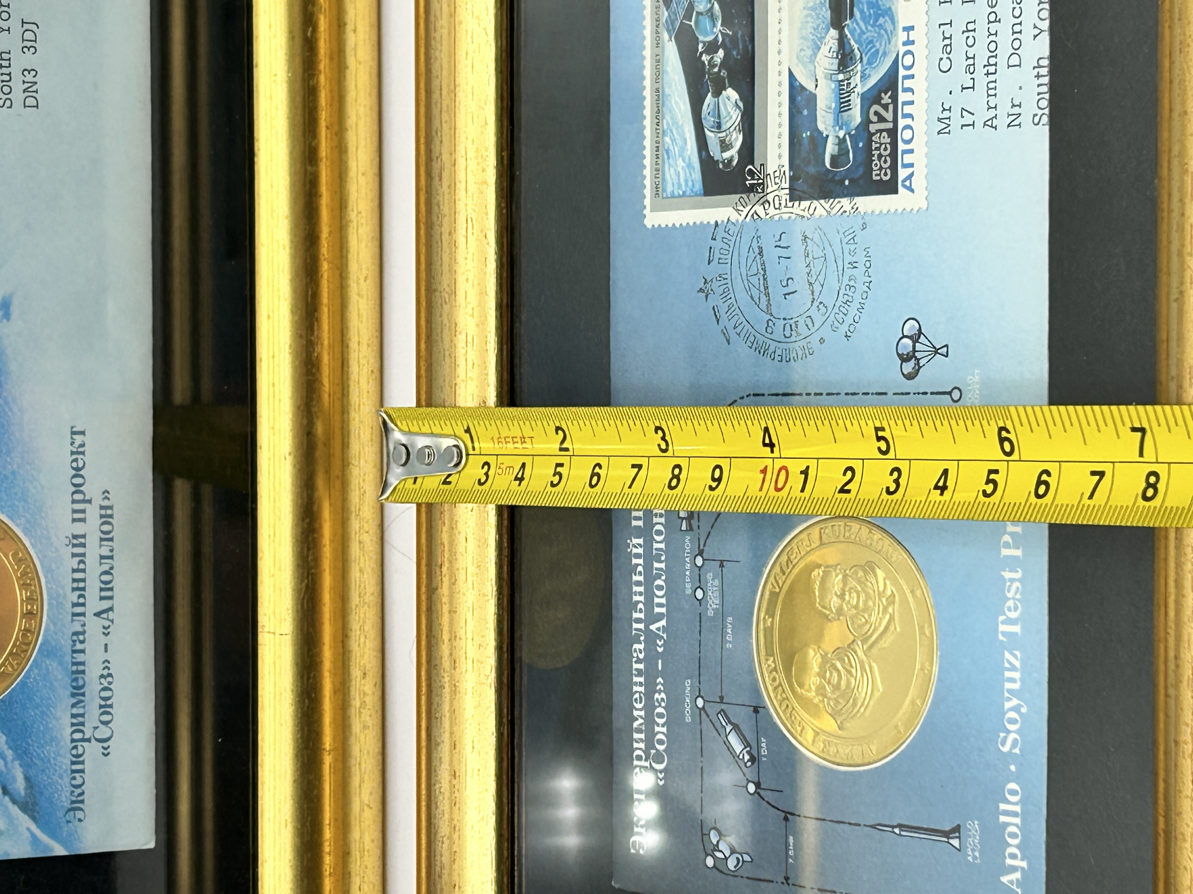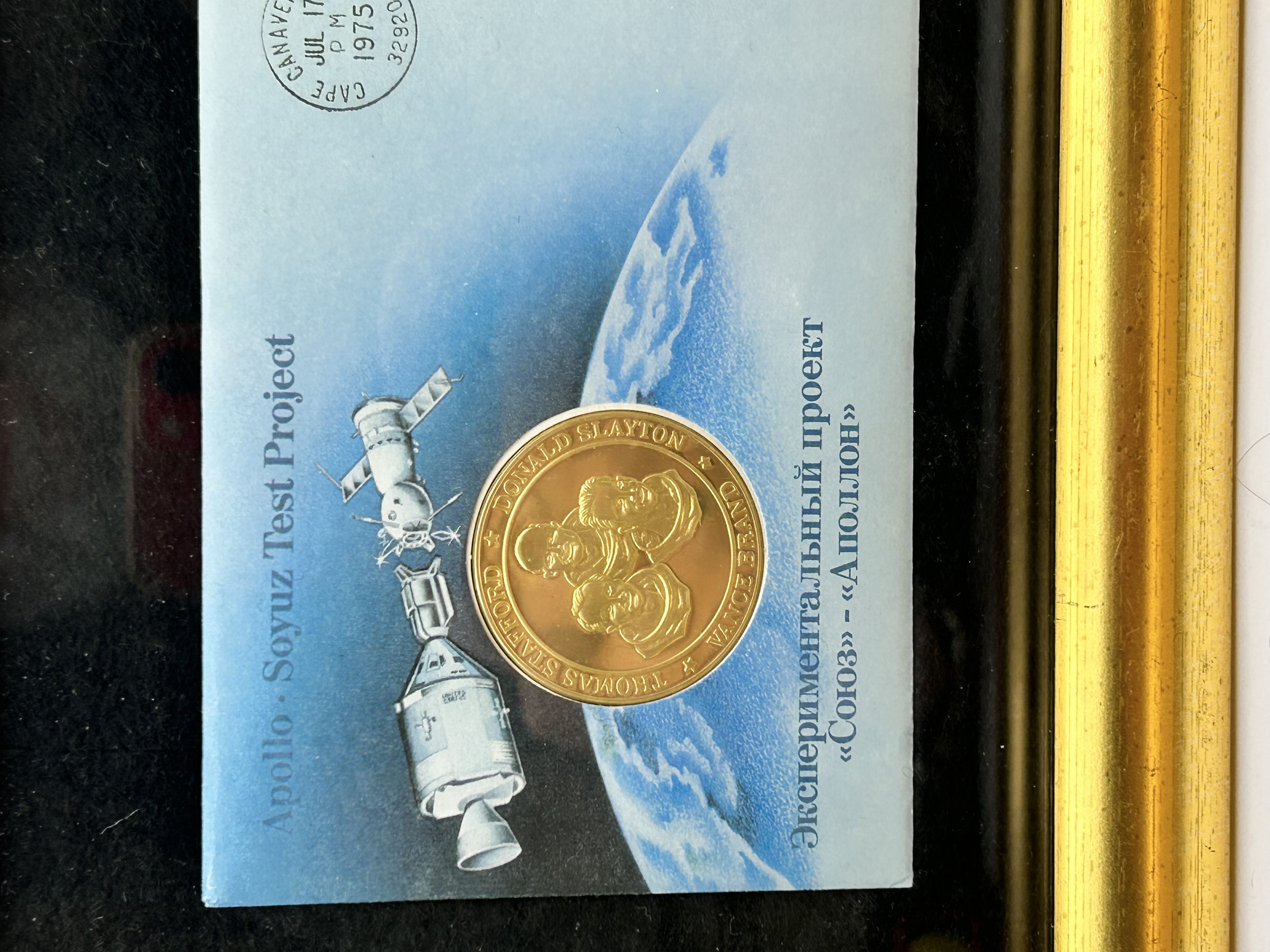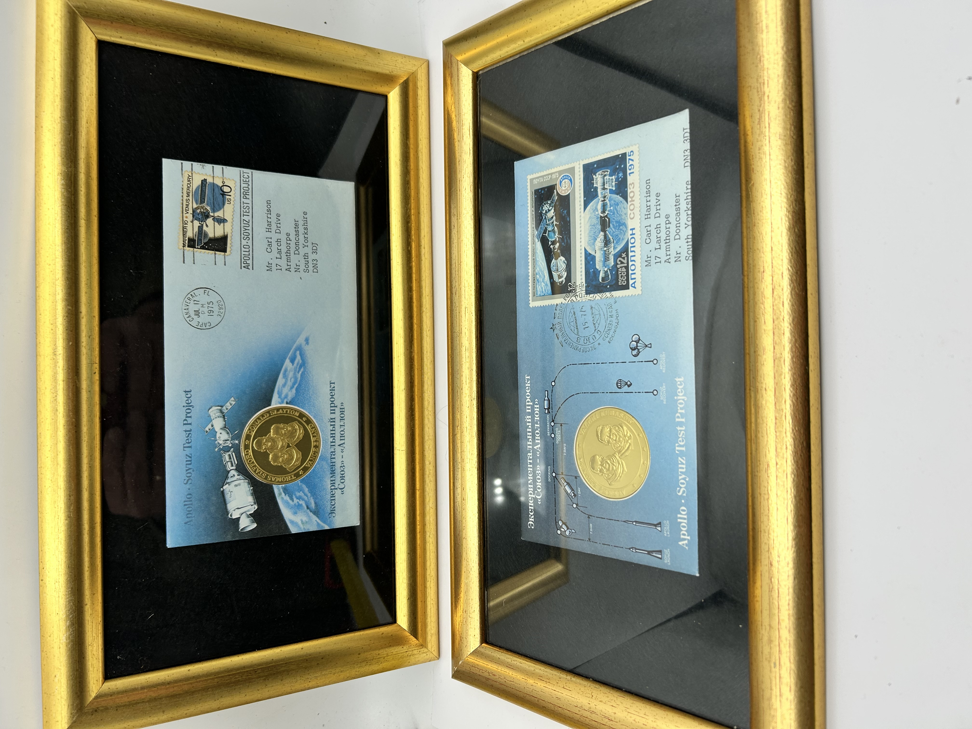 A pair of commemorative philatelic and numismatic displays produced by the Franklin Mint for the 1975 Apollo-Soyuz Test Project. One display features a US-postmarked envelope from Cape Canaveral dated July 17, 1975, with a Mariner 10 stamp and a gold-plated sterling silver medallion depicting astronauts Thomas Stafford, Donald Slayton, and Vance Brand. The second display includes a Soviet-postmarked envelope with a Baikonur cancellation dated July 15, 1975, two 12k USSR stamps, and a gold-plated sterling silver medallion featuring cosmonauts Alexey Leonov and Valeri Kubasov. Both envelopes are addressed to Mr. Carl Harrison in South Yorkshire, England, and include mission-related illustrations with bilingual text in English and Russian. The displays are housed in matching gold-finished frames with black matting.