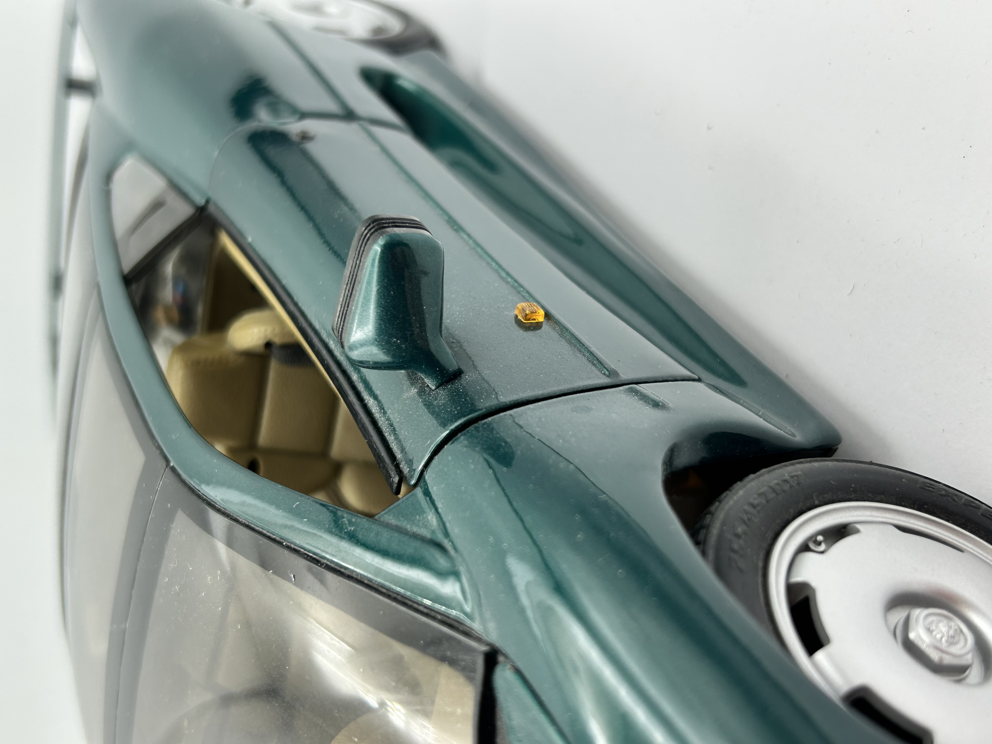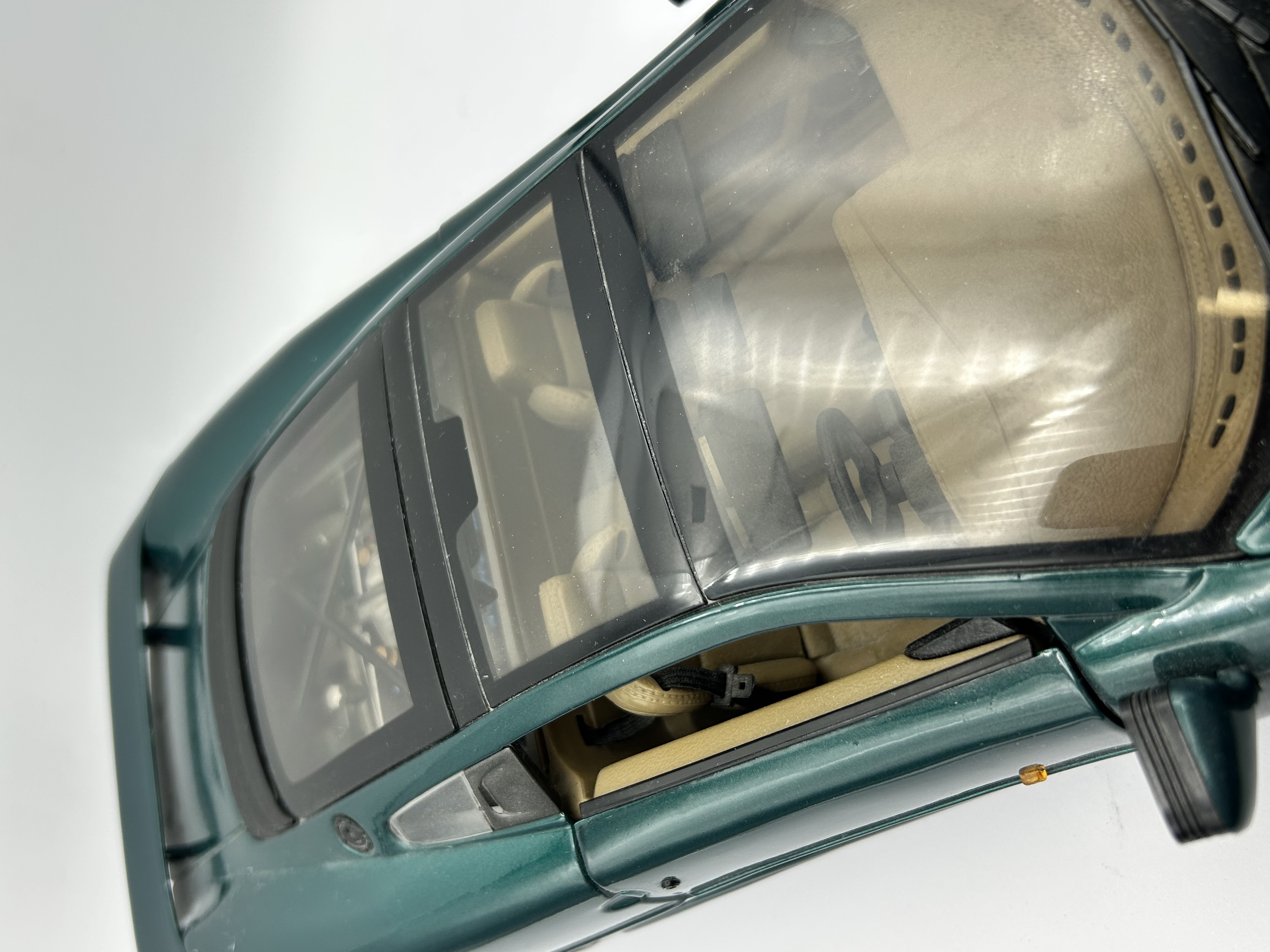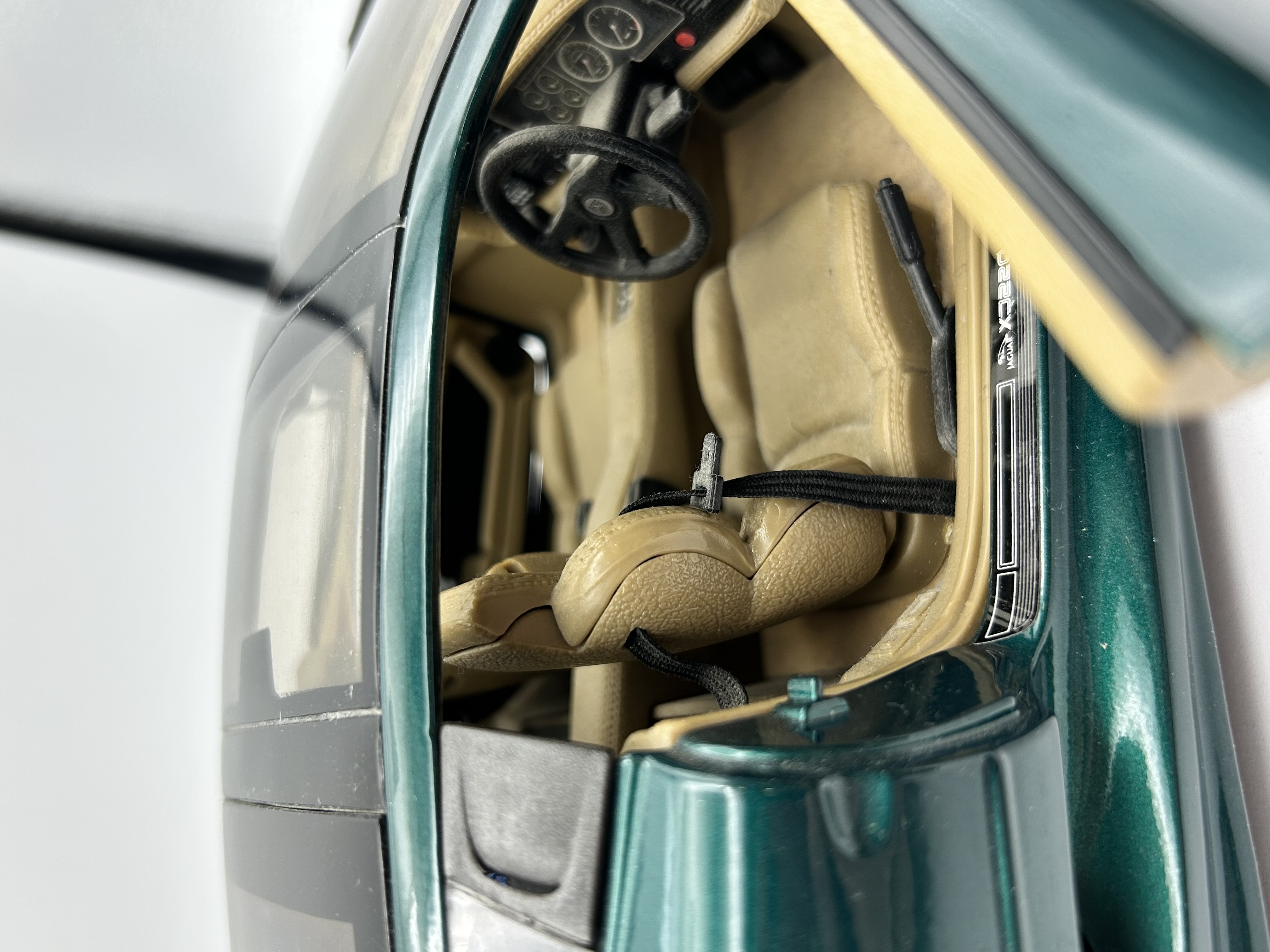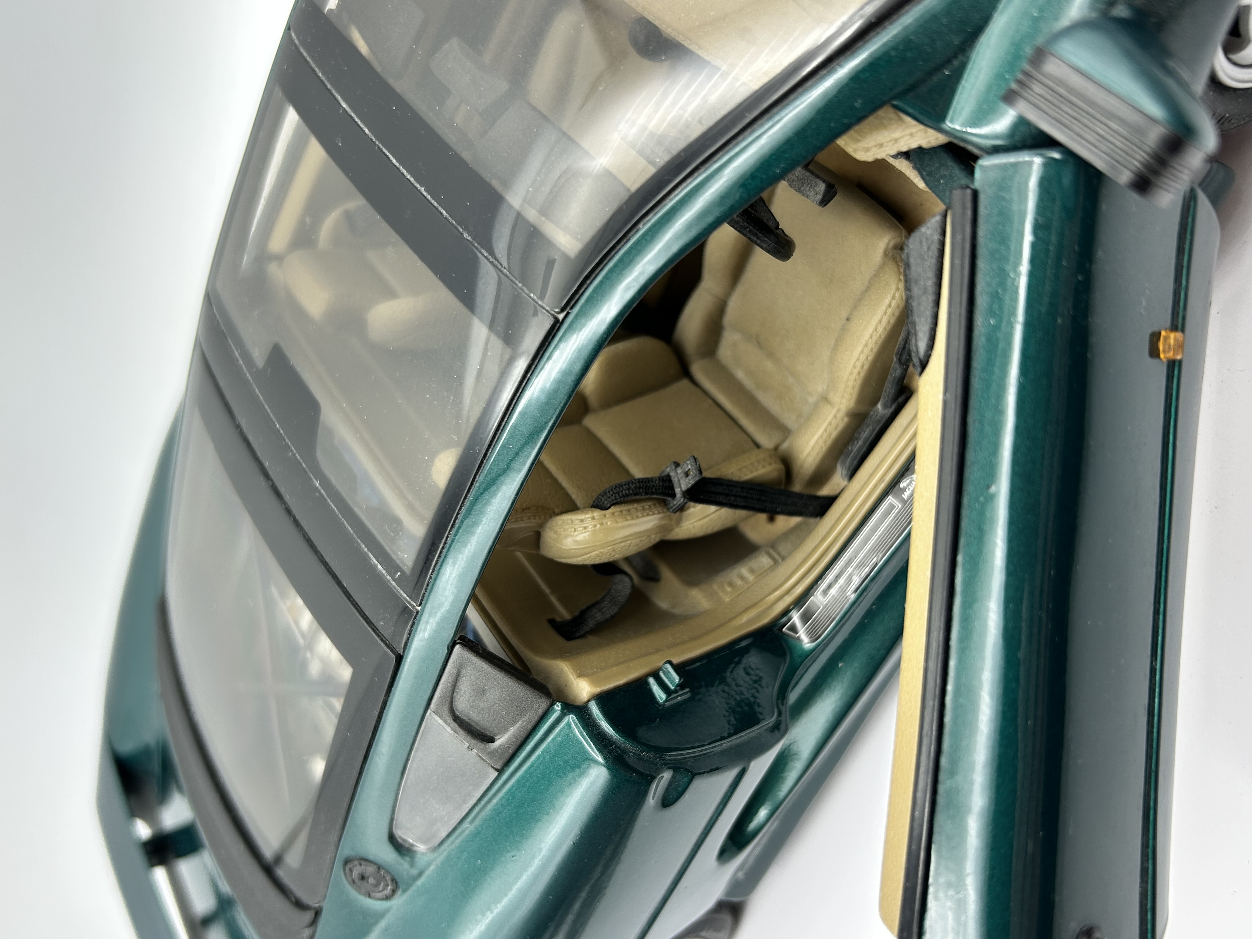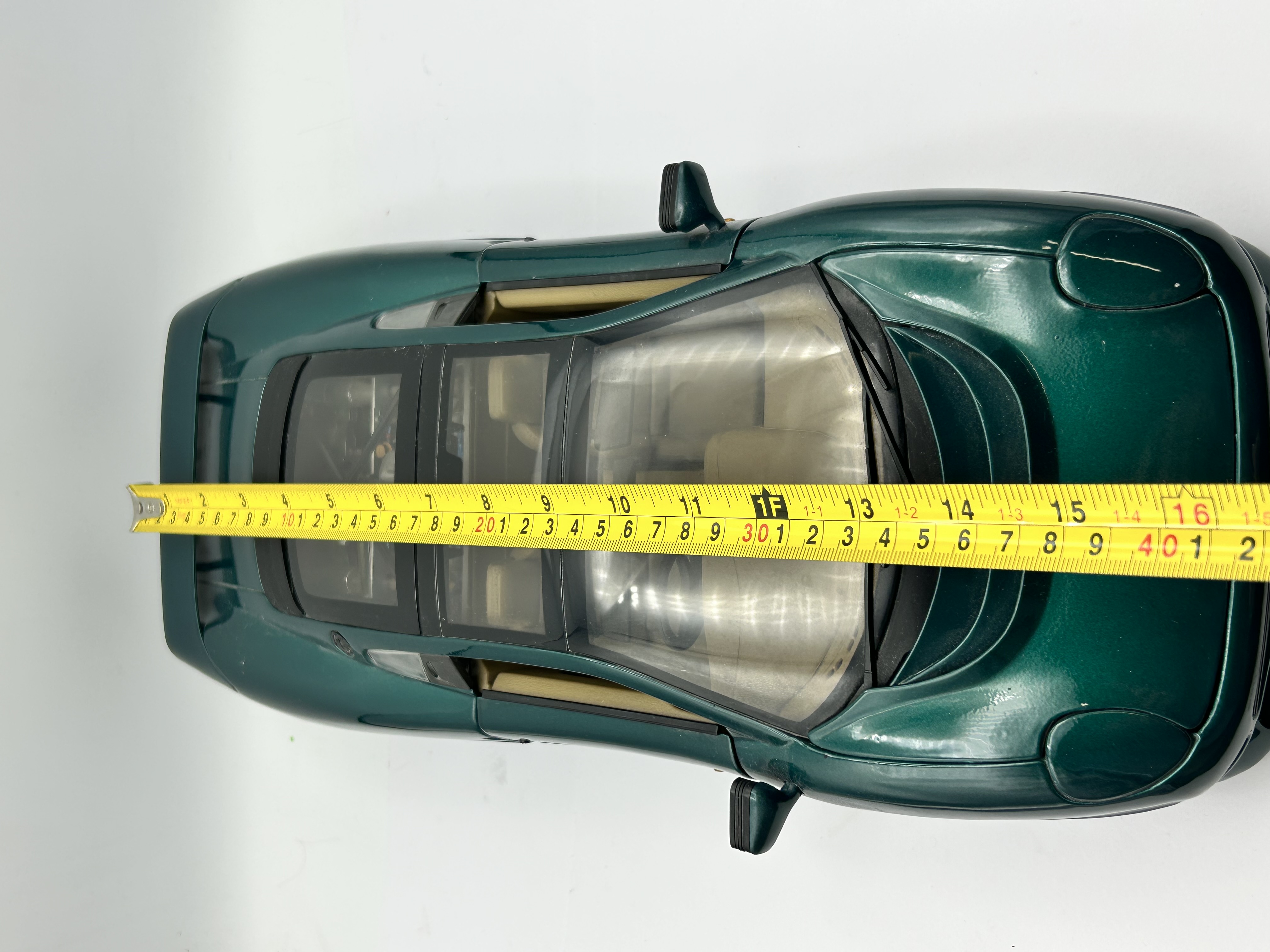A large-scale die-cast model of a Jaguar XJ220 produced by Maisto. The vehicle is finished in metallic British Racing Green with a contrasting tan interior. The model features opening doors that reveal a detailed cockpit including a steering wheel, dashboard instrumentation, and fabric seatbelts. Exterior details include side mirrors, windshield wipers, and alloy-style wheels with the Jaguar logo. The interior door sill features the text JAGUAR XJ220.
