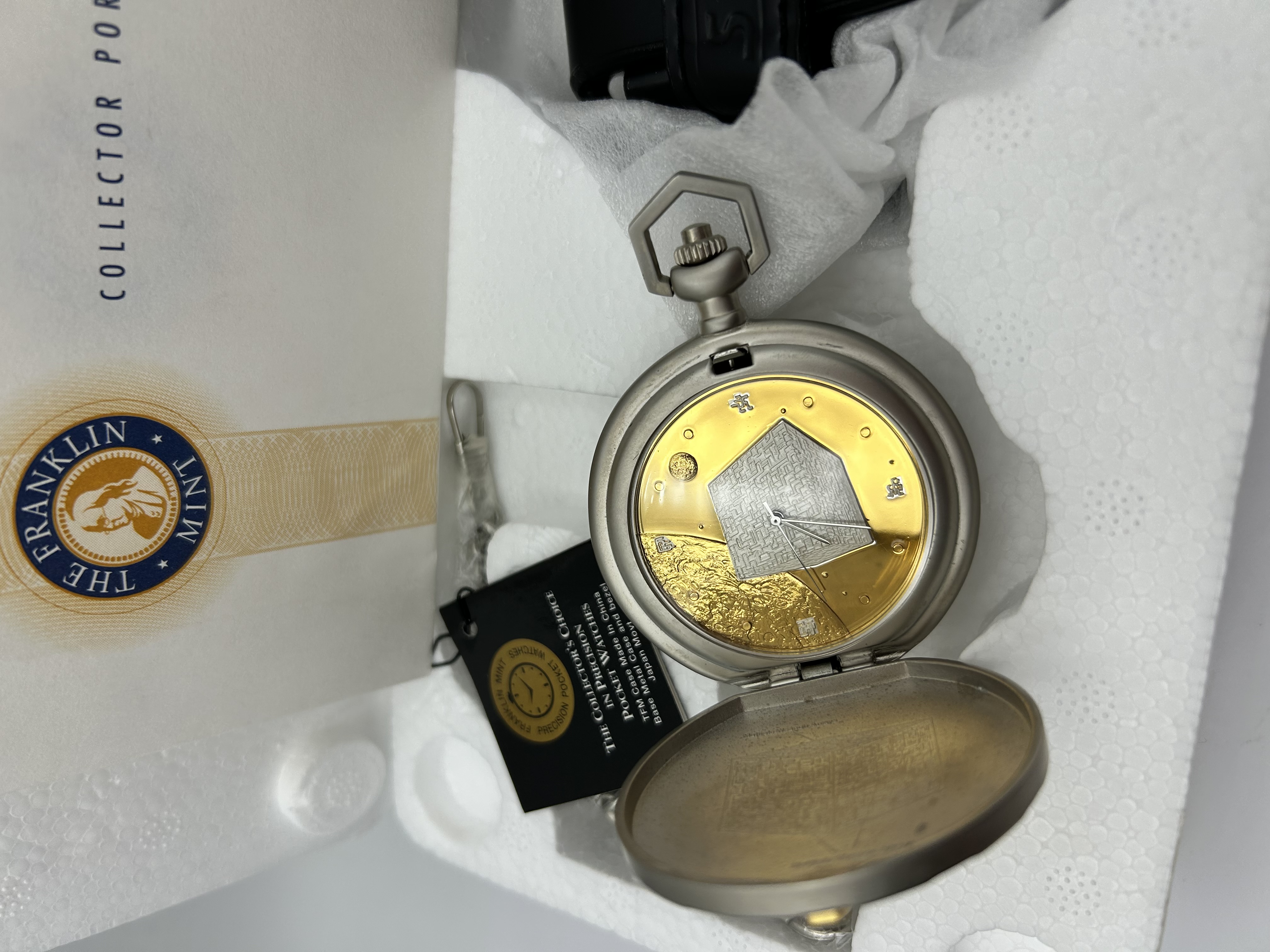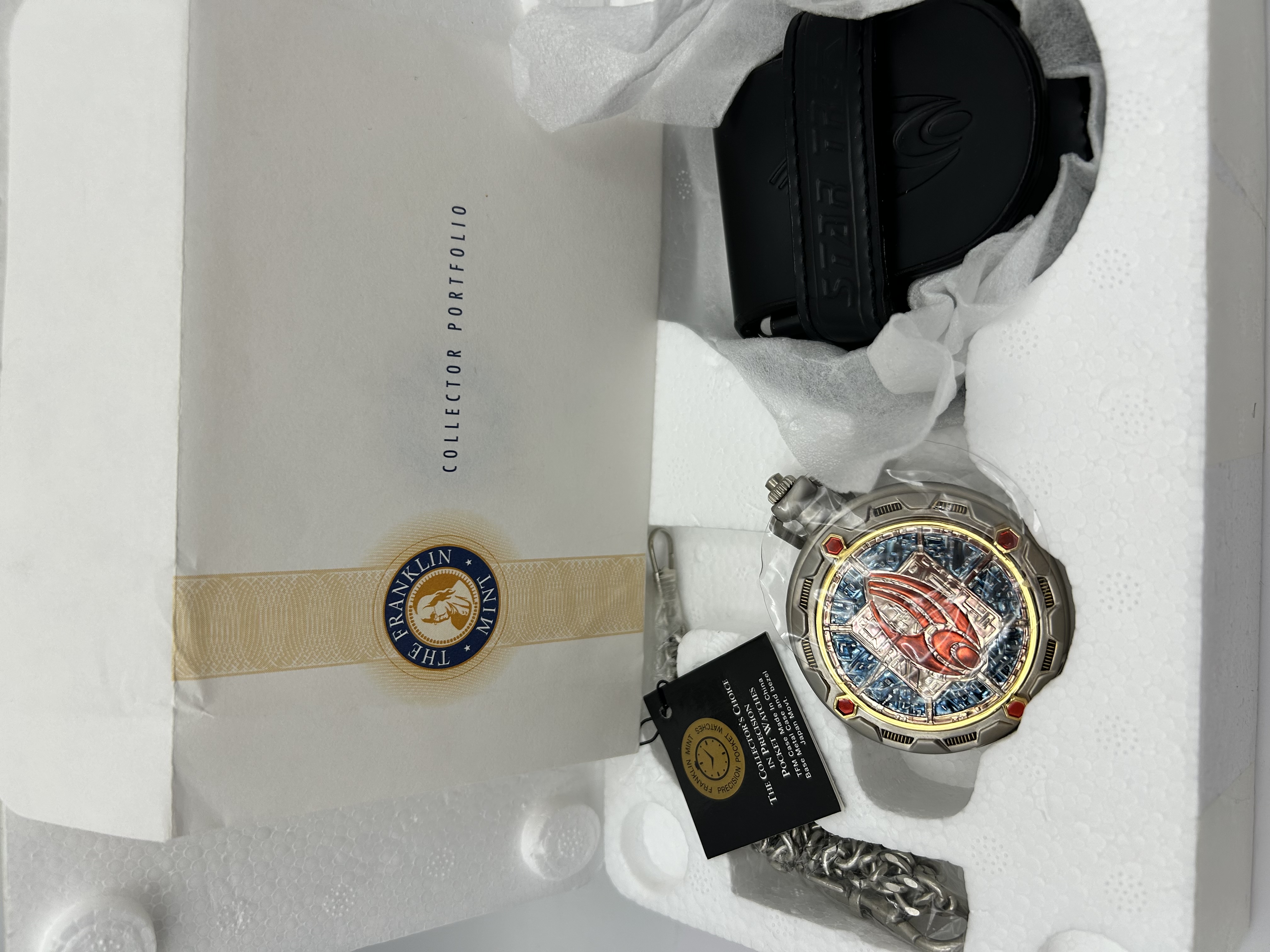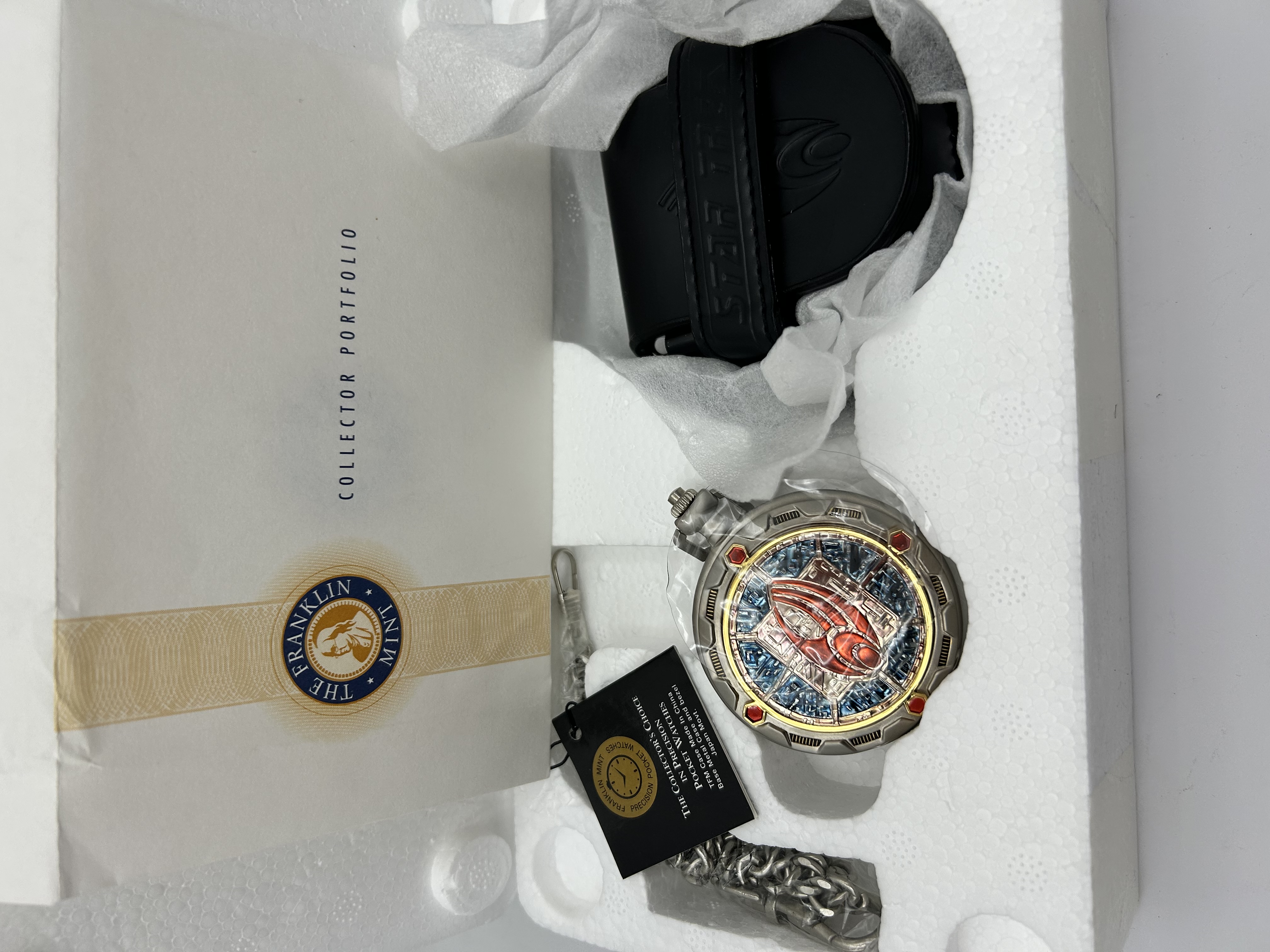 A Franklin Mint Star Trek themed pocket watch featuring a Borg-inspired design. The timepiece is constructed with a base metal case in a matte silver-tone finish. The hinged front cover displays a red and blue enameled insignia set against a textured blue background. The internal dial features a gold-tone and silver-tone finish with a central geometric cube motif and celestial accents. The watch is equipped with a Japanese quartz movement. Included with the watch is a matching silver-tone chain, a black leatherette carrying pouch embossed with the Star Trek logo, and the original Franklin Mint Collector Portfolio packaging with molded Styrofoam interior. A certification tag is attached, noting the movement origin and case manufacture.