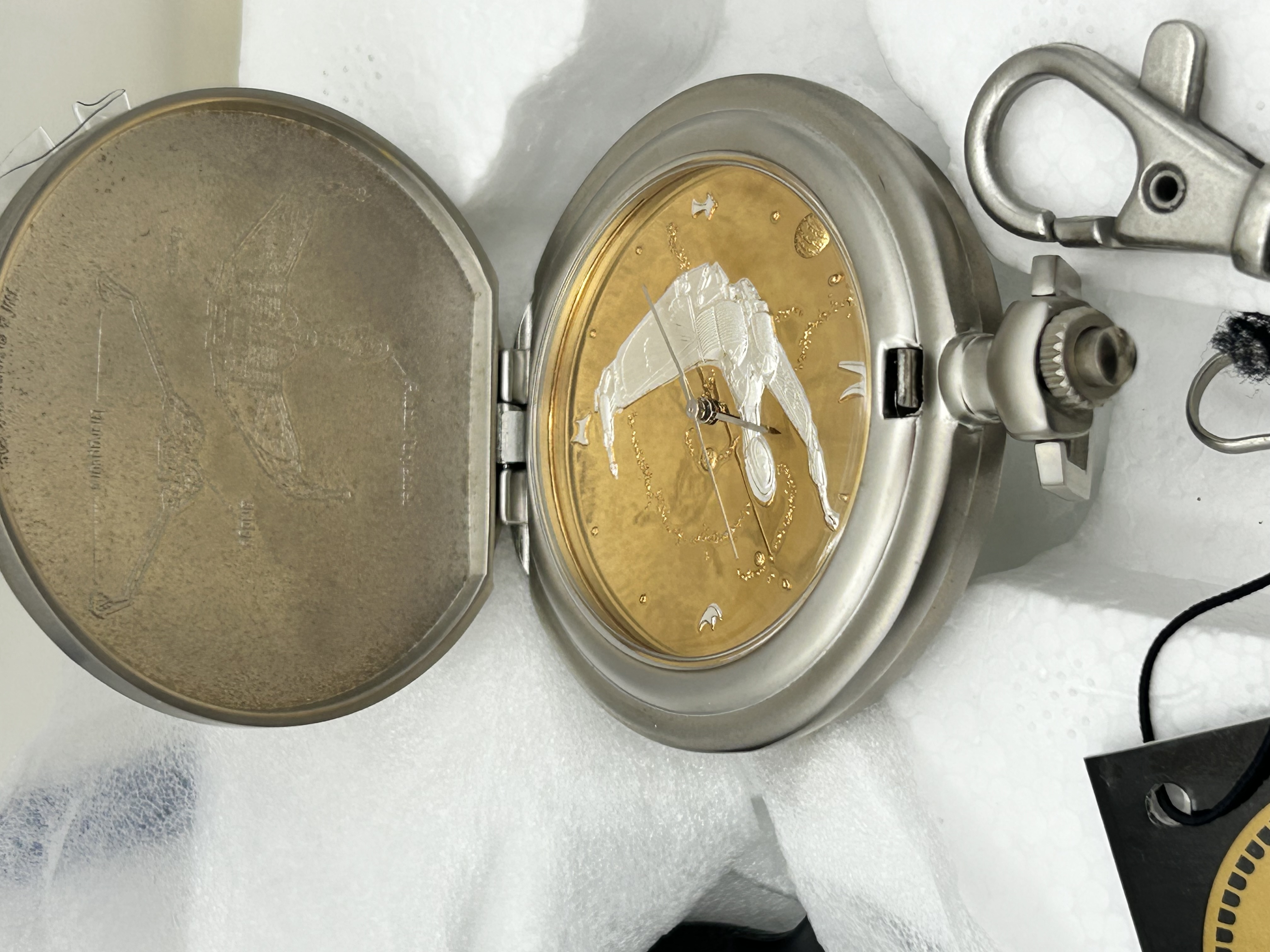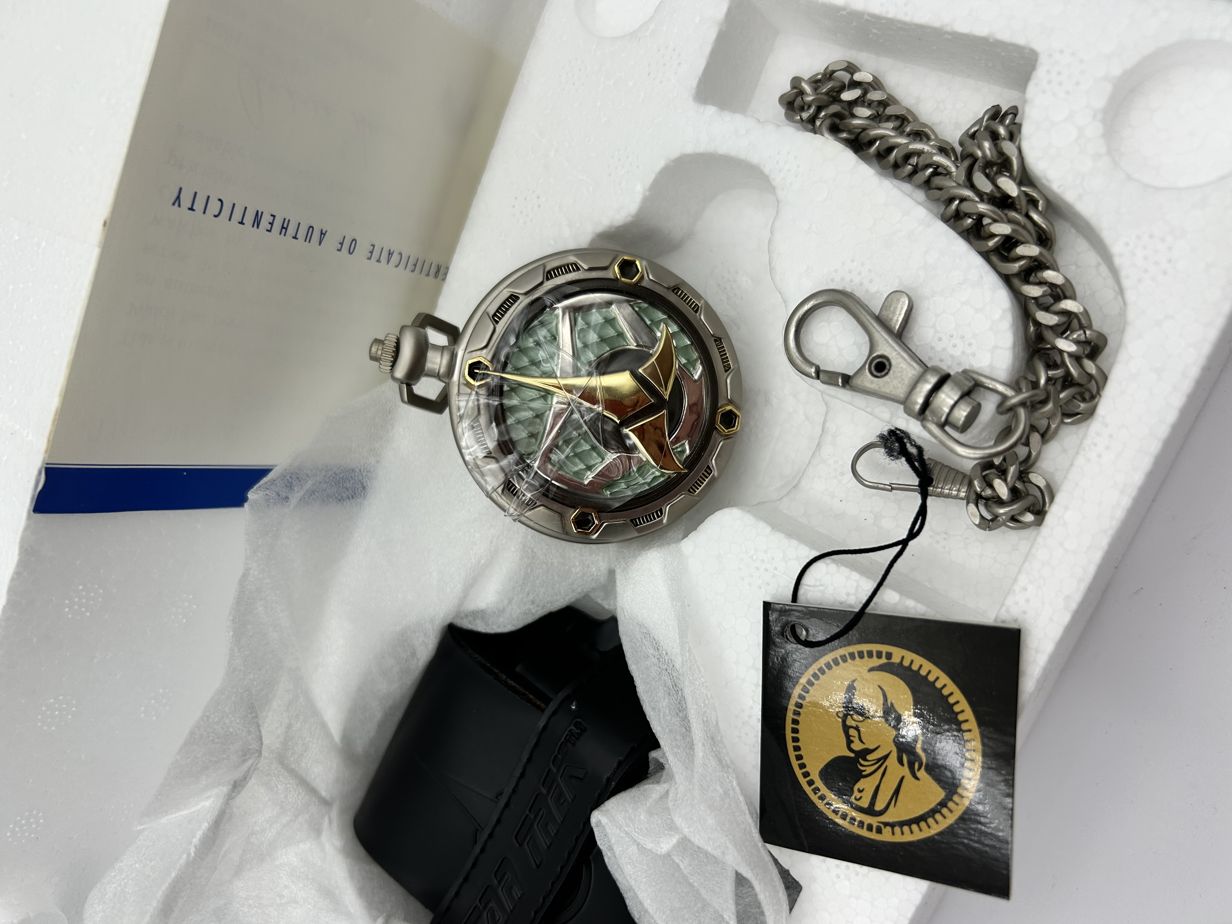 A Franklin Mint Star Trek Klingon Bird of Prey Official Collector’s Pocket Watch. The silver-tone metal case features a hinged front cover decorated with a multi-toned green and gold Klingon emblem, which retains its original protective plastic film. The interior reveals a gold-toned watch face with a raised silver-tone relief of a Klingon Bird-of-Prey ship. The inner lid is etched with a technical diagram of the starship and accompanying labels. The watch is accompanied by a matching heavy-link metal chain with a swivel lobster clasp. The set includes a black leatherette carrying pouch embossed with STAR TREK, a Certificate of Authenticity, and a Franklin Mint hangtag. The items are housed in the original foam packaging.