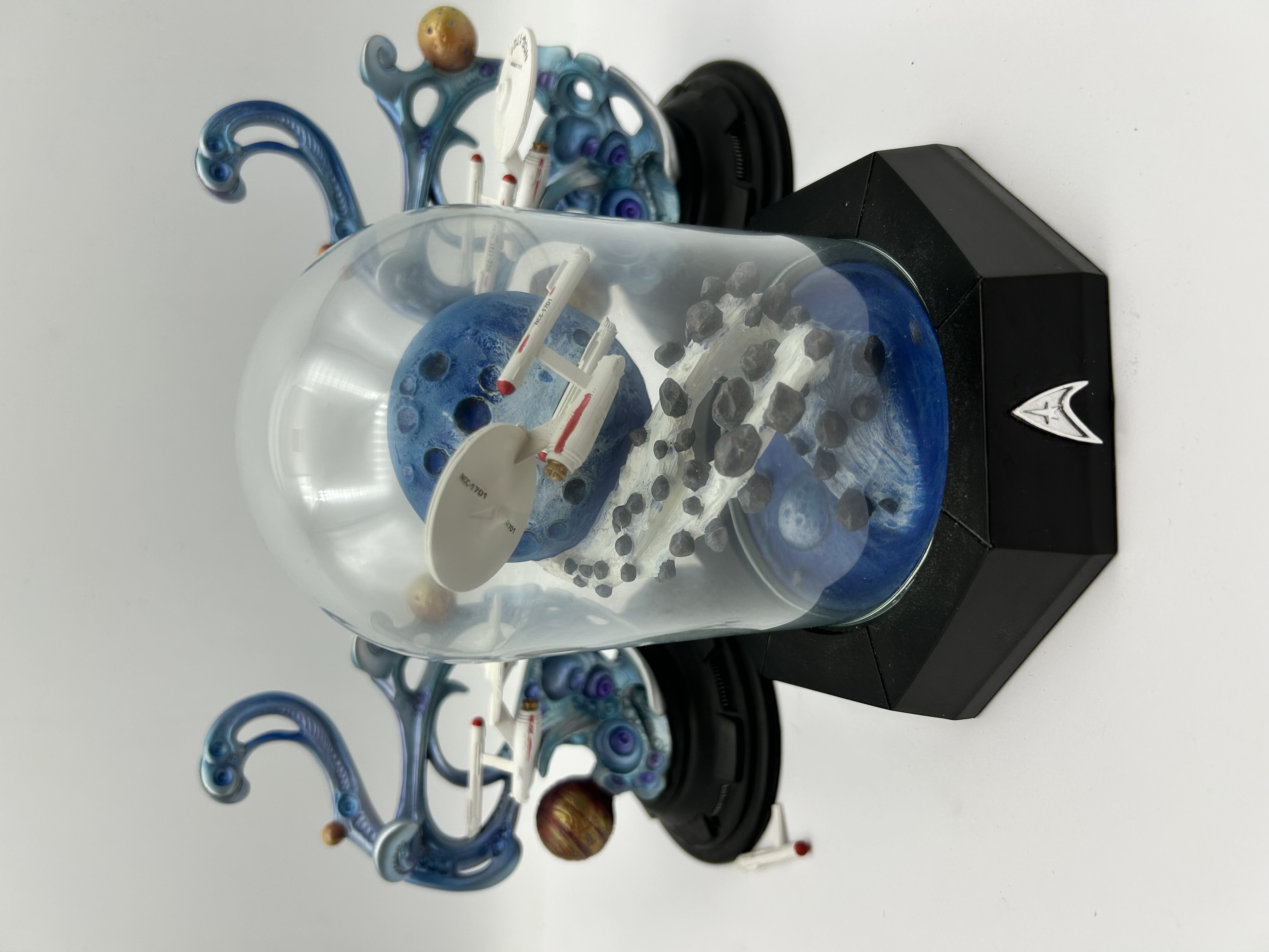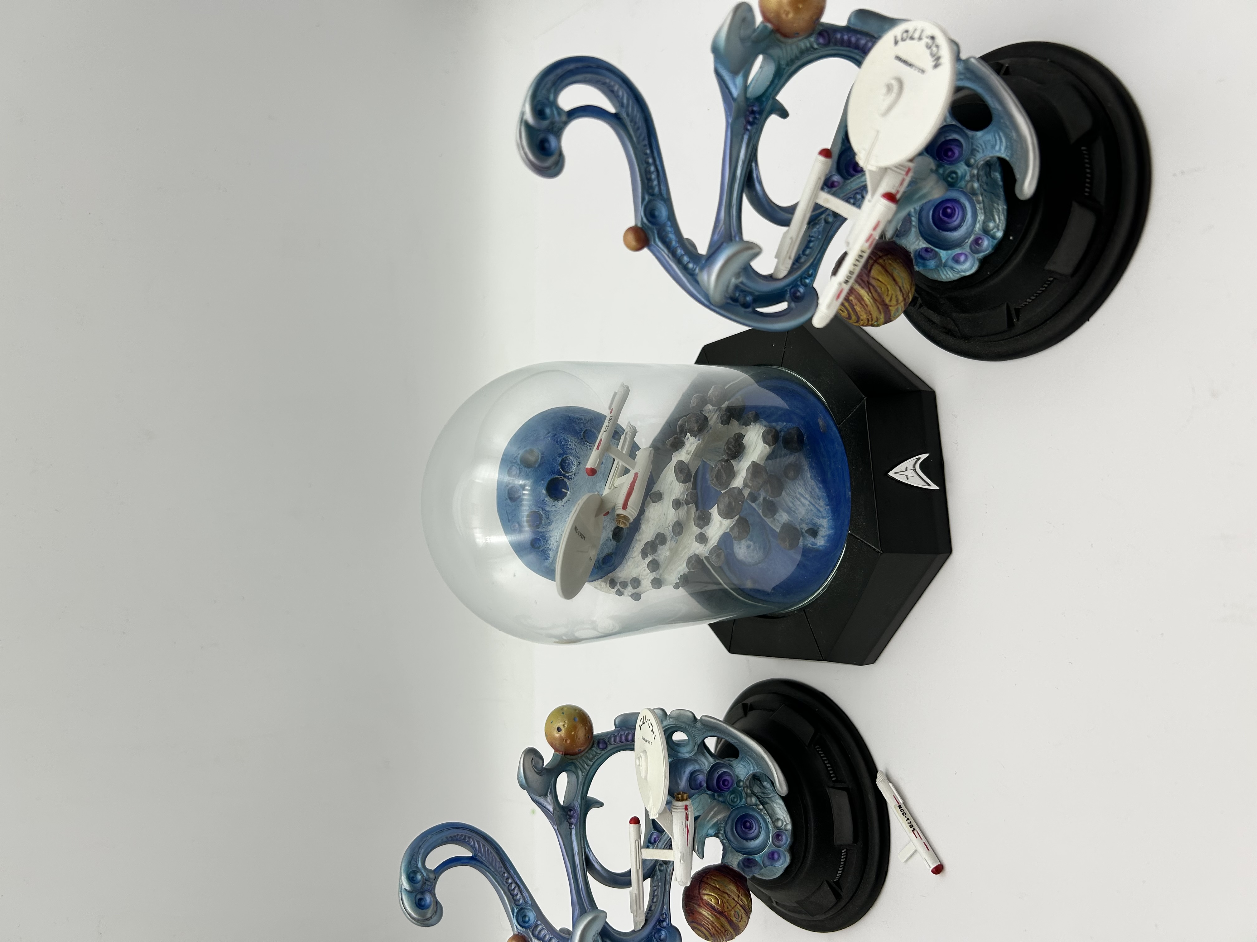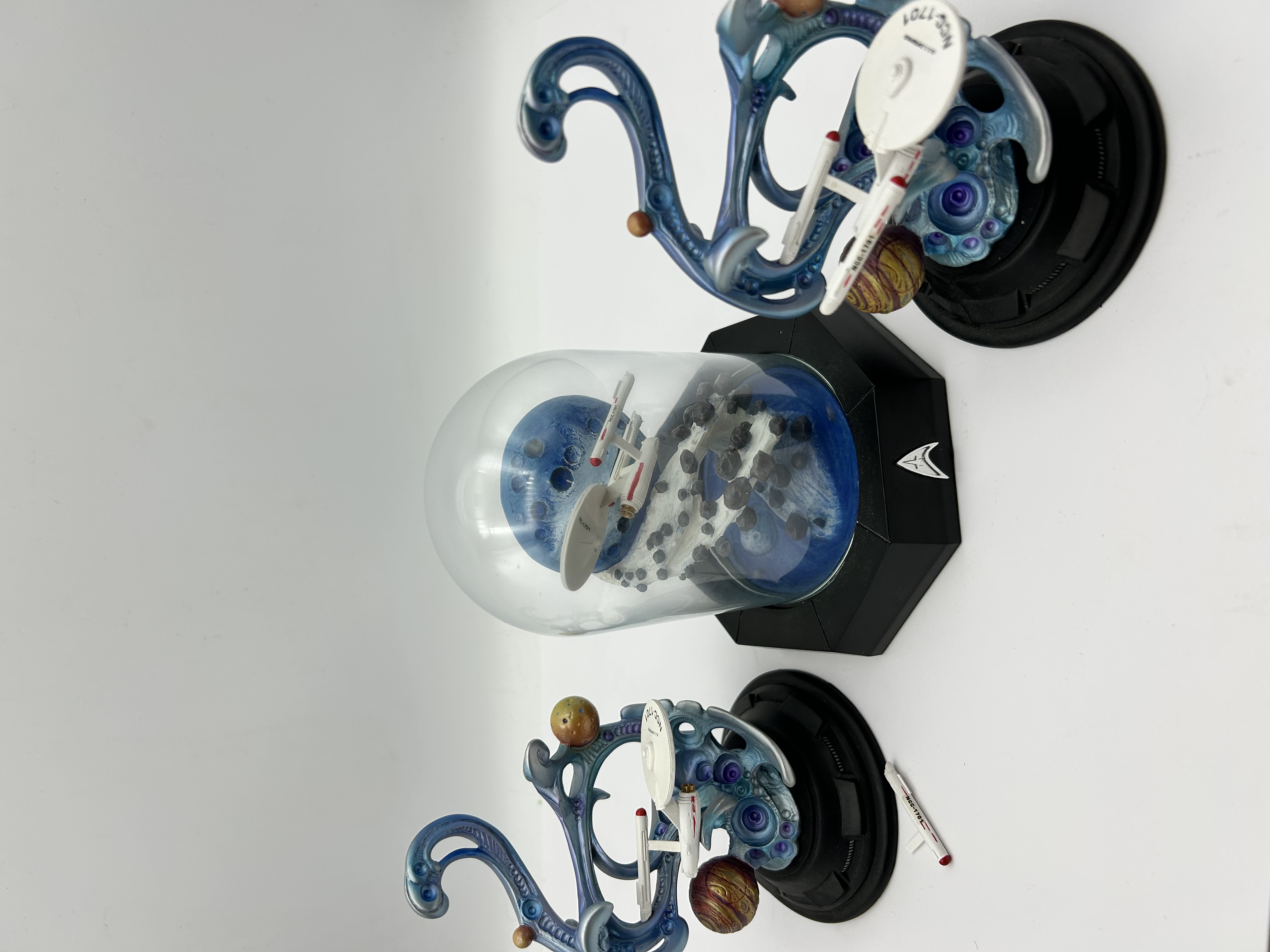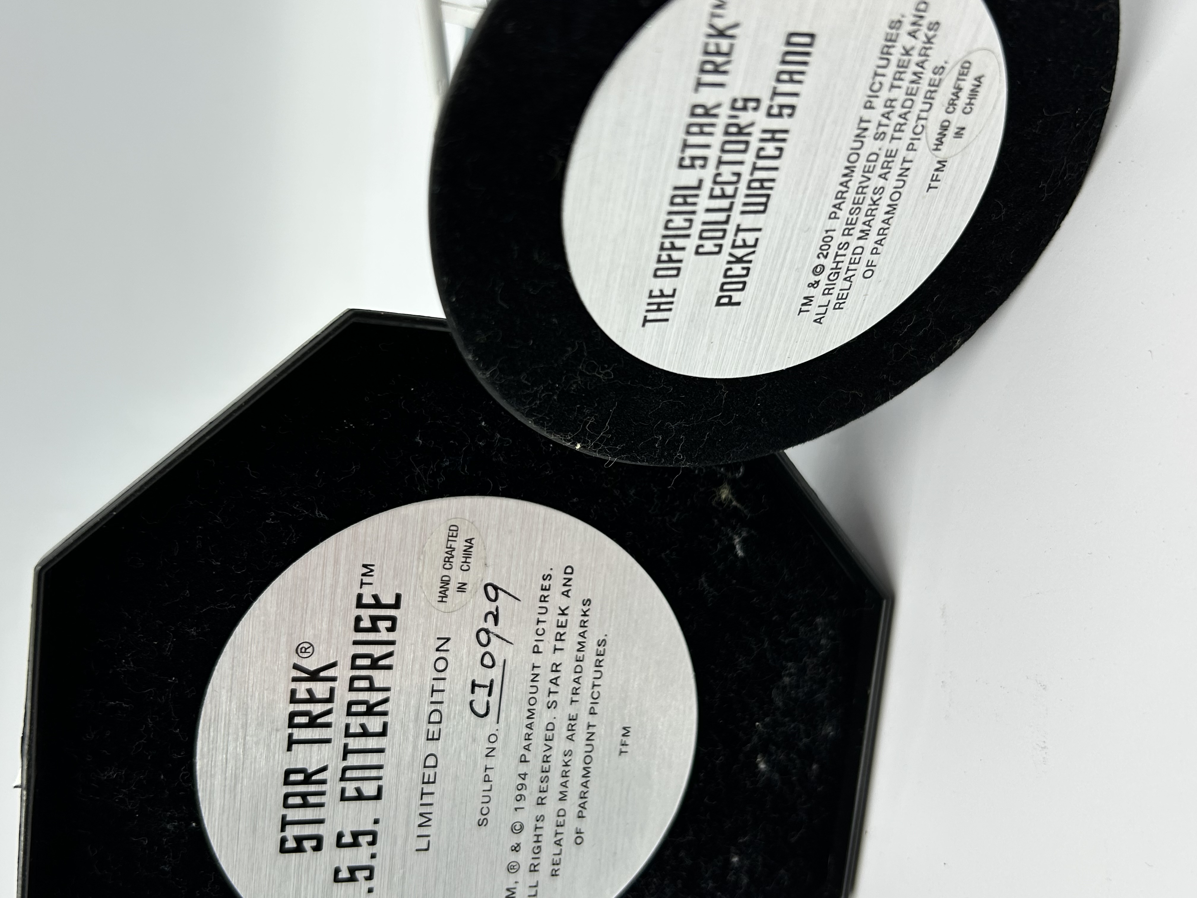 A trio of Franklin Mint Star Trek collectibles featuring the U.S.S. Enterprise NCC-1701. This lot includes a 1994 limited edition diorama sculpture housed within a clear glass dome, depicting the starship over a planetary landscape and asteroid field. The dome is set upon a black hexagonal base featuring a silver-tone Starfleet insignia. The underside is marked with the edition number CI 0929 and identifies the piece as a 1994 Franklin Mint limited edition. Also included are two pocket watch stands from 2001, each featuring a miniature U.S.S. Enterprise mounted on a blue scrolled resin base with celestial decorations. These are marked on the underside as The Official Star Trek Collector’s Pocket Watch Stand by The Franklin Mint. The items are constructed from resin, plastic, and glass.